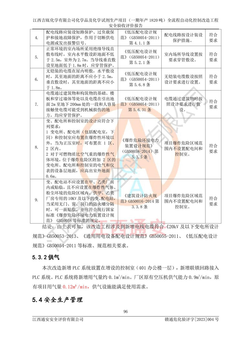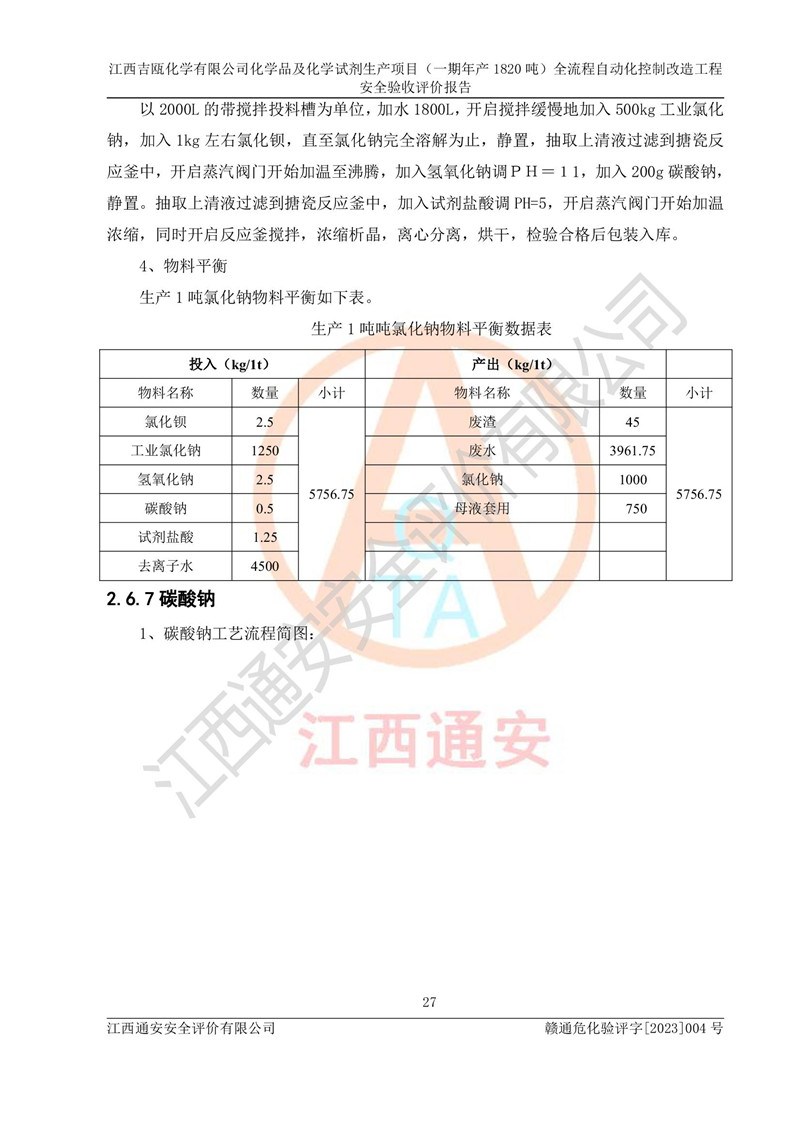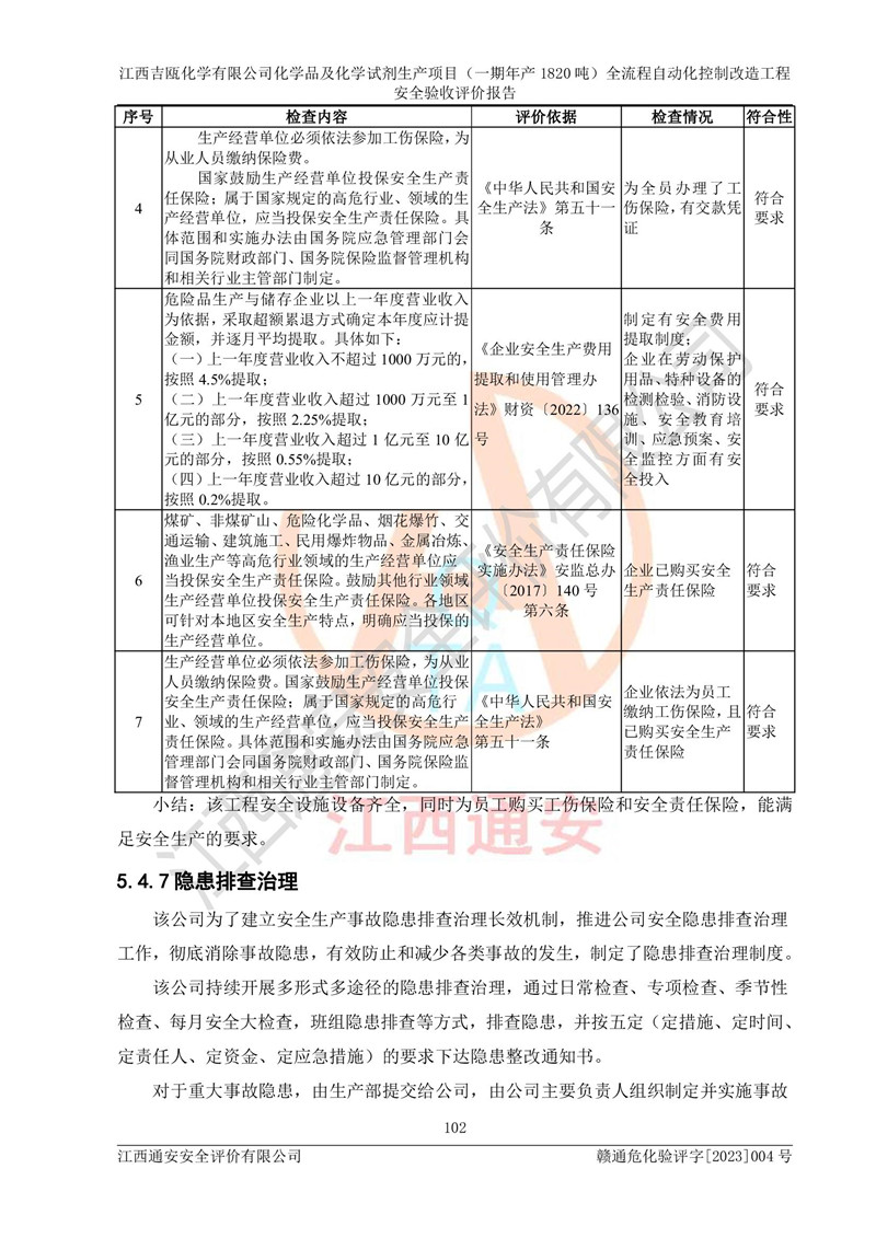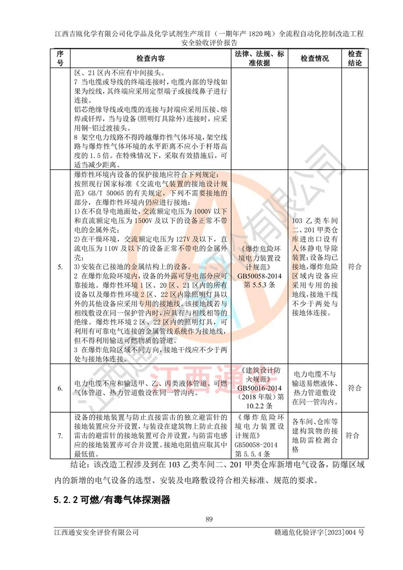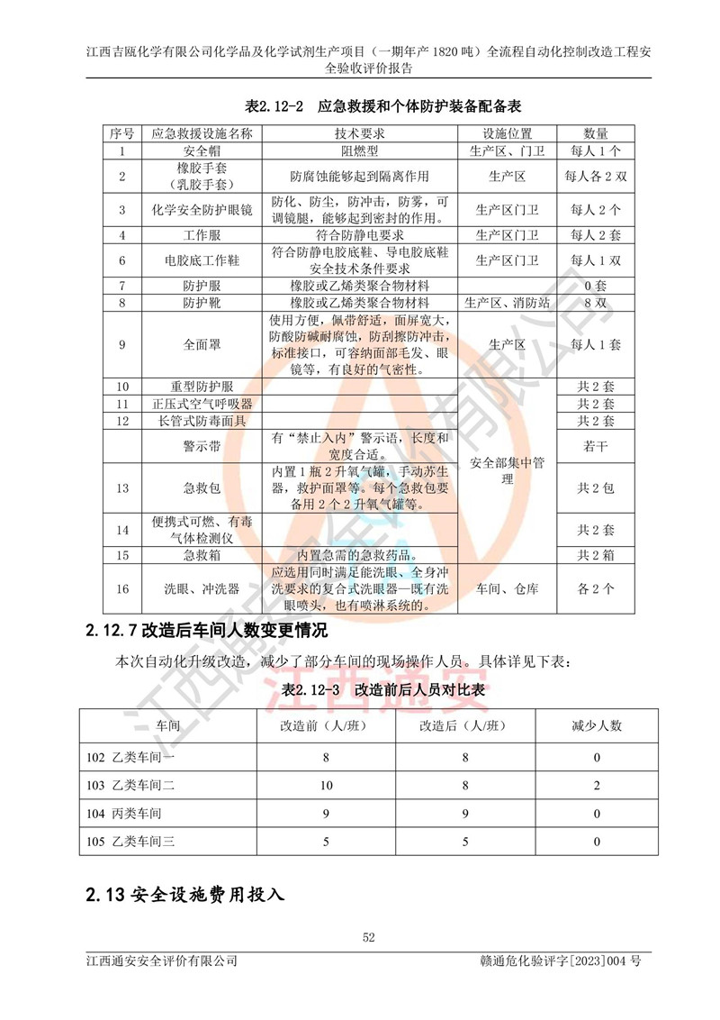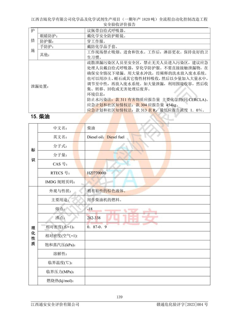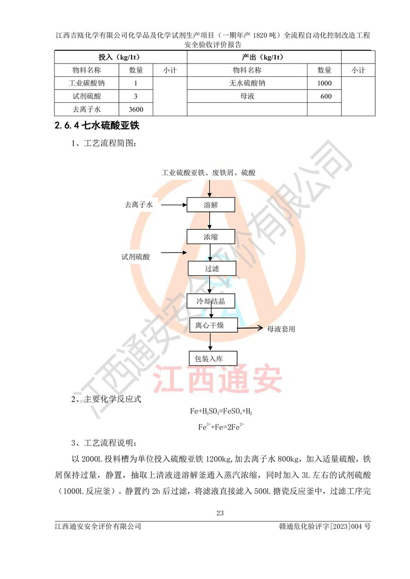 江西吉瓯化学有限公司(以下简称“公司”)位于江西省吉安市井冈山经济技术区富滩工业园B区,于2015年12月2日注册成立,注册资金壹仟万元,统一社会信用代码:91360803MA35FPBR83,法人**孙云辉,属有限责任公司(自然人投资或控股),经营范围:化学品、化学试剂生产、销售(不含危险化学品)(依法需经批准的项目,经相关部门批准后方可开展经营活动)。 公司于2016年3月21日取得青原区发展和改革委员会印发的《关于印发江西吉瓯化学有限公司改建项目的通知》(吉青发改字【2016】44号)文件,项目名称:化学品及化学试剂生产项目;2017年3月6日委托江西赣昌安全生产科技服务有限公司编制了《江西吉瓯化学有限公司化学品及化学试剂生产项目安全预评价报告》,并通过专家组评审;2018年3月委托江西省化学工业设计院编制了《江西吉瓯化学有限公司化学品及化学试剂生产项目安全设施设计专篇》,并于2018年5月14日取得吉安市安全生产监督管理局危险化学品建设项目安全设施设计审查意见书(吉市危化项目安设审字【2018】12号);2021年12月24日取得井冈山经济技术开发区应急管理局下发危险化学品建设项目试生产(使用)方案回执》(井开危化项目备字【2021】01号)文件,试生产期限为2021年12月24日至2022年12月23日;于2020年7月28日、2021年8月、2022年8月分别由江西省化学工业设计院出具了3次《江西吉瓯化学有限公司化学品及化学试剂生产项目设计变更说明》;于2022年12月16日委托江西通安安全评价有限公司编制了《江西吉瓯化学有限公司化学品及化学试剂生产项目(一期年产1820吨)安全验收评价报告》;于2023年2月3日取得江西省应急管理厅颁发的《安全生产许可证》(编号:(赣)WH安许证字【2023】1176号),**期由2023年2月3日至2026年2月2日,许可范围:氢氧化钡(20t/a)、硝酸钙(20t/a)。 根据《江西省应急管理厅关于印发<江西省化工企业自动化提升实施方案>(试行)的通知》(赣应急字[2021]190号)要求,公司于2022年7月委托黑龙江龙维化学工程设计有限公司编制了《江西吉瓯化学有限公司化学品及化学试剂生产项目全流程自动化控制诊断报告》;2022年12月7日委托黑龙江龙维化学工程设计有限公司编制了《江西吉瓯化学有限公司化学品及化学试剂生产项目(一期年产1820吨)危险与可操作性(HAZOP)分析报告》;2022年12月8日委托黑龙江龙维化学工程设计有限公司编制了《江西吉瓯化学有限公司化学品及化学试剂生产项目(一期年产1820吨)安全完整性评估(SIL)定级报告》;2023年1月9日委托黑龙江龙维化学工程设计有限公司编制了《江西吉瓯化学有限公司化学品及化学试剂生产项目全流程自动化控制改造设计方案》,并通过了专家审查。公司化学品及化学试剂生产项目(一期年产1820吨)全流程自动化控制改造工程由浙中自控工程(西安)有限公司负责安装、调试,并出具了《江西吉瓯化学有限公司PLC自动化控制系统改造项目调试报告》,调试结论:调试完成、符合要求。 |