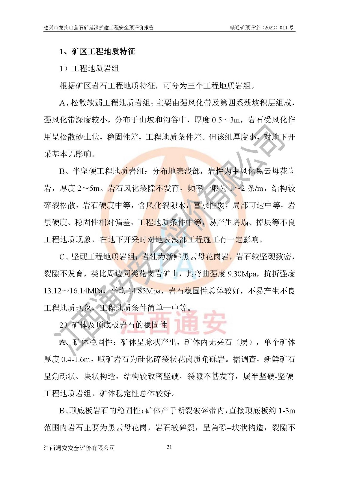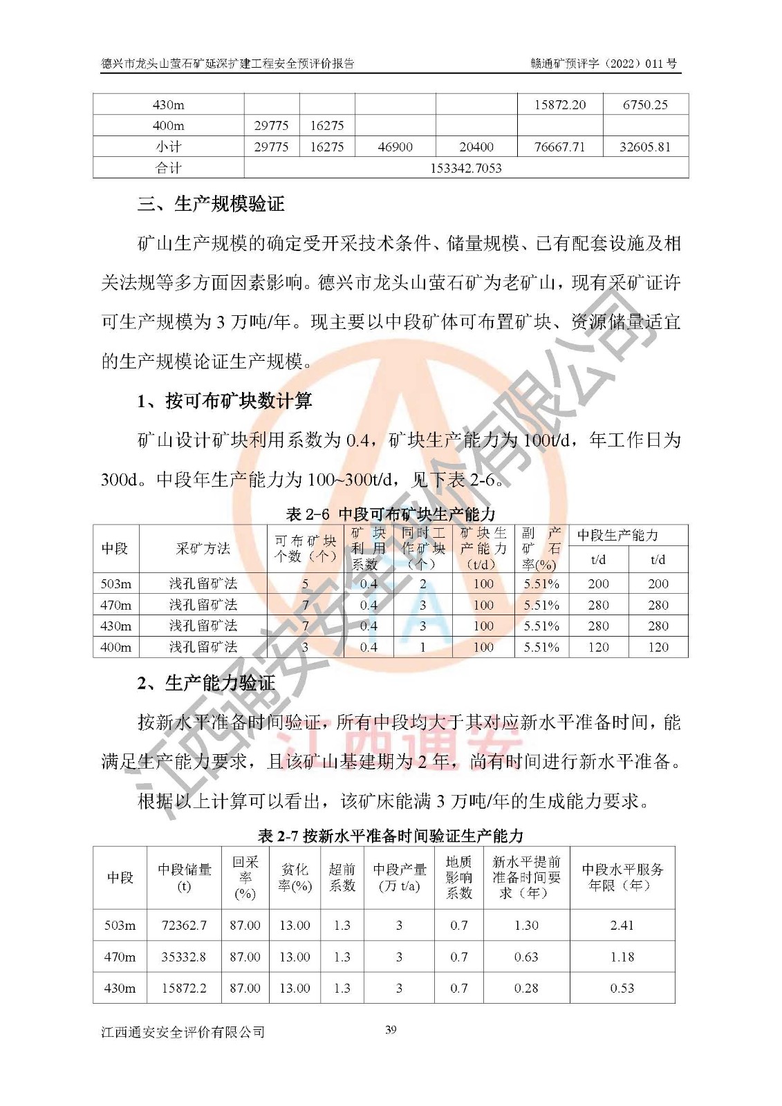 德兴市**山萤石矿位于德兴市区105°方位,直距35km处,属德兴市**山乡管辖。矿区地理坐标:东经117°54'54″~117°55'07",北纬28°50'53"~28°51'39"。矿区有6km简易公路与玉山-德兴省道公路相接;距浙赣铁路玉山站约55km;距德上高速公路樟村、怀玉出口约20km,交通较为便利。 德兴市**山萤石矿成立于1990年08月05日,注册地位于江西省德兴市**山乡**村南坞,法定**人为项昌炎,经济类型:集体企业。经营范围包括萤石矿地下开采。矿山于2003年首次取得上饶市国土资源局颁发的采矿许可证。2006年3月15日,矿山依法取得上饶市国土资源局延期颁发的采矿许可证,生产规模0.8万吨/年,开采深度:自+670m至+400m标高,面积为0.3207km2。2009-2018年期间矿山经多次采矿许可证延续。2018年8月30日,德兴市矿产黄金管理局出具《关于全面停止在生态保护红线范围内开展矿产资源勘查开采行为的通知》,由于项目矿界0.0008km2与生态红线重叠(红线类型为水土保持和生物多样性),上饶市国土资源局已将矿区涉及生态红线部分调出,矿区范围变更后,矿区范围由8个拐点组成,矿区面积由0.3207km2削减为0.3199km2。2018年12月28日,矿山取得了上饶市国土资源局延期换发的采矿许可证:C3611012010126120085302;采矿权人:德兴市**山萤石矿;矿山名称:德兴市**山萤石矿;经济类型:集体企业;开采矿种:萤石(普通);开采方式:地下开采;开采规模:0.8万吨/年;矿区面积:0.3199km2;**期限:2018年12月28日至2019年6月27日。 德兴市**山萤石矿自建矿以来,主要开采矿区北翼的M1矿体。矿山现采用竖井+盲竖井开拓,已开拓了竖井、盲竖井、回风井、+533m中段、+503m中段、+473m中段、+430m中段等工程。目前+473m中段以上矿体已基本采完。根据省安监局《关于进一步加强我省非煤地下矿山安全生产许可证工作的通知》(赣安监管一字[2012]253号)文件的要求,矿山开采多年形成的开拓方式与原开发利用方案及设计不符。2015年8月委托湖南联盛勘察设计有限公司编制了《德兴市**山萤石矿地下开采整改设计》及《德兴市**山萤石矿地下开采安全设施设计专篇》,并通过了原上饶市安监局组织的专家评审。2015年8月31日,原上饶市安监局下达了《关于德兴市**山萤石矿地下开采安全设施设计专篇的审查意见》的批复。2015年10月,矿山开展了整改设计安全设施验收评价工作,并委托江西矿安安全生产科学技术咨询中心有限公司编制了验收评价报告。2015年12月4日,矿山通过了整改设计安全设施竣工验收,并办理了安全生产许可证(许可对象为北翼M1矿体)。矿山取得安全生产许可证后,未开展其它设计或设计变更,矿山基本按整改设计进行开采。2020年5月,矿山委托中检集团康泰安全科技有限公司编制了《德兴市**山萤石矿安全现状评价报告》,作为安全生产许可证延期换证技术资料。2019 年6月27日-2021年1月12日,矿山因采矿许可未及时延续,主动申请停产,2021 年1月换放了采矿许可证,矿山依据《江西省安监局关于切实做好**非煤矿山停工停产及复工复产期间安全生产工作的指导意见》(赣安监管一字〔2015〕20 号)恢复生产,并开展了安全生产许可证延期换证工作。 2021年以前矿山采矿许可生产规模为0.8万吨,随着**对非煤矿山产业政策的调整,不断提高了非煤矿矿山准入门槛。矿山现有的采矿生产规模无法满足,《**安全生产专项整治三年行动计划》及“江西省主要矿产矿山*低开采规模和*低服务年限规划”等文件要求。 德兴市**山萤石矿北翼M1矿体经过多年开采后,原设计范围内(+473m以上中段)萤石矿资源储量日渐减少。为了扩大矿区资源储量,延长矿山服务年限,查明矿区萤石矿资源储量,提高矿床控制程度,为矿山提供更多可靠的资源储量。矿山加强了采矿许可范围内勘查地质工作,2018年4月委托江西省煤田地质局二二三地质队对其矿区范围内的北翼M1,南翼M2、M2-1矿体开展储量核实工作,2019年2月江西省煤田地质局二二三地质队提交了《江西省德兴市**山矿区萤石矿资源储量核实报告》报告中显示截止2018年12月31日,矿区保有萤石矿资源储量(122b+332+333)矿石量189.1kt,矿物量85.4kt,平均品位45.16%。北翼M1矿体其中122b类型矿石量5.7kt,333类型矿石量32.1kt。南翼M2、M2-1矿体其中332类型矿石量46.9kt,333类型矿石量104.4kt。 2021年1月12日,矿山取得上饶市自然资源局延期换发的采矿许可证,证号:C3611012010126120085302,采矿权人:德兴市**山萤石矿,地址:江西省德兴市,矿山名称:德兴市**山萤石矿,经济类型:集体企业,开采矿种:萤石(普通),开采方式:地下开采,生产规模:3.0万t/a,矿区面积:0.3199km2,**期限:肆年零玖月自2021年1月12日至2025年10月12日。开采深度由670m至400m标高,共有8个拐点圈定。 2021年8月19日,矿山取得江西省应急管理厅换发的安全生产许可证(开采对象北翼M1矿体)。编号:(赣)FM安许证字[2006]M0836号,单位名称:德兴市**山萤石矿,主要负责人:项昌炎,单位地址:德兴市**山乡**村,经济类型:集体企业,许可范围:萤石矿0.8万吨/年,竖井开拓,+473m中段地下开采。**期至2024年8月18日。 目前,矿山已完成了采矿许可证范围内详查工作,完成了资源价款处置,并完成了采矿许可生产规模的变更及采矿权延续等工作。为了使矿井达到持续稳定的生产接替,保持三级矿量平衡,矿山在完成储量核实报告工作后,现阶段正在履行延深扩建工程“三同时”建设手续。2021年8月30日,矿山向德兴市工业和信息化局申请了