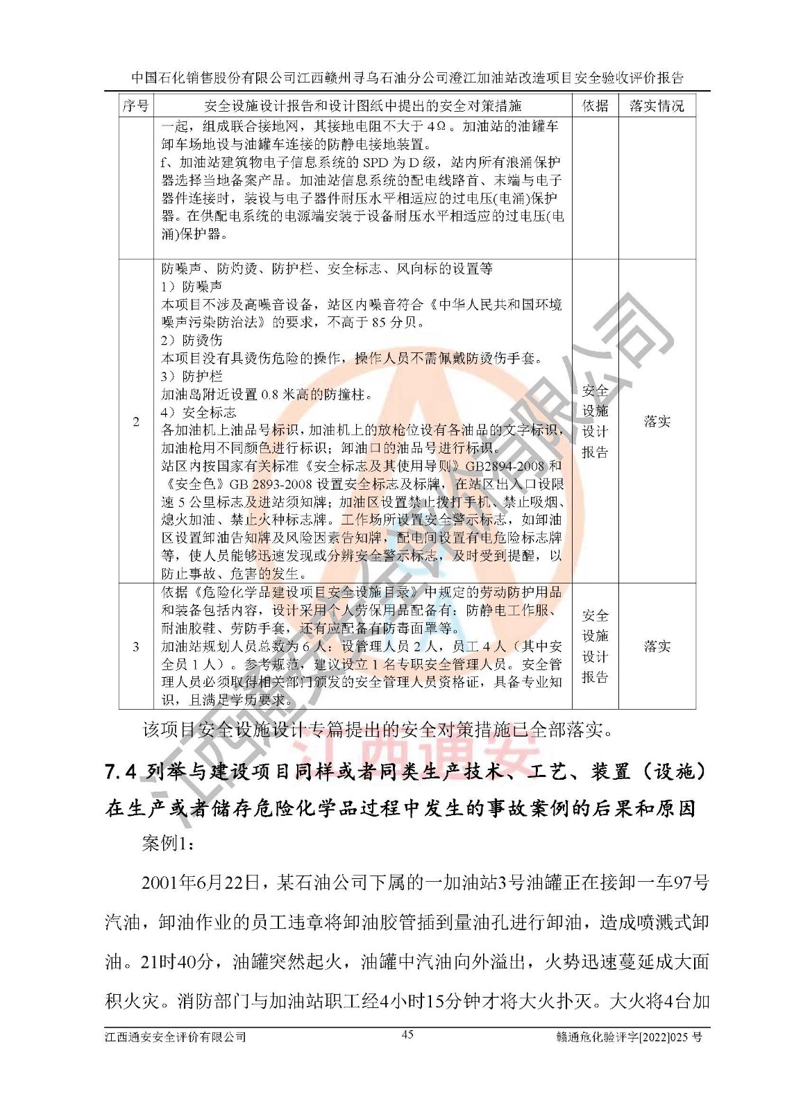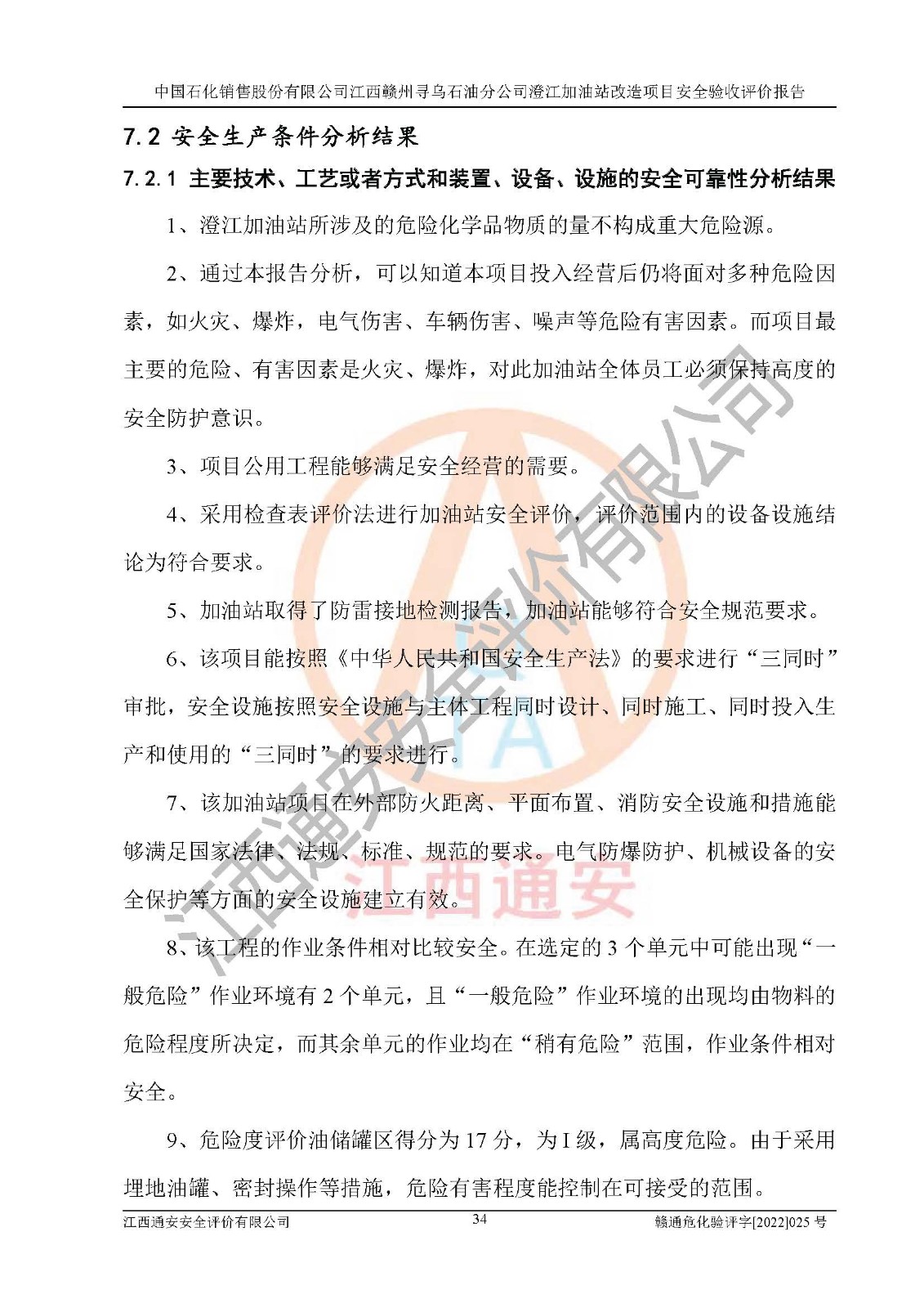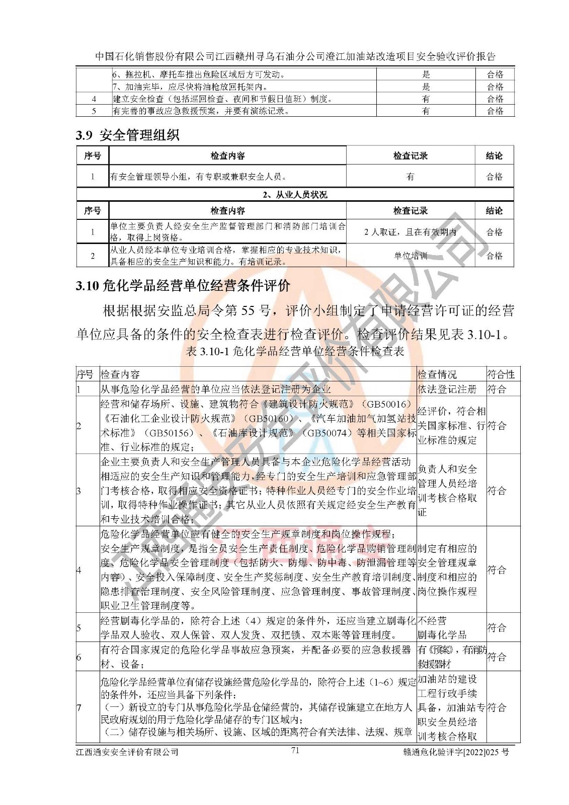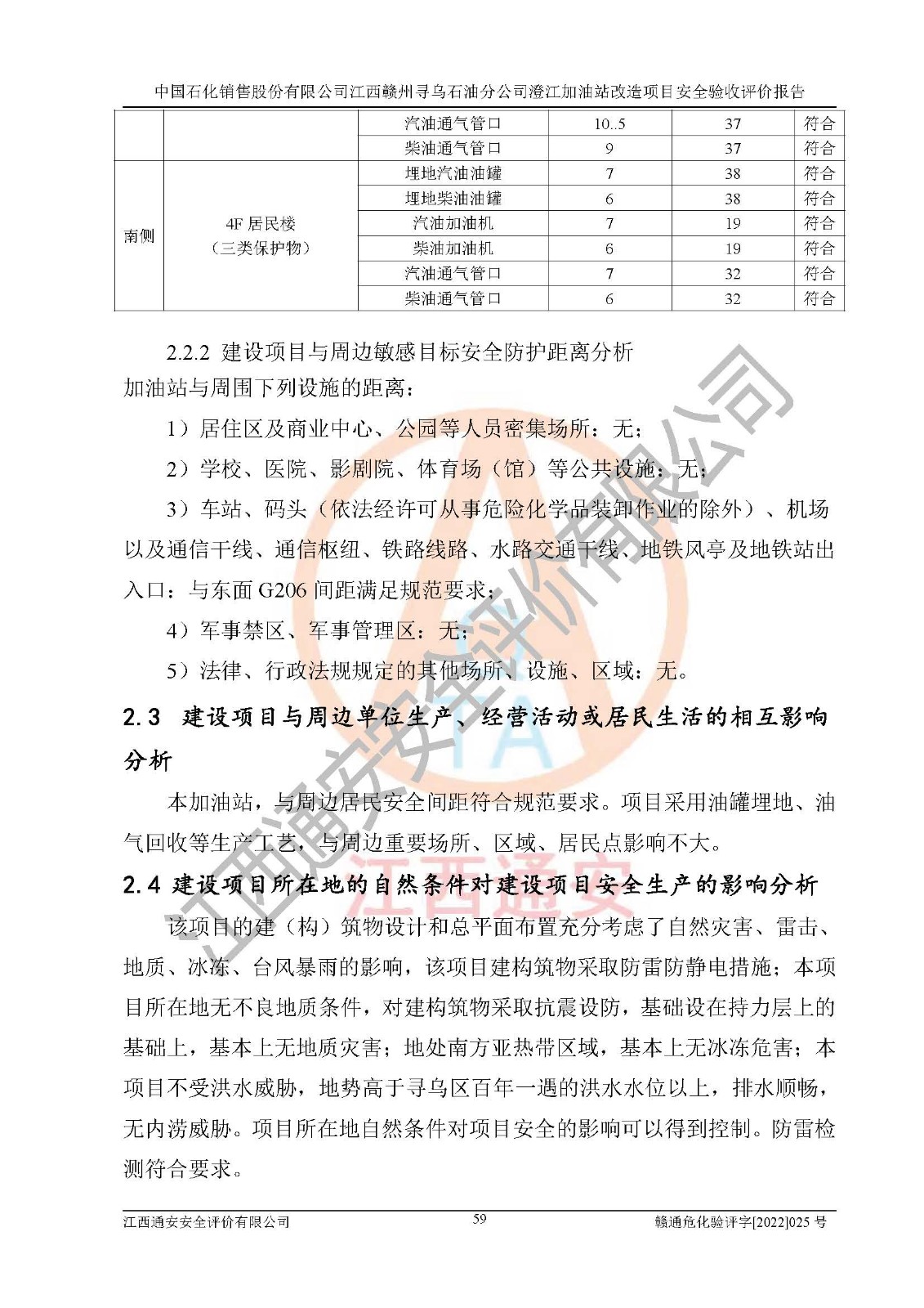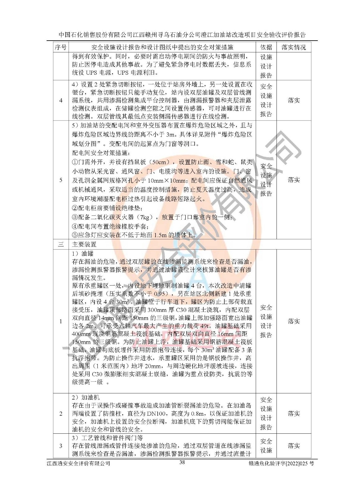 其它 | 中国石化销售股份有限公司江西赣州寻乌石油分公司澄江加油站改造项目的安全设施和措施在正常经营过程中能够满足安全经营的条件,消防设施到位且在**期内,安全管理能够满足正常安全经营的需要,具备安全验收的条件,符合经营和储存危险化学品的安全条件要求。 | ||||
