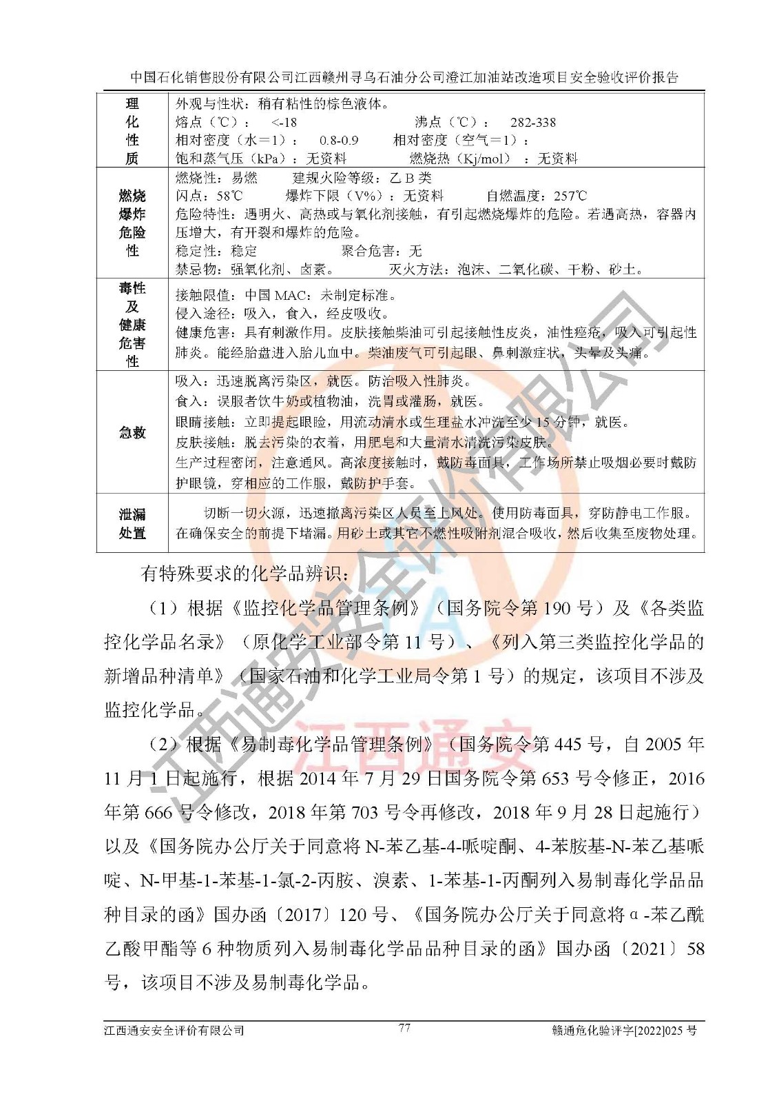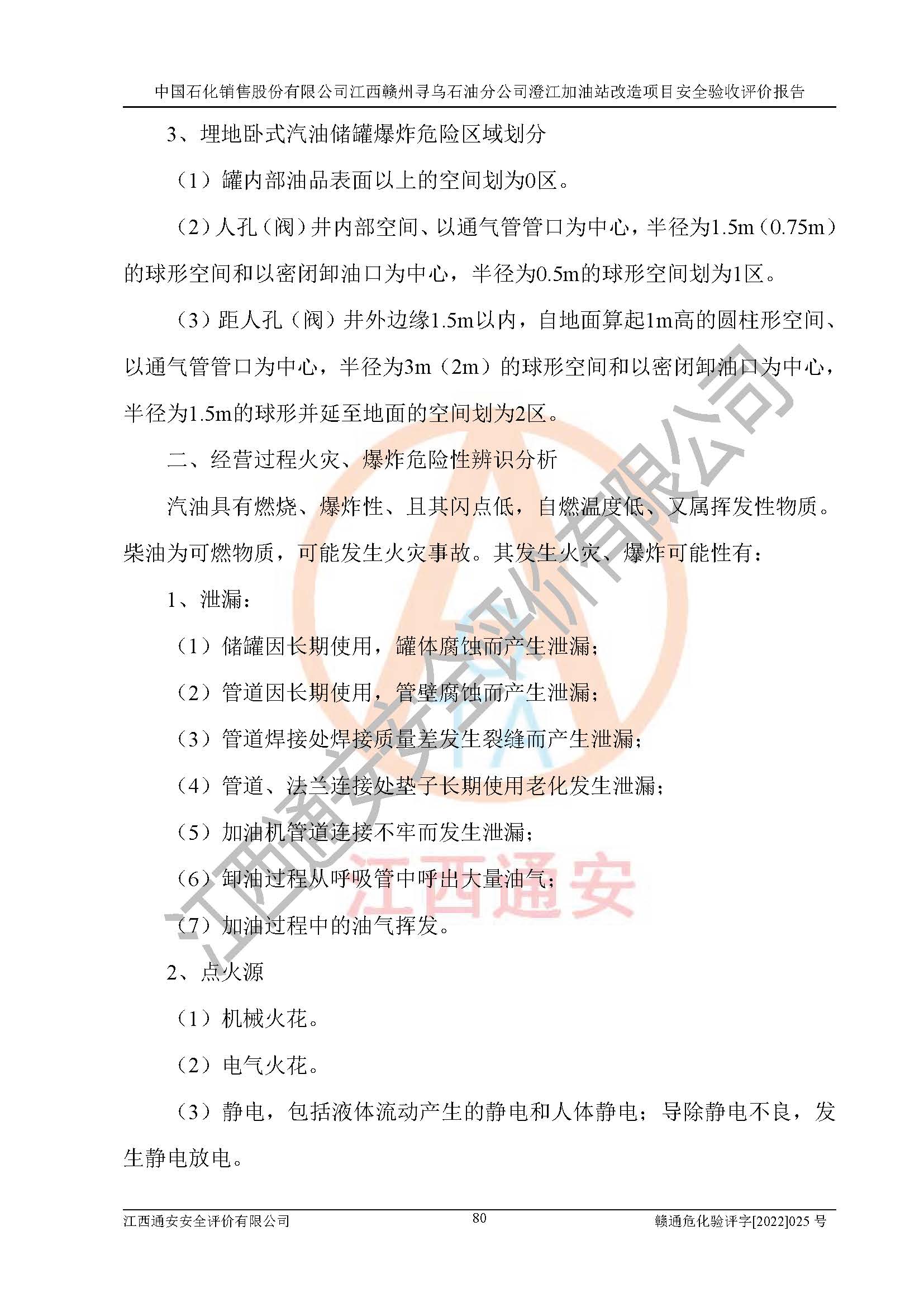 项目简介 | 本报告为中国石化销售股份有限公司江西赣州寻乌石油分公司澄江加油站改造项目(以下简称澄江加油站)的安全验收评价报告。澄江加油站位于寻乌县澄江镇澄江圩,是从事成品油储存经营的外商投资企业分公司。本站为加油站改造项目,已通过寻乌县行政审批局进行立项备案(项目统一代码为:2204-360734-07-02-580440)。澄江加油站于2019年7月4日取得危险化学品经营许可证,2019年12月31日取得成品油零售经营批准证书。 改造后罐区设置有四个30m³油罐,分别为两个92#汽油罐、一个95#汽油罐和一个30m³0#柴油罐,油罐容量为120m³,折合油罐总容积为105m³,属二级加油站。 汽油和柴油均是化学品液体。汽油、柴油均为危险化学品,其中汽油火险分级为甲B类,其蒸汽与空气形成爆炸性气体,遇明火、高热易燃烧爆炸;柴油火险分级为丙A类,遇明火、高热或与氧化剂接触,有引起燃烧爆炸的危险。 | ||||