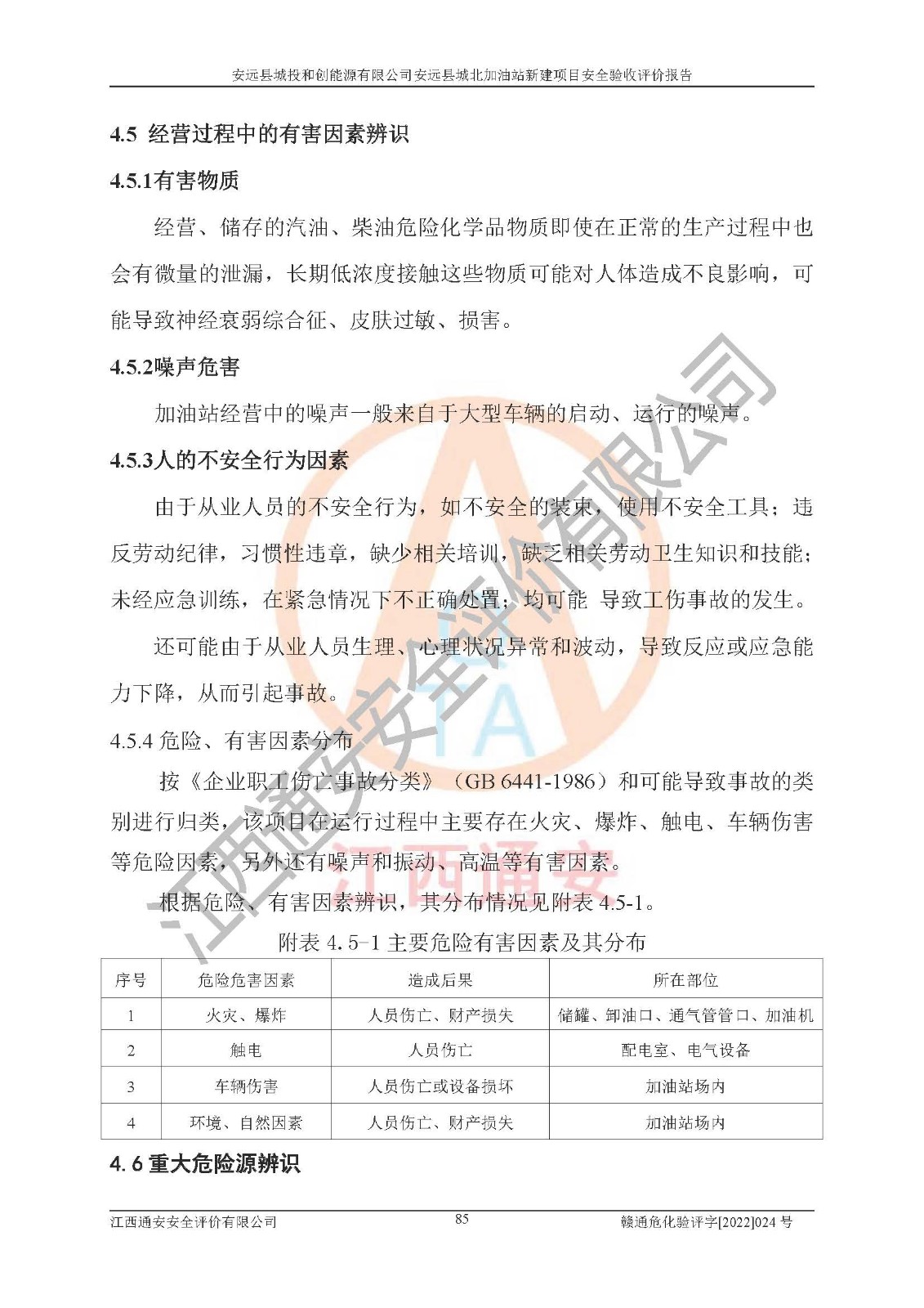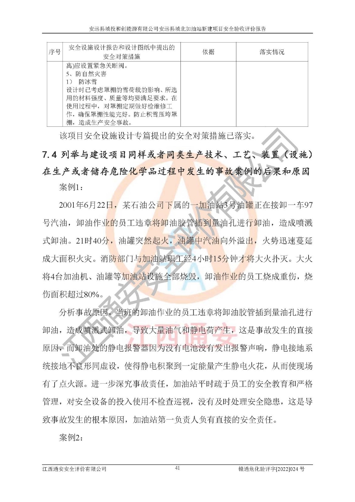其它 | 安远县城投和创能源有限公司安远县城北加油站新建项目符合**有关安全生产法律、法规和有关标准、规范。认真落实并合理采纳安全条件评价报告及安全设施设计专篇设计中的安全对策、措施及建议;履行了建设项目安全设施“三同时”要求并做到安全设施与主体工程同时设计、同时施工、同时投入生产和使用;对潜在的危险、有害因素采取了安全对策措施,工程潜在的危险、有害因素可得到**控制,风险在**控制和可接受范围内。 该项目安全设施设计专篇设计的安全设施得到落实符合**安全生产方面的法律、法规、标准、规范的要求,符合《危险化学品经营许可证管理办法》**安监总局令第55号的要求,具备安全验收条件,符合安全生产条件。 | ||||
