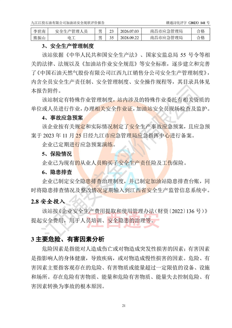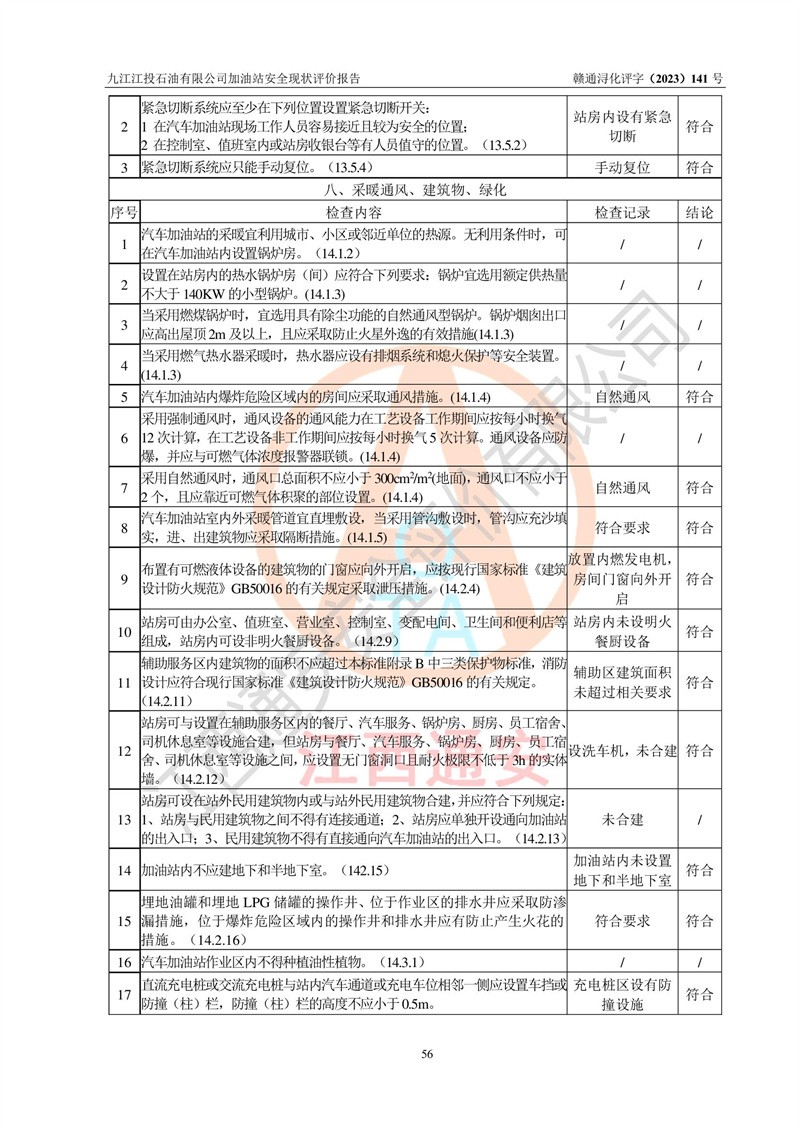 评价结论 | 综上所述:九江江投石油有限公司加油站涉及的安全条件、安全经营条件、安全生产管理符合《危险化学品经营许可证管理办法》、《汽车加油加气加氢站技术标准》等**有关法规、标准、规范要求,能满足危险化学品经营安全条件。 | ||||||