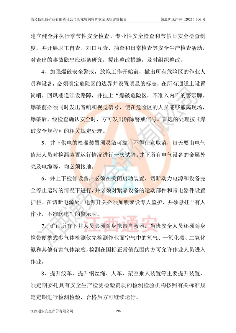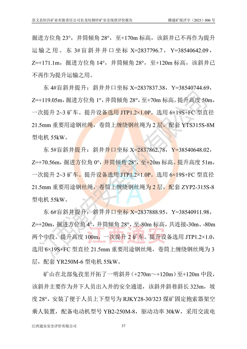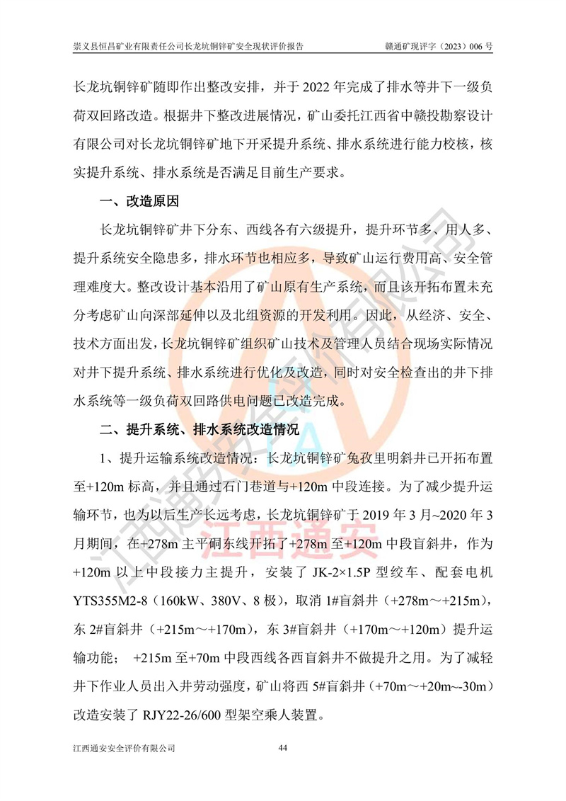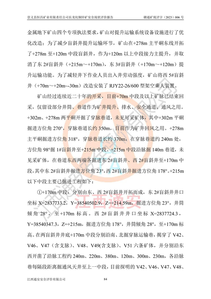 崇义县恒昌矿业有限责任公司长龙坑铜锌矿属江西耀升钨业股份有限公司全资子公司,矿区位于崇义县城112°方向,直距11km处,地理坐标:东经114°23′45″~114°24′42″,北纬25°38′47″~25°39′40″,行政区划隶属崇义县长龙镇长龙村管辖。 长龙坑铜锌矿始建于1996年,至2012年矿山由江西耀升钨业股份有限公司收购,2012年6月12日矿山《采矿许可证》变更为崇义县恒昌矿业有限责任公司长龙坑铜锌矿;2012年12月27日矿山《安全生产许可证》单位名称变更为崇义县恒昌矿业有限责任公司长龙坑铜锌矿。 2017年6月16日,企业取得崇义县市场和质量监督管理局换发的营业执照,统一社会信用代码:91360725056439506W,名称:崇义县恒昌矿业有限责任公司长龙坑铜锌矿,类型:有限责任公司分公司,住所:江西省赣州市崇义县长龙镇长龙村,负责人:郭家芬,成立日期:2012年10月23日,营业期限:2012年10月23日至长期,经营范围:铜、锌、钨矿产品开采(凭**许可证经营)、矿产资源勘查。 2022年10月31日,矿山取得江西省自然资源厅换发的采矿许可证,证号:C3600002011013220104184,采矿权人:崇义县恒昌矿业有限责任公司,地址:江西省赣州市崇义县,矿山名称:崇义县恒昌矿业有限责任公司长龙坑铜锌矿,经济类型:私营有限责任公司,开采矿种:铜矿、锌矿、钨矿,开采方式:地下开采,生产规模:3.00万t/a,矿区面积;2.3125km2,**期限:柒年零捌月年自2022年10月12日至2030年6月12日。开采深度由500m至-100m标高,共有4个拐点圈定。 根据《关于进一步加强我省非煤地下矿山安全生产许可工作的通知》(赣安监管一字〔2012〕253号)等文件的要求。2013年10月,矿山委托江西省冶金设计院有限责任公司编制了《崇义县长龙坑铜锌矿整改方案设计及安全专篇》,并于2014年1月19日由原赣州市安监局组织专家对《崇义县长龙坑铜锌矿整改方案设计及安全专篇》进行了评审并原则通过,2014年7月4日由原赣州市安监局下达了《关于崇义县长龙坑铜锌矿地下开采整改方案设计安全专篇的安全设施审查意见》审查意见书(赣市安监非煤整改设计审字[2014]6号)。矿山整改工程设计采用平硐+盲斜井联合开拓,共布置+20m、-30m、-80m三个中段。采矿方法为浅孔留矿法,通风系统采用中央抽出式机械通风,主扇安装在+302m回风平硐内,矿山生产规模为3万吨/年。 2015年5月,矿山委托江西通安安全评价有限公司编制了《崇义县恒昌矿业有限责任公司长龙坑铜锌矿地下开采整改工程安全验收评价报告》。2015年5月21日,原赣州市安监局组织有关专家对崇义县恒昌矿业有限责任公司长龙坑铜锌矿地下开采整改方案设计安全设施进行了现场竣工验收,验收范围+20m~-80m标高。专家组原则通过安全设施竣工验收。 2020年10月12日,矿山取得原江西省应急管理厅换发的安全生产许可证。编号:(赣)FM安许证字[2005]M0048,许可范围:铜、锌、钨矿3万t/a,平硐+盲斜井联合开拓,+20m、-30m、-80m中段地下开采,**期:2020年11月27日至2023年11月26日。 矿山取得安全生产许可证后,严格按照设计回采顺序要求进行开采。矿山现采用平硐+盲斜井联合开拓。已开拓了+302m回风平硐、+278m主平硐、+215m、+170m、+120m、+70m、+20m、-30m、-80m九个中段,其中+70m及以上中段已结束回采,保留了主要井巷工程仅为矿井通风、运输、行人之用,+20m、-30m、-80m三个中段为生产中段,生产规模为3万t/a。+278m主平硐为主要运输中段,+278m以下中段均通过盲斜井分段连接,1#盲斜井为+278m~+215m。+215m中段以下分东、西两条线盲斜井开拓,其中东线盲斜井为提升运输线已开拓至-80m中段,西线盲斜井为通风、行人井已开拓至-30m中段。东线盲斜井共布置有:东2#盲斜井(+215m~+170m),东3#盲斜井(+170m~+120m),东4#盲斜井(+120m~+70m),东5#盲斜井(+70m~+20m),东6#盲斜井(+20m~-30m~-80m)。西线盲斜井共布置有:西2#盲斜井(+215m~+170m),西3#盲斜井(+170m~+120m),西4#盲斜井(+120m~+70m),西5#盲斜井(+70m~+20m~-30m)。另外,矿山在北部兔孜里开拓了一明斜井(+270m~+120m)至+120m中段,并掘400m穿脉巷道与南部+120m中段贯穿,该斜井主要作为井下人员出入井的安全通道,斜井安装了便于人员上下的“煤矿固定抱索器架空乘人装置”。根据应急管理部开展金属非金属地下矿山四个专项执法要求,矿山对提升运输系统设备设施进行了优化改造;为了减少盲斜井提升运输环节,矿山在+278m主平硐东线开拓了+278m至+120m中段盲斜井,作为+120m以上中段接力主提升,并取消了1#盲斜井(+278m~+215m),东2#盲斜井(+215m~+170m),东3#盲斜井(+170m~+120m)提升运输功能。为了减轻井下作业人员出入井劳动强度,矿山将西5#盲斜井(+70m~+20m~-30m)改造安装了RJY22-26/600型架空乘人装置。为了优化矿井通风系统,矿山将原设计22kW型号BK60-NO10/22主扇风机,更换为30kW型号KZ(K45)-4№10主扇,进一步提高了矿井通风效率,并减少、更换了部分辅扇。 2021年8月13日江西省应急管理厅组织的交叉检查中,对崇义县恒昌矿业有限责任公司长龙坑铜锌矿提出存在“井下排水系统、提升系统与2014年整改设计发生了变化,未见相关变更手续”问题,**进行整改。根据崇义县应急管理局(崇)应急责改[2021]K18号《责令限期整改指令书》,2021年9矿山委托江西省煤矿设计院对长龙坑铜锌矿地下开采提升系统、排水系统进行能力校核,结论:长龙坑铜锌矿现有提升系统、排水系统能满足矿井目前生产能力要求,较原整改设计提高了安全保障水平。因江西省煤矿设计院单
