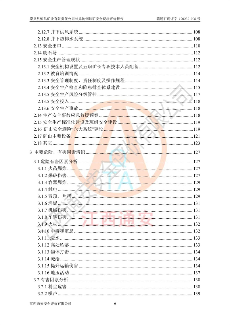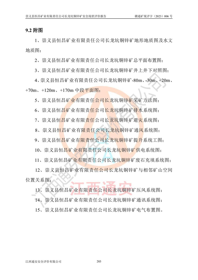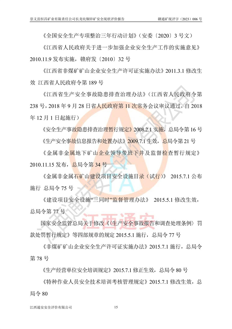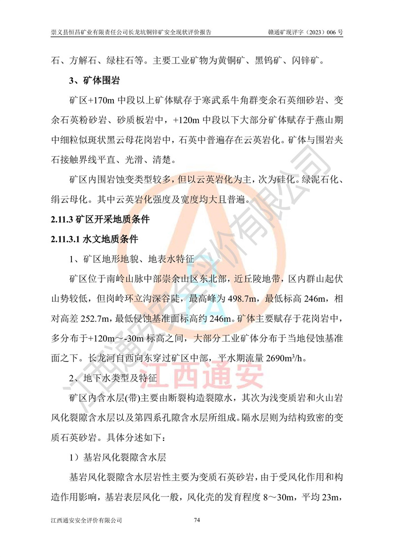 崇义县恒昌矿业有限责任公司长龙坑铜锌矿属江西耀升钨业股份有限公司全资子公司,矿区位于崇义县城112°方向,直距11km处,地理坐标:东经114°23′45″~114°24′42″,北纬25°38′47″~25°39′40″,行政区划隶属崇义县长龙镇长龙村管辖。 长龙坑铜锌矿始建于1996年,至2012年矿山由江西耀升钨业股份有限公司收购,2012年6月12日矿山《采矿许可证》变更为崇义县恒昌矿业有限责任公司长龙坑铜锌矿;2012年12月27日矿山《安全生产许可证》单位名称变更为崇义县恒昌矿业有限责任公司长龙坑铜锌矿。 2017年6月16日,企业取得崇义县市场和质量监督管理局换发的营业执照,统一社会信用代码:91360725056439506W,名称:崇义县恒昌矿业有限责任公司长龙坑铜锌矿,类型:有限责任公司分公司,住所:江西省赣州市崇义县长龙镇长龙村,负责人:郭家芬,成立日期:2012年10月23日,营业期限:2012年10月23日至长期,经营范围:铜、锌、钨矿产品开采(凭**许可证经营)、矿产资源勘查。 2022年10月31日,矿山取得江西省自然资源厅换发的采矿许可证,证号:C3600002011013220104184,采矿权人:崇义县恒昌矿业有限责任公司,地址:江西省赣州市崇义县,矿山名称:崇义县恒昌矿业有限责任公司长龙坑铜锌矿,经济类型:私营有限责任公司,开采矿种:铜矿、锌矿、钨矿,开采方式:地下开采,生产规模:3.00万t/a,矿区面积;2.3125km2,**期限:柒年零捌月年自2022年10月12日至2030年6月12日。开采深度由500m至-100m标高,共有4个拐点圈定。 根据《关于进一步加强我省非煤地下矿山安全生产许可工作的通知》(赣安监管一字〔2012〕253号)等文件的要求。2013年10月,矿山委托江西省冶金设计院有限责任公司编制了《崇义县长龙坑铜锌矿整改方案设计及安全专篇》,并于2014年1月19日由原赣州市安监局组织专家对《崇义县长龙坑铜锌矿整改方案设计及安全专篇》进行了评审并原则通过,2014年7月4日由原赣州市安监局下达了《关于崇义县长龙坑铜锌矿地下开采整改方案设计安全专篇的安全设施审查意见》审查意见书(赣市安监非煤整改设计审字[2014]6号)。矿山整改工程设计采用平硐+盲斜井联合开拓,共布置+20m、-30m、-80m三个中段。采矿方法为浅孔留矿法,通风系统采用中央抽出式机械通风,主扇安装在+302m回风平硐内,矿山生产规模为3万吨/年。 2015年5月,矿山委托江西通安安全评价有限公司编制了《崇义县恒昌矿业有限责任公司长龙坑铜锌矿地下开采整改工程安全验收评价报告》。2015年5月21日,原赣州市安监局组织有关专家对崇义县恒昌矿业有限责任公司长龙坑铜锌矿地下开采整改方案设计安全设施进行了现场竣工验收,验收范围+20m~-80m标高。专家组原则通过安全设施竣工验收。 2020年10月12日,矿山取得原江西省应急管理厅换发的安全生产许可证。编号:(赣)FM安许证字[2005]M0048,许可范围:铜、锌、钨矿3万t/a,平硐+盲斜井联合开拓,+20m、-30m、-80m中段地下开采,**期:2020年11月27日至2023年11月26日。 矿山取得安全生产许可证后,严格按照设计回采顺序要求进行开采。矿山现采用平硐+盲斜井联合开拓。已开拓了+302m回风平硐、+278m主平硐、+215m、+170m、+120m、+70m、+20m、-30m、-80m九个中段,其中+70m及以上中段已结束回采,保留了主要井巷工程仅为矿井通风、运输、行人之用,+20m、-30m、-80m三个中段为生产中段,生产规模为3万t/a。+278m主平硐为主要运输中段,+278m以下中段均通过盲斜井分段连接,1#盲斜井为+278m~+215m。+215m中段以下分东、西两条线盲斜井开拓,其中东线盲斜井为提升运输线已开拓至-80m中段,西线盲斜井为通风、行人井已开拓至-30m中段。东线盲斜井共布置有:东2#盲斜井(+215m~+170m),东3#盲斜井(+170m~+120m),东4#盲斜井(+120m~+70m),东5#盲斜井(+70m~+20m),东6#盲斜井(+20m~-30m~-80m)。西线盲斜井共布置有:西2#盲斜井(+215m~+170m),西3#盲斜井(+170m~+120m),西4#盲斜井(+120m~+70m),西5#盲斜井(+70m~+20m~-30m)。另外,矿山在北部兔孜里开拓了一明斜井(+270m~+120m)至+120m中段,并掘400m穿脉巷道与南部+120m中段贯穿,该斜井主要作为井下人员出入井的安全通道,斜井安装了便于人员上下的“煤矿固定抱索器架空乘人装置”。根据应急管理部开展金属非金属地下矿山四个专项执法要求,矿山对提升运输系统设备设施进行了优化改造;为了减少盲斜井提升运输环节,矿山在+278m主平硐东线开拓了+278m至+120m中段盲斜井,作为+120m以上中段接力主提升,并取消了1#盲斜井(+278m~+215m),东2#盲斜井(+215m~+170m),东3#盲斜井(+170m~+120m)提升运输功能。为了减轻井下作业人员出入井劳动强度,矿山将西5#盲斜井(+70m~+20m~-30m)改造安装了RJY22-26/600型架空乘人装置。为了优化矿井通风系统,矿山将原设计22kW型号BK60-NO10/22主扇风机,更换为30kW型号KZ(K45)-4№10主扇,进一步提高了矿井通风效率,并减少、更换了部分辅扇。 2021年8月13日江西省应急管理厅组织的交叉检查中,对崇义县恒昌矿业有限责任公司长龙坑铜锌矿提出存在“井下排水系统、提升系统与2014年整改设计发生了变化,未见相关变更手续”问题,**进行整改。根据崇义县应急管理局(崇)应急责改[2021]K18号《责令限期整改指令书》,2021年9矿山委托江西省煤矿设计院对长龙坑铜锌矿地下开采提升系统、排水系统进行能力校核,结论:长龙坑铜锌矿现有提升系统、排水系统能满足矿井目前生产能力要求,较原整改设计提高了安全保障水平。因江西省煤矿设计院单