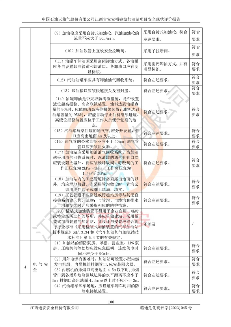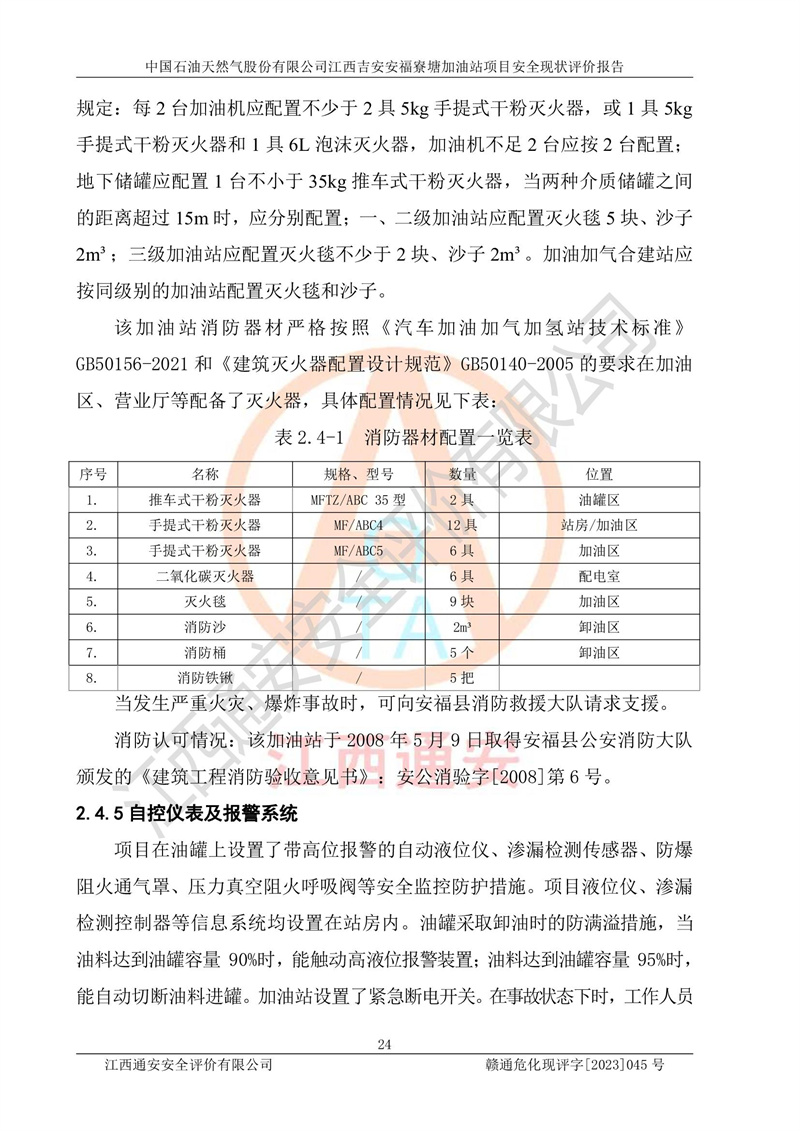 中国石油天然气股份有限公司江西吉安安福寮塘加油站是一家从事成品油批发、成品油零售经营的企业。该加油站成立于2011年5月4日,并获得安福县市场监督管理局颁发的营业执照,营业执照统一社会信用代码为:91360829573618262D,加油站类型为股份有限公司分公司(上市,国有控股),负责人为鄢**,经营范围:许可项目:成品油批发,成品油零售,住宿服务,餐饮服务,食品销售,烟草制品零售,***零售,农药零售,药品零售(依法须经批准的项目,经相关部门批准后在许可**期内方可开展经营活动,具体经营项目和许可期限以相关部门批准文件或许可证件为准)一般项目:润滑油销售,日用陶瓷制品销售,汽车销售,新能源汽车整车销售,新能源汽车换电设施销售,新能源汽车电附件销售,互联网销售(除销售需要许可的商品),汽车装饰用品销售,日用品销售单用途商业预付卡代理销售,日用化学产品销售,劳动保护用品销售,家用电器销售,塑料制品销售,婴幼儿配方乳粉及其他婴幼儿配方食品销售,食品用洗涤剂销售,饲料添加剂销售,肥料销售,洗车服务,农副产品销售,五金产品零售,办公用品销售,第二类医疗器械销售,充电桩销售农作物种子经营(**不再分装的包装种子),广告设计代理,电子过磅服务,化妆品零售,畜牧渔业饲料销售消毒剂销售 (不含危险化学品),汽车零配件零售,电车销售,机动车修理和维护,家具销售,日用百货销售,集中式**充电站,针纺织品销售,住房租赁 (除依法须经批/准的项目处,凭营业执照依法自主开展经营活动)。经营场所:江西省吉安市安福县寮塘乡龙佳村。 中国石油天然气股份有限公司江西吉安安福寮塘加油站占地面积1200㎡,加油站中设有0#柴油双枪加油机2台,92#汽油、95#汽油四枪加油机2台;该站设有4个30m³SF双层埋地卧式储罐,其中有2个30m³SF双层埋地卧式0#柴油罐、1个92#30m³SF双层埋地卧式汽油罐,1个95#30m³SF双层埋地卧式汽油罐,油品折算总容量为90m³(柴油罐容积折半计入油罐总容积),属三级加油站,汽油卸油、加油设置了油气回收系统。 中国石油天然气股份有限公司江西吉安安福寮塘加油站于2020年11月04日经安福县应急管理局核准,换发了新的《危险化学品经营许可证》,证书编号:赣安安经(甲)[2014]000007,许可经营范围:成品油。**期2020年11月04日至2023年11月03日。 中国石油天然气股份有限公司江西吉安安福寮塘加油站2023年05月11日经吉安市商务局核准,换取了新的《成品油零售经营批准证书》,证书编号:油零售证书第吉0256号,批准从事成品油(汽油、柴油)零售业务。证书**期至2023年5月11日至2028年05月10日。 |