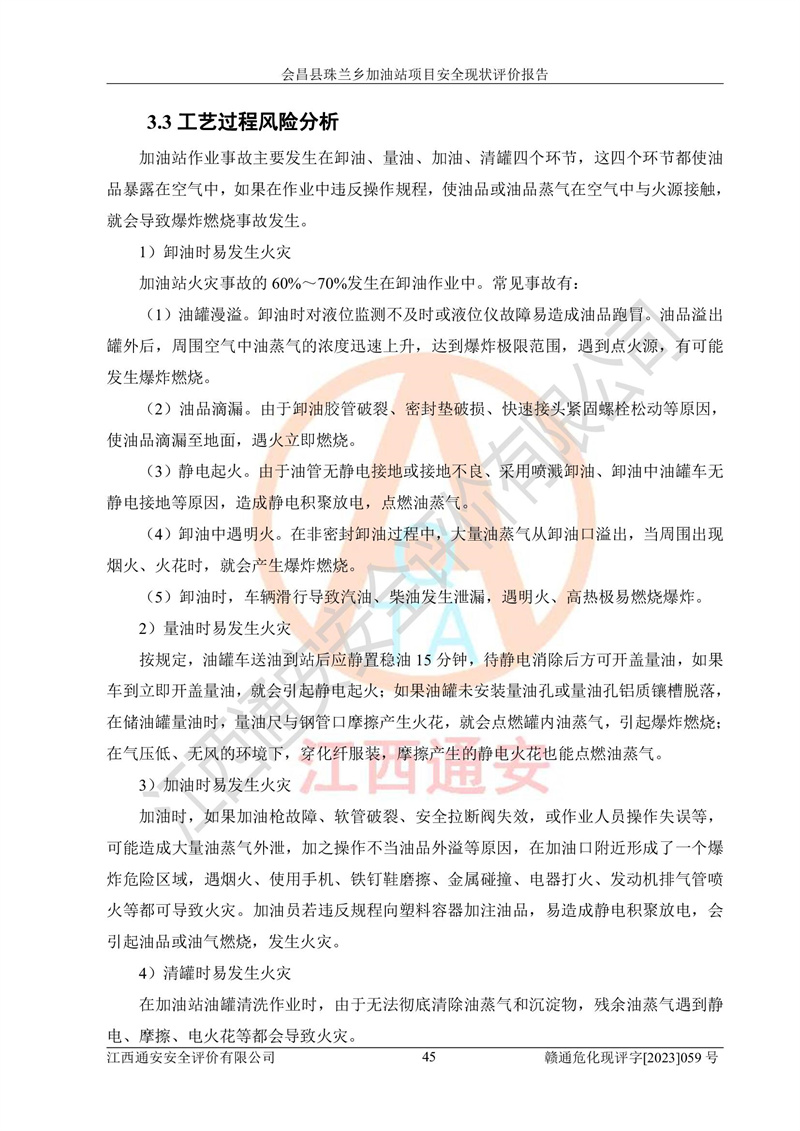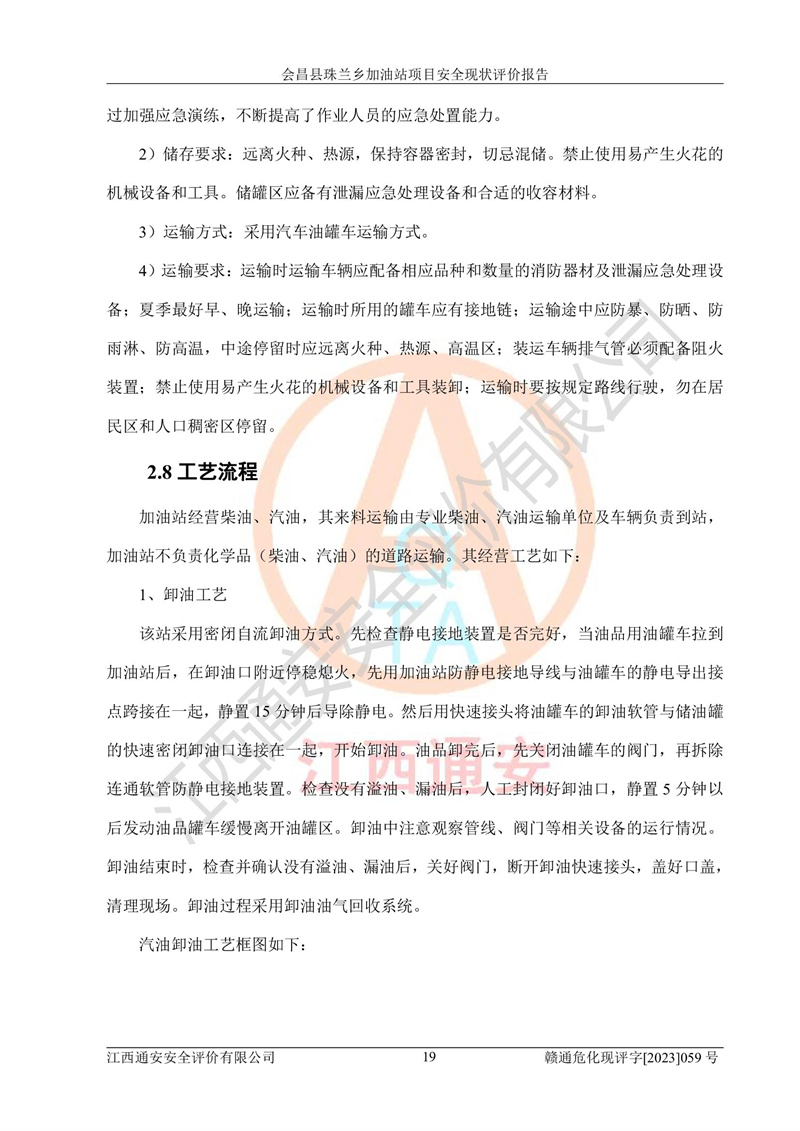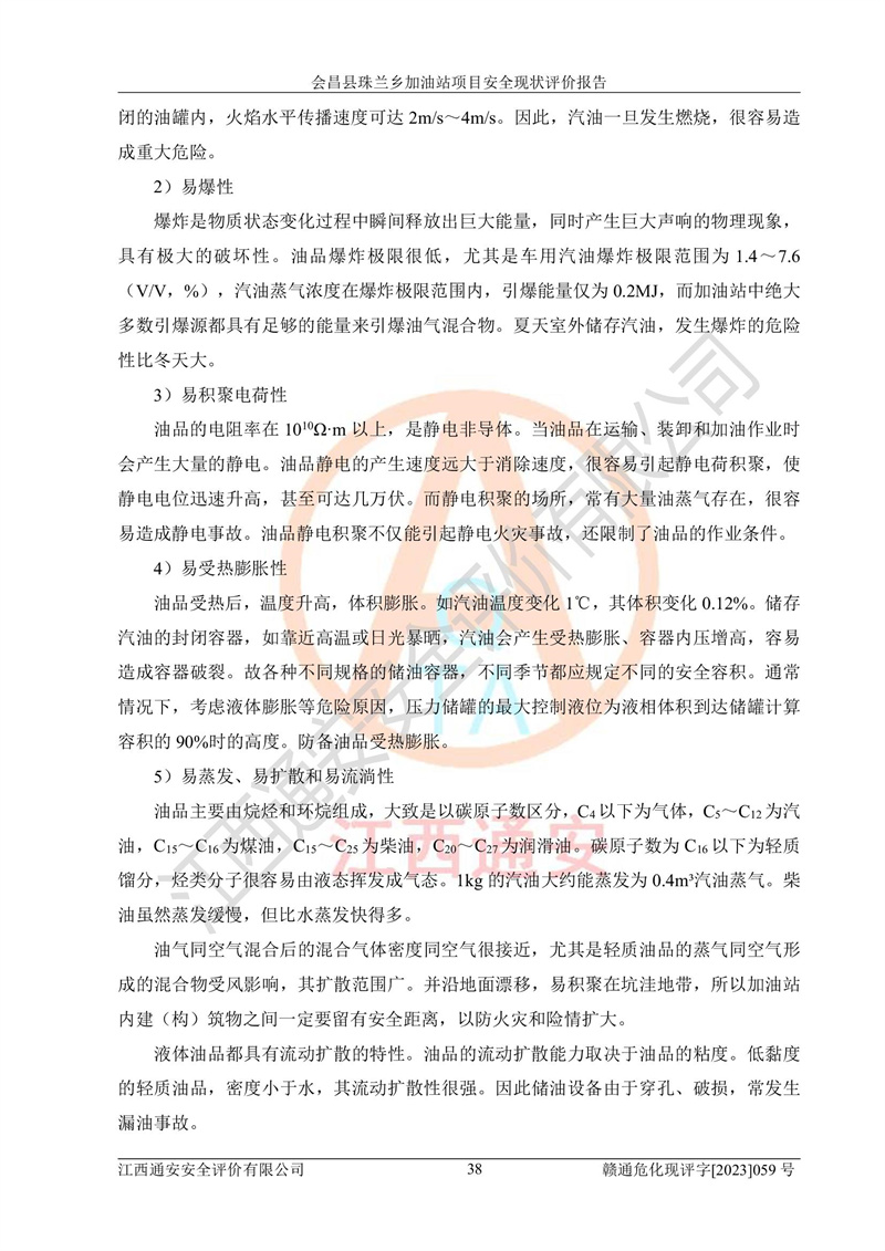 项目简介 | 本报告为会昌县珠兰乡加油站安全现状评价报告。会昌县珠兰乡加油站注册地址为会昌县珠兰乡怀仁村,法人**郑碧辉,成立于2018年01月02日,是一家从事成品油零售经营的单位。该加油站设4台双层油罐,包括92#汽油储罐1个,容积50m3;95#汽油储罐1个,容积50m3;0#柴油储罐2个,每个容积50m3,总储存能力为150m³(柴油折半计入),按**现行《汽车加油加气加氢站技术标准》GB50156-2021对加油站的等级划分计算,属二级加油站。加油区设了4台双枪加油机。 汽油和柴油均是化学品液体。汽油、柴油均为危险化学品,其中汽油火险分级为甲B类,其蒸汽与空气形成爆炸性气体,遇明火、高热易燃烧爆炸;柴油火险分级为丙A类,遇明火、高热或与氧化剂接触,有引起燃烧爆炸的危险。 | ||||