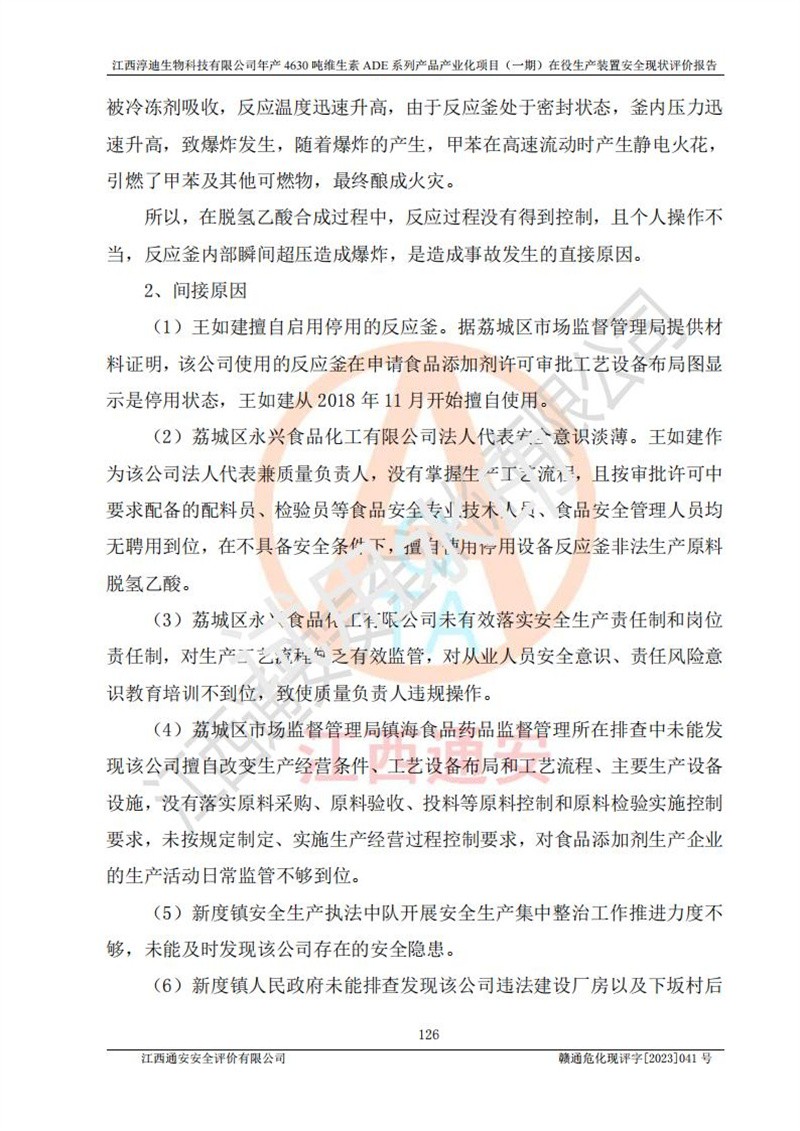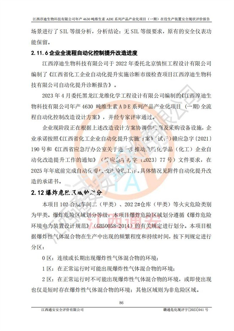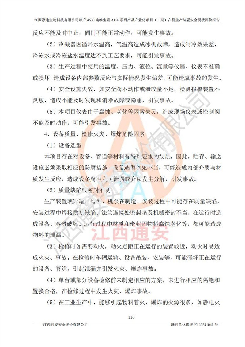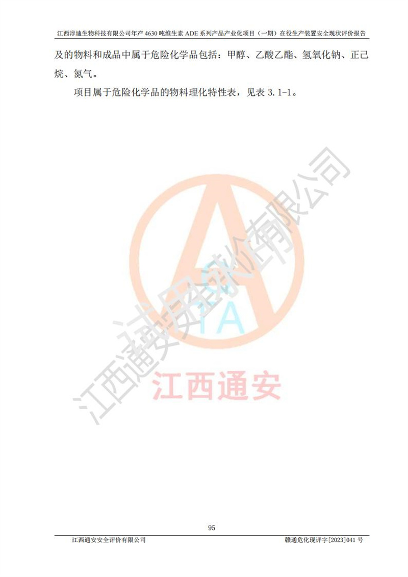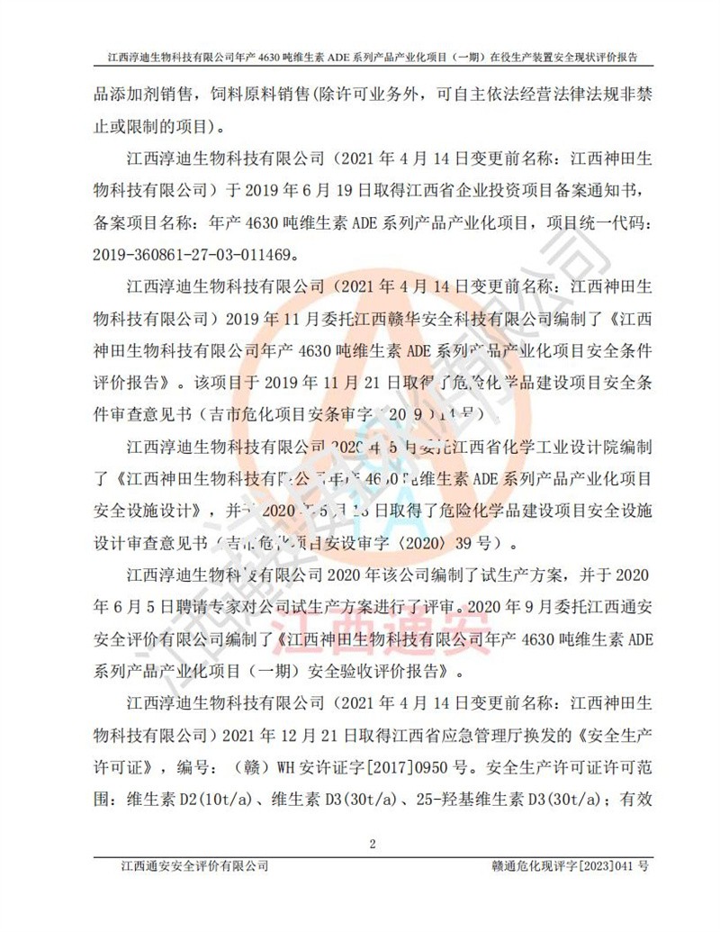 项目简介 | 江西淳迪生物科技有限公司成立于2007年,原名江西爱贞纳制药有限公司,2018年5月11日,为了适应市场需求和企业发展,该公司更名为江西神田生物科技有限公司。2021年4月14日,该公司再次更名为江西淳迪生物科技有限公司。 2021年12月6日江西淳迪生物科技有限公司法定**人由朱飞轮变更为王英增,并将投资人由海南盛健投资有限公司、江西宇能制药有限公司共同持股变更为海南盛健投资有限公司单独持股。2022年3月30日江西淳迪生物科技有限公司将经营范围变更为:药品生产饲料生产,饲料添加剂生产,食品添加剂生产,兽药生产(依法须经批准的项目,经相关部门批准后方可开展经营活动)一般项目:进出口代理,技术进出口货物进出口,**化学产品制造(不含危险化学品)(除许可业务外,可自主依法经营法律法规非禁止或限制的项);投资人由海南盛健投资有限公司变更为湖南科瑞生物制药股份有限公司,海南盛健医药科技有限公司共同投资;企业类型由有限责任公司(非自然人投资或控股的法人独资)变更为其他有限责任公司。 江西淳迪生物科技有限公司位于江西省**井冈山经济技术开发区,成立于2007年4月24日,并取得吉安市市场监督管理局井冈山经济技术开发区分局颁发的营业执照,注册资本叁仟万元整,法定**人王英增,公司类型为其他有限责任公司,统一社会信用代码:913608057994888273,经营范围:许可项目:药品生产,饲料生产,饲料添加剂生产,食品添加剂生产,兽药生产(依法须经批准的项目,经相关部门批准准后方可开展经营活动)一般项目:进出口代理,技术进出口,货物进出口,**化学产品制造(不含危险化学品),生物饲料研发,生物化工产品技术研发,畜牧渔业饲料销售,饲料添加剂销售,食品添加剂销售,饲料原料销售(除许可业务外,可自主依法经营法律法规非禁止或限制的项目)。 江西淳迪生物科技有限公司(2021年4月14日变更前名称:江西神田生物科技有限公司)于2019年6月19日取得江西省企业投资项目备案通知书,备案项目名称:年产4630吨维生素ADE系列产品产业化项目,项目统一代码:2019-360861-27-03-011469。 江西淳迪生物科技有限公司(2021年4月14日变更前名称:江西神田生物科技有限公司)2019年11月委托江西赣华安全科技有限公司编制了《江西神田生物科技有限公司年产4630吨维生素ADE系列产品产业化项目安全条件评价报告》。该项目于2019年11月21日取得了危险化学品建设项目安全条件审查意见书(吉市危化项目安条审字﹝2019﹞14号)。 江西淳迪生物科技有限公司2020年5月委托江西省化学工业设计院编制了《江西神田生物科技有限公司年产4630吨维生素ADE系列产品产业化项目安全设施设计》,并于2020年5月13日取得了危险化学品建设项目安全设施设计审查意见书(吉市危化项目安设审字〈2020〉39号)。 江西淳迪生物科技有限公司2020年该公司编制了试生产方案,并于2020年6月5日聘请专家对公司试生产方案进行了评审。2020年9月委托江西通安安全评价有限公司编制了《江西神田生物科技有限公司年产4630吨维生素ADE系列产品产业化项目(一期)安全验收评价报告》。 本项目生产过程中属于危险化学品的有:甲醇、乙酸乙酯、氢氧化钠、正己烷、氮气,其中甲醇、乙酸乙酯属于重点监管的危险化学品。 本项目不涉及重点监管的危险化工工艺。 本项目生产单元和储存设施单元不构成危险化学品重大危险源。 | |||