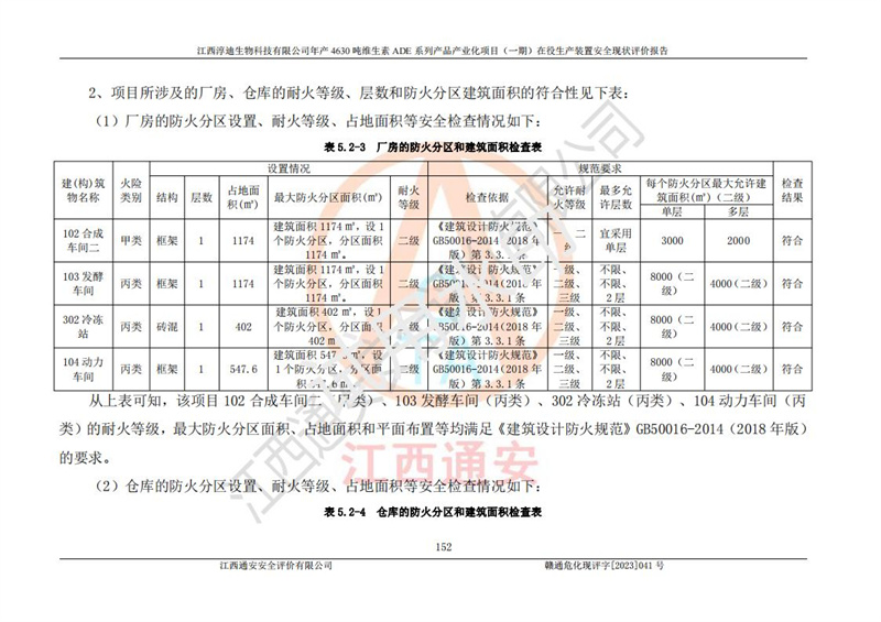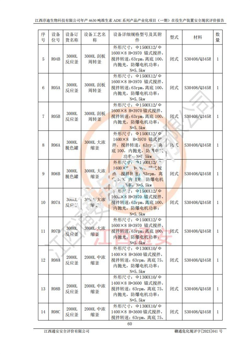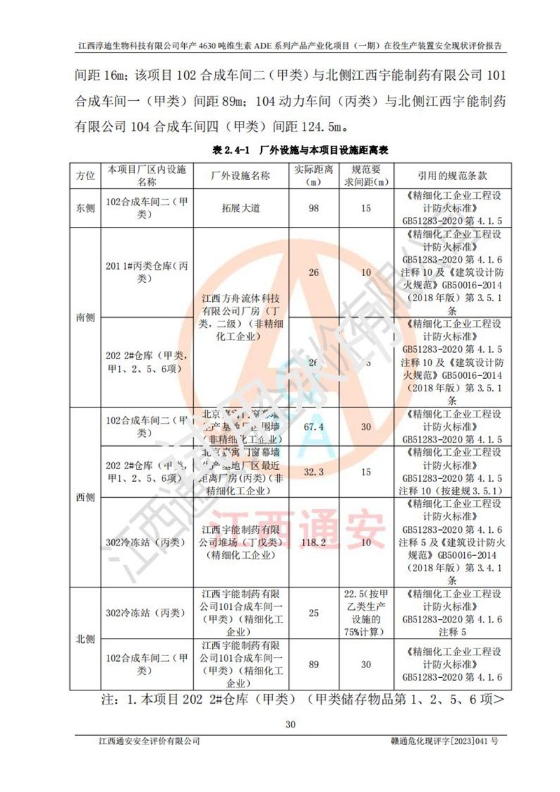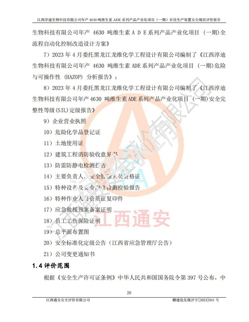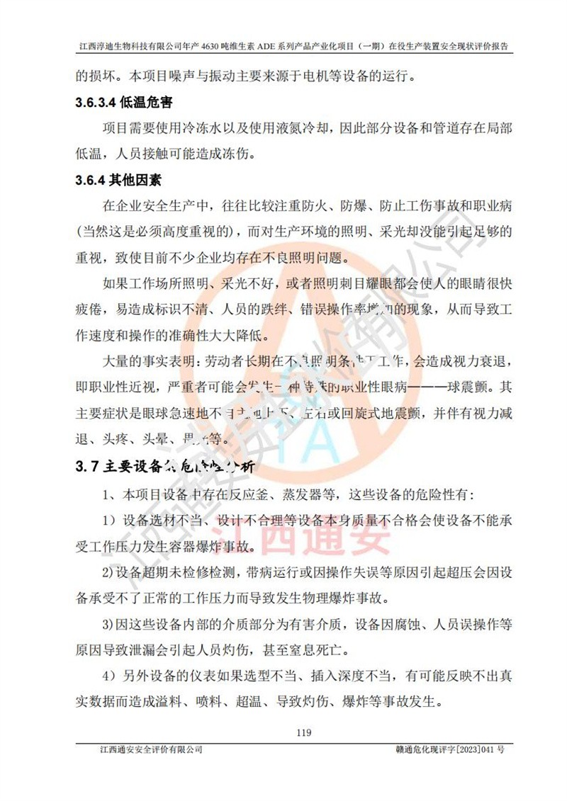 项目简介 | 江西淳迪生物科技有限公司成立于2007年,原名江西爱贞纳制药有限公司,2018年5月11日,为了适应市场需求和企业发展,该公司更名为江西神田生物科技有限公司。2021年4月14日,该公司再次更名为江西淳迪生物科技有限公司。 2021年12月6日江西淳迪生物科技有限公司法定**人由朱飞轮变更为王英增,并将投资人由海南盛健投资有限公司、江西宇能制药有限公司共同持股变更为海南盛健投资有限公司单独持股。2022年3月30日江西淳迪生物科技有限公司将经营范围变更为:药品生产饲料生产,饲料添加剂生产,食品添加剂生产,兽药生产(依法须经批准的项目,经相关部门批准后方可开展经营活动)一般项目:进出口代理,技术进出口货物进出口,**化学产品制造(不含危险化学品)(除许可业务外,可自主依法经营法律法规非禁止或限制的项);投资人由海南盛健投资有限公司变更为湖南科瑞生物制药股份有限公司,海南盛健医药科技有限公司共同投资;企业类型由有限责任公司(非自然人投资或控股的法人独资)变更为其他有限责任公司。 江西淳迪生物科技有限公司位于江西省**井冈山经济技术开发区,成立于2007年4月24日,并取得吉安市市场监督管理局井冈山经济技术开发区分局颁发的营业执照,注册资本叁仟万元整,法定**人王英增,公司类型为其他有限责任公司,统一社会信用代码:913608057994888273,经营范围:许可项目:药品生产,饲料生产,饲料添加剂生产,食品添加剂生产,兽药生产(依法须经批准的项目,经相关部门批准准后方可开展经营活动)一般项目:进出口代理,技术进出口,货物进出口,**化学产品制造(不含危险化学品),生物饲料研发,生物化工产品技术研发,畜牧渔业饲料销售,饲料添加剂销售,食品添加剂销售,饲料原料销售(除许可业务外,可自主依法经营法律法规非禁止或限制的项目)。 江西淳迪生物科技有限公司(2021年4月14日变更前名称:江西神田生物科技有限公司)于2019年6月19日取得江西省企业投资项目备案通知书,备案项目名称:年产4630吨维生素ADE系列产品产业化项目,项目统一代码:2019-360861-27-03-011469。 江西淳迪生物科技有限公司(2021年4月14日变更前名称:江西神田生物科技有限公司)2019年11月委托江西赣华安全科技有限公司编制了《江西神田生物科技有限公司年产4630吨维生素ADE系列产品产业化项目安全条件评价报告》。该项目于2019年11月21日取得了危险化学品建设项目安全条件审查意见书(吉市危化项目安条审字﹝2019﹞14号)。 江西淳迪生物科技有限公司2020年5月委托江西省化学工业设计院编制了《江西神田生物科技有限公司年产4630吨维生素ADE系列产品产业化项目安全设施设计》,并于2020年5月13日取得了危险化学品建设项目安全设施设计审查意见书(吉市危化项目安设审字〈2020〉39号)。 江西淳迪生物科技有限公司2020年该公司编制了试生产方案,并于2020年6月5日聘请专家对公司试生产方案进行了评审。2020年9月委托江西通安安全评价有限公司编制了《江西神田生物科技有限公司年产4630吨维生素ADE系列产品产业化项目(一期)安全验收评价报告》。 本项目生产过程中属于危险化学品的有:甲醇、乙酸乙酯、氢氧化钠、正己烷、氮气,其中甲醇、乙酸乙酯属于重点监管的危险化学品。 本项目不涉及重点监管的危险化工工艺。 本项目生产单元和储存设施单元不构成危险化学品重大危险源。 | |||