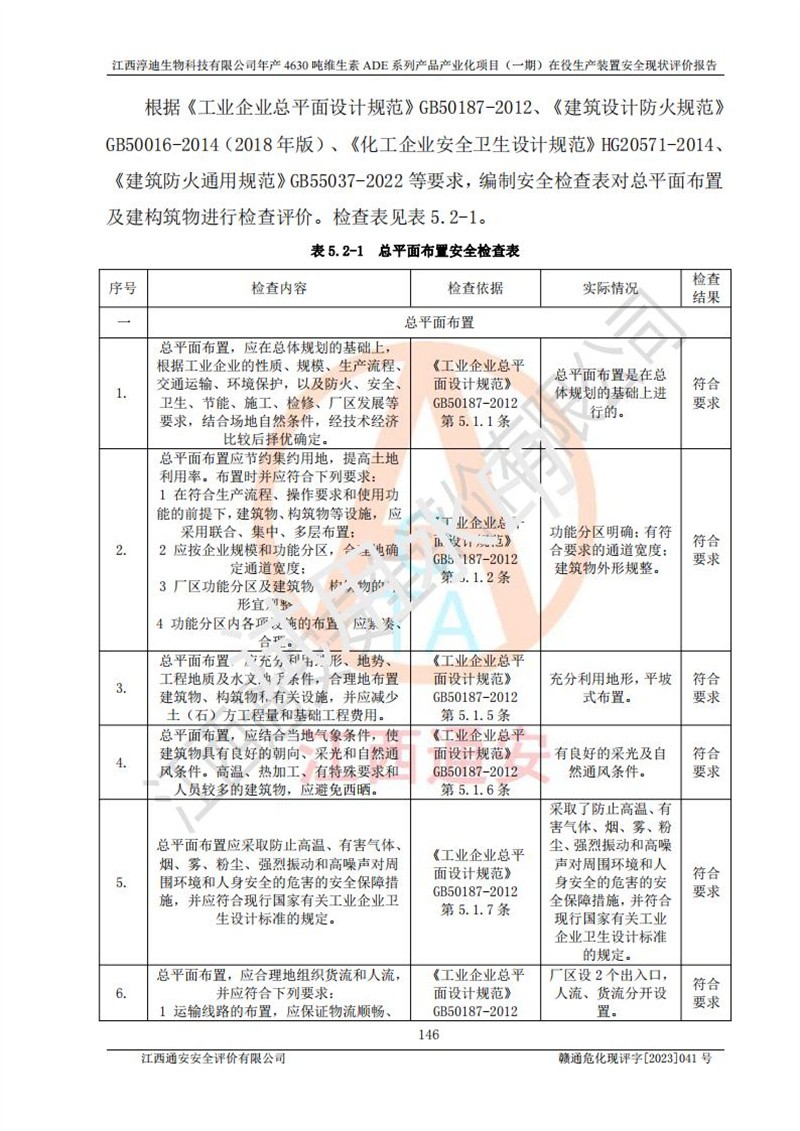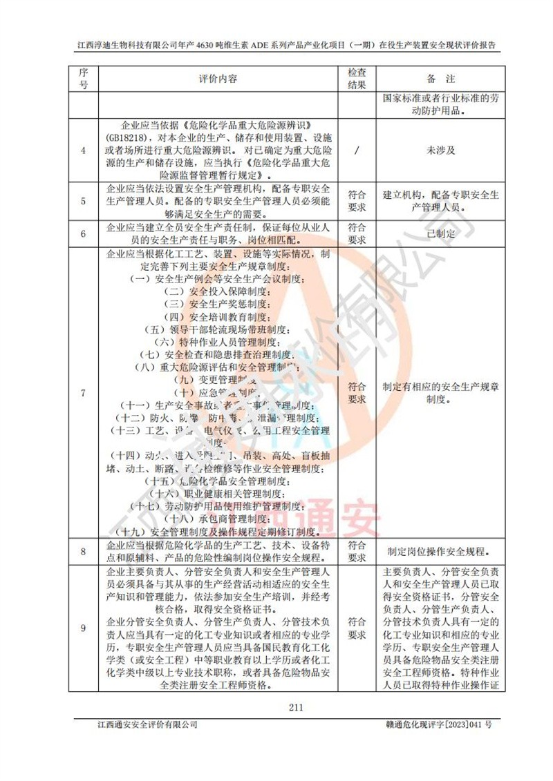 评价结论 | 江西淳迪生物科技有限公司年产4630吨维生素ADE系列产品产业化项目(一期)符合井开区园区规划;总平面布置符合《建筑设计防火规范》GB50016-2014(2018年版)等标准、规范的要求;项目采用成熟的生产工艺和设备,本质安全程度较高;同时对生产过程中存在事故危险的设施和场所采取了一系列的合理可行的防护措施和科学的管理,近期通过对存在的安全问题进行了整改,使生产过程中的危险有害因素能得到**控制。建设项目安全设施符合**现行有关法律、法规、标准的要求。 评价结论:本报告认为,江西淳迪生物科技有限公司年产4630吨维生素ADE系列产品产业化项目在役生产装置(一期)现场情况与企业提供的现状图纸一致,自动化控制系统运行正常,有关从业人员资质符合《危险化学品生产企业安全生产许可证实施办法》要求,安全设施及安全管理符合**及有关部门关于安全生产法律、法规、标准的要求,安全风险是可以控制的,其风险程度是可以接受的,安全现状符合安全生产条件,能够满足安全生产的要求。 | |||