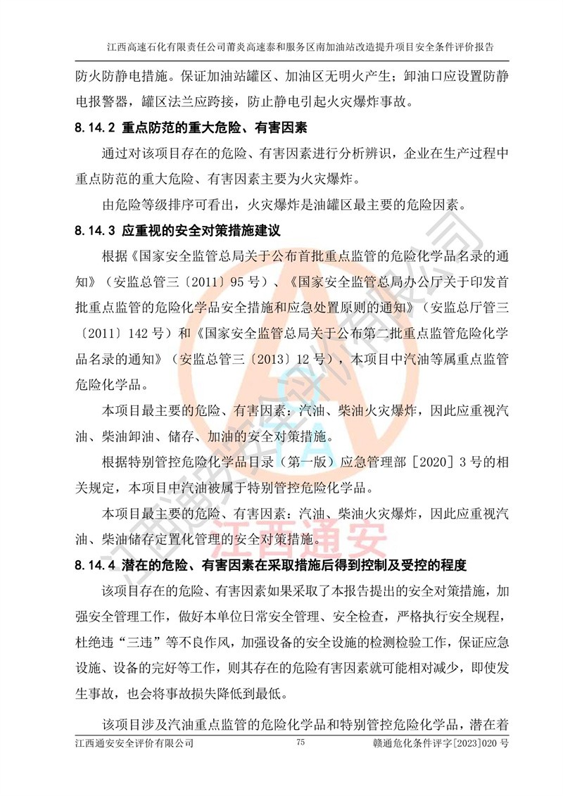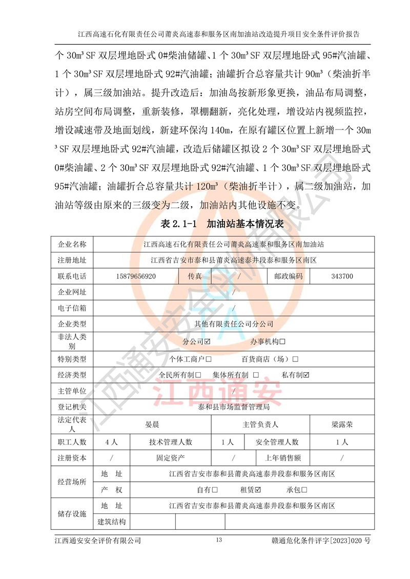 评价报告名称 | 江西高速石化有限责任公司莆炎高速泰和服务区南加油站改造提升项目 安全条件评价报告 | |||