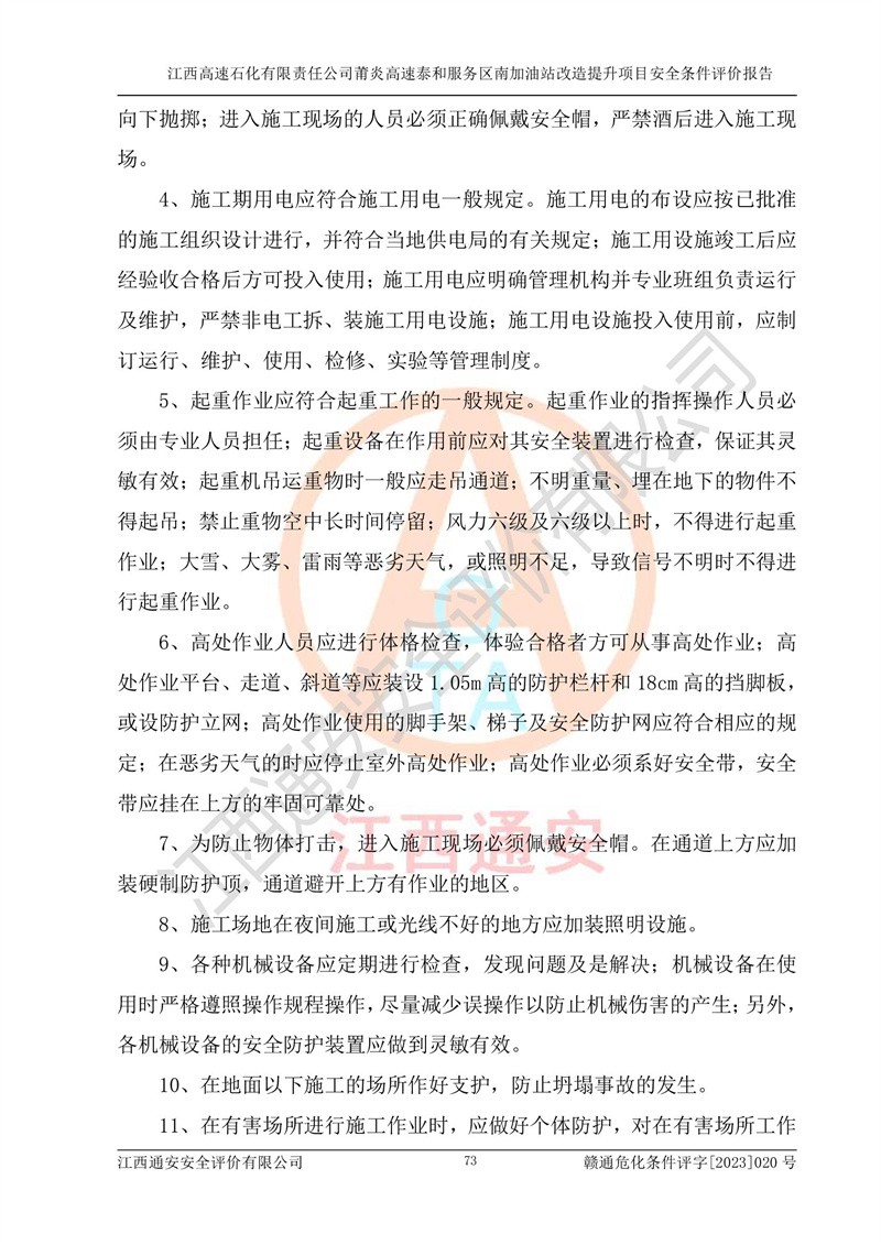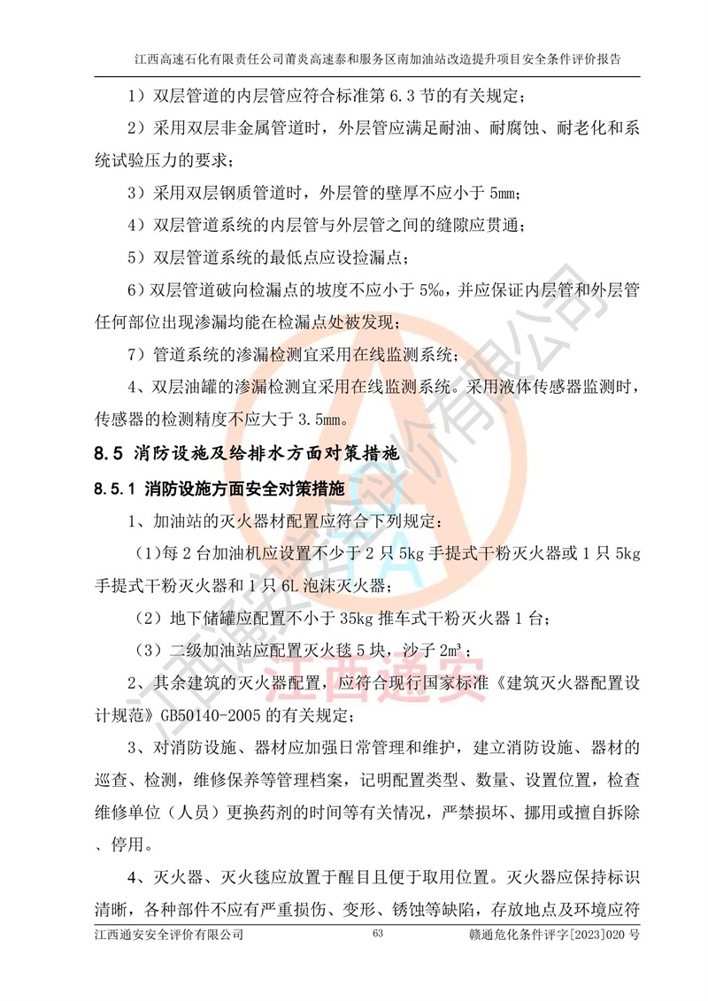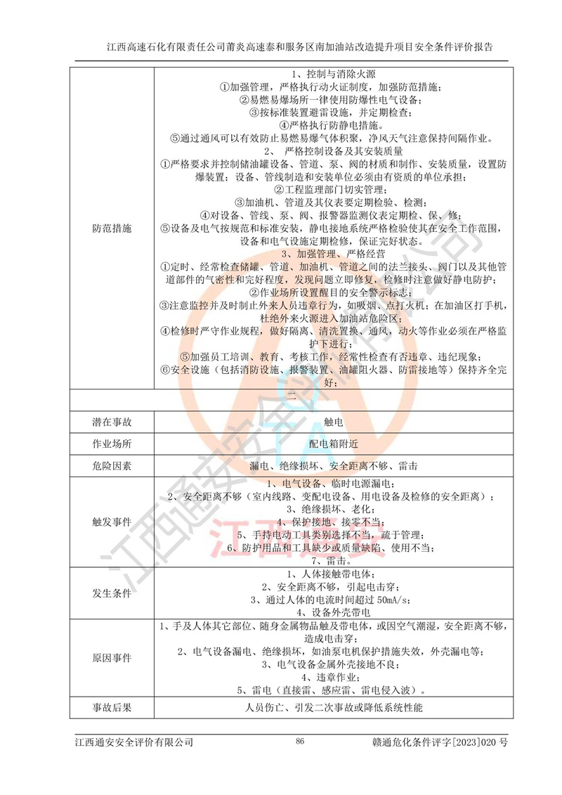 评价结论 | 1、江西高速石化有限责任公司莆炎高速泰和服务区南加油站已按照《中华人民共和国安全生产法(中华人民共和国主席令[2021]88号)》和《危险化学品建设项目安全监督管理办法》(**安监总局[2012]第45号令,2015年79号令修改)的要求进行安全条件评价,符合**和省关于危险化学品建设项目经营许可程序的要求。 2、江西高速石化有限责任公司莆炎高速泰和服务区南加油站总平面布置符合《汽车加油加气加氢站技术标准》GB50156-2021的要求。江西高速石化有限责任公司莆炎高速泰和服务区南加油站在项目建设和运行阶段,总平面布置设计、施工图设计和建设施工、安装调试及生产运行中,应严格执行**有关安全生产法律、法规和有关标准、规范,将本报告书中提出的安全对策措施落实到位,真正做到安全设施与主体工程同时设计、同时施工、同时投入生产和使用,项目建成后危险、有害因素可以得到**控制,安全风险在可接受范围,拟建的江西高速石化有限责任公司莆炎高速泰和服务区南加油站改造提升项目符合法律法规、标准、规章和规范的要求。 | |||