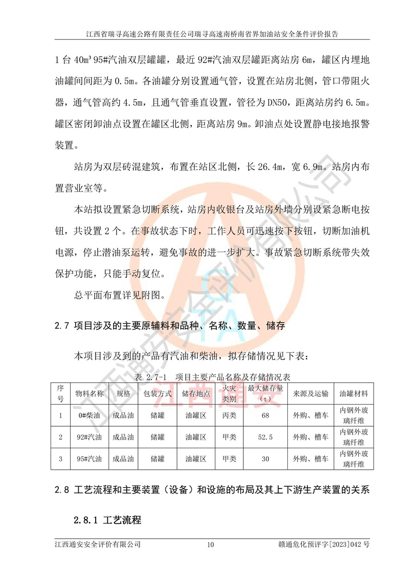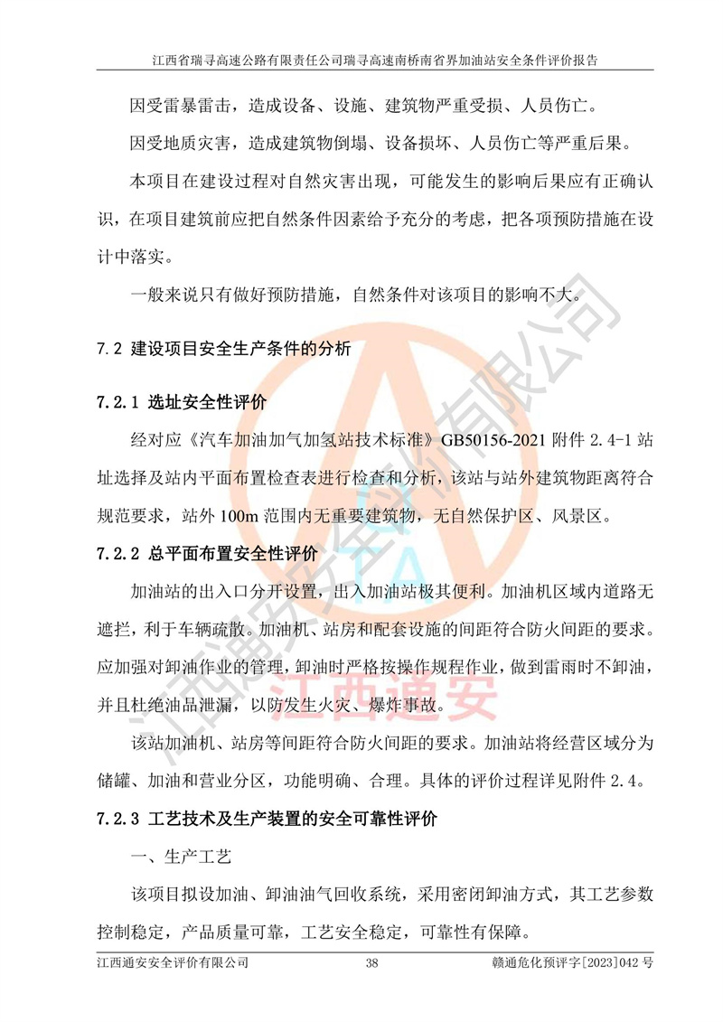 评价结论 | 江西省瑞寻高速公路有限责任公司瑞寻高速南桥南省界加油站总平面布置符合《汽车加油加气加氢站技术标准》GB50156-2021的要求。江西省瑞寻高速公路有限责任公司在项目建设和运行阶段,总平面布置设计、施工图设计和建设施工、安装调试及生产运行中,应严格执行**有关安全生产法律、法规和有关标准、规范,将本报告书中提出的安全对策措施落实到位,真正做到安全设施与主体工程同时设计、同时施工、同时投入生产和使用,项目建成后危险、有害因素可以得到**控制,安全风险在可接受范围,瑞寻高速南桥南省界加油站项目符合法律法规、标准、规章和规范的要求。 | |||