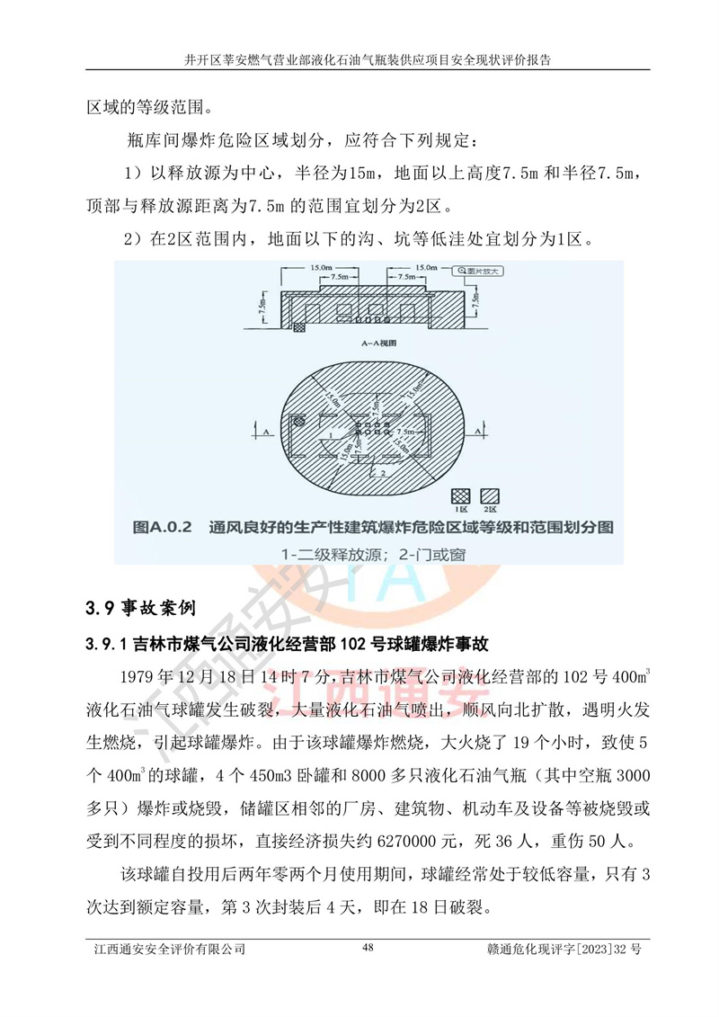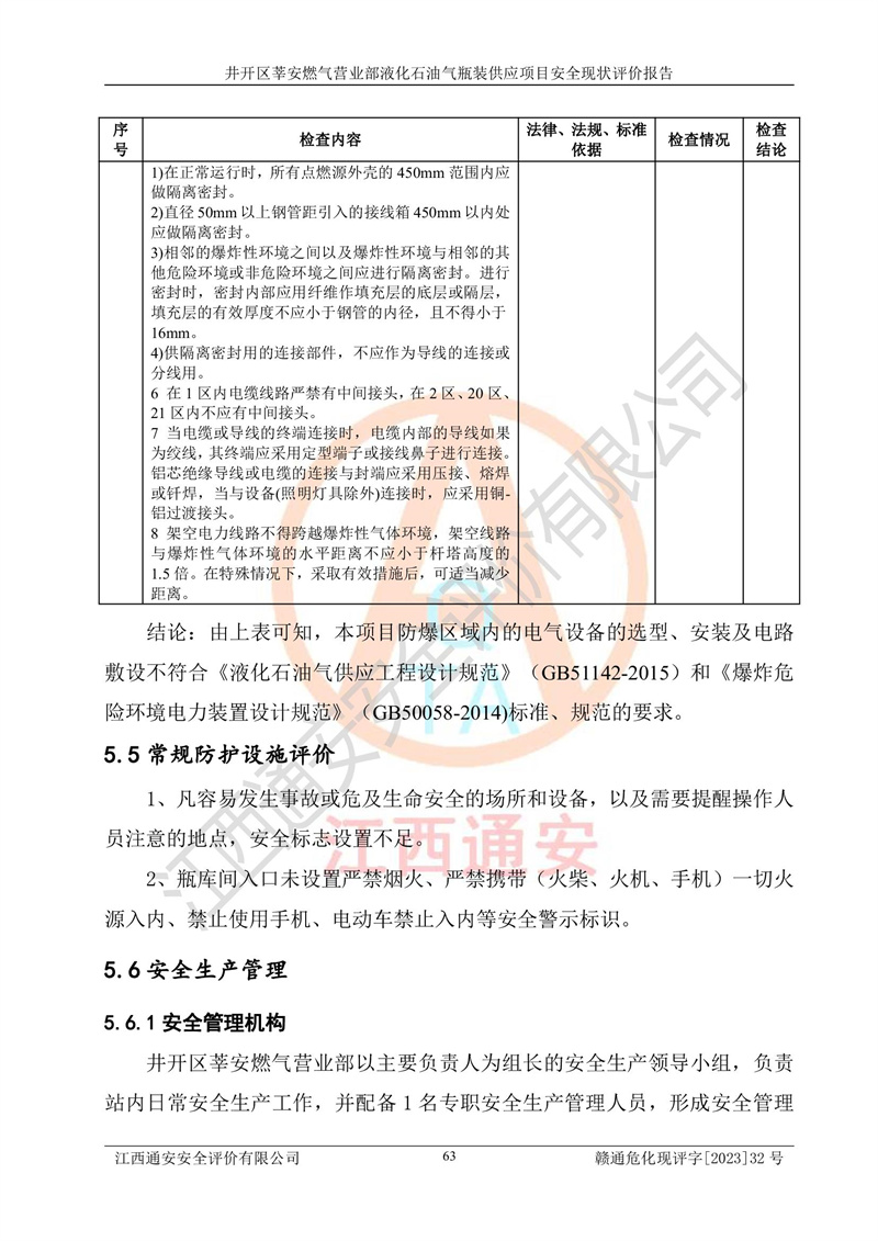 其它 | 在对该项目危险、有害因素辨识分析的基础上,运用安全检查表法(SCL)、作业条件危险性评价法、危险度评价法等评价方法对该项目进行了分析评价,评价结果如下: 1)根据《危险化学品目录[2015年版]》(**安监总局等十部门[2015]第5号)等文件进行辨识:本项目涉及的液化石油气属于危险化学品。 2)根据《危险化学品重大危险源辨识》(GB18218-2018)的标准进行辨识,本项目涉及的液化石油气属于重大危险源辨识范围内的化学品。对本项目经营储存的危险化学品进行重大危险源辨识的结果得知:井开区莘安燃气营业部液化石油气瓶装供应项目储存和经营的液化石油气不构成危险化学品重大危险源。 3)根据《**安全监管总局关于公布首批重点监管的危险化学品名录的通知》安监总管三[2011] 95号、《**安全监管总局关于公布第二批重点监管危险化学品名录的通知》安监总管三[2013] 12号进行辨识:本项目涉及的液化石油气属于重点监管的危险化学品。 4)根据《易制毒化学品管理条例(2014年修订)》(***令第703号修改)及附表规定、中华人民共和国公安部 中华人民共和国商务部、**卫生和计划生育委员会、中华人民共和国海关总署、**安全生产监督管理总局、**食品药品监督管理总局《关于将4-苯胺基-N-苯乙基哌啶、N-苯乙基-4-哌啶酮、N-甲基-1-苯基-1-氯-2-丙胺、溴素、1-苯基-1-**5种物质列入易制毒化学品管理的公告》(国办函[2017]第120号)、《***办公厅关于同意将1-苯基-2-溴-1-**和3-氧-2-苯基丁腈列入易制毒化学品品种目录的函》(国办函[2014]第40号)、《***办公厅关于同意将α-苯乙酰乙酸甲酯等6种物质列入易制毒化学品品种目录的函》(国办函〔2021〕58号)等进行辨识:本项目不涉及易制毒化学品。 5)根据《中华人民共和国监控化学品管理条例》(2011年修正本)(中华人民共和国***令第588号修改)及《各类监控化学品名录》(中华人民共和国工业和信息化部令第52号;2020年)、《列入第三类监控化学品的新增品种清单》(**石油和化学工业局令第1号)等规定进行辨识:本项目不涉及监控化学品。 6)根据《危险化学品目录(2015版)》(**安全生产监督管理局等十部门公告[2015]第5号)辨识,本项目不涉及剧毒化学品。 7)根据《高毒物品目录》(卫法监发[2003]142号)进行辨识,本项目不涉及高毒物品。 8)根据公安部编制的《易制爆危险化学品名录》(2017 年版)辨识,本项目不涉及易制爆危险化学品。 9)根据《特别管控危险化学品目录(**版)》(应急管理部、工业和信息化部、公安部、交通运输部公告(2020年 第3号))进行辨识:本项目涉及的液化石油气属于特别管控危险化学品。 10)本项目经营过程中存在的危险有害因素有:火灾爆炸、电气伤害、物体打击、**伤害、高处坠落等;主要的危险有害因素为火灾爆炸。 11)经采用作业条件危险性评价法(LEC)进行分析,在选定的液化石油气瓶装卸作业单元中火灾、爆炸危险性等级为“**危险,不能继续作业”,**伤害和配电作业单元中的触电、火灾危险性均为“一般危险,需要注意”。 12)经采用危险度评价法分析:瓶库间危险度为Ⅱ级,属中度危险。 评价结论:吉安县国安液化气站储存、经营液化石油气项目的选址、周边环境、总平面布置、设备设施不符合**相关标准规范的要求,所涉及的设备设施安全防护装置和措施、公用工程和辅助设施以及安全生产管理在正常生产经营过程中不满足安全生产的要求。 综上所述,井开区莘安燃气营业部液化石油气瓶装供应项目安全生产现状不符合安全生产的要求。 | ||||
