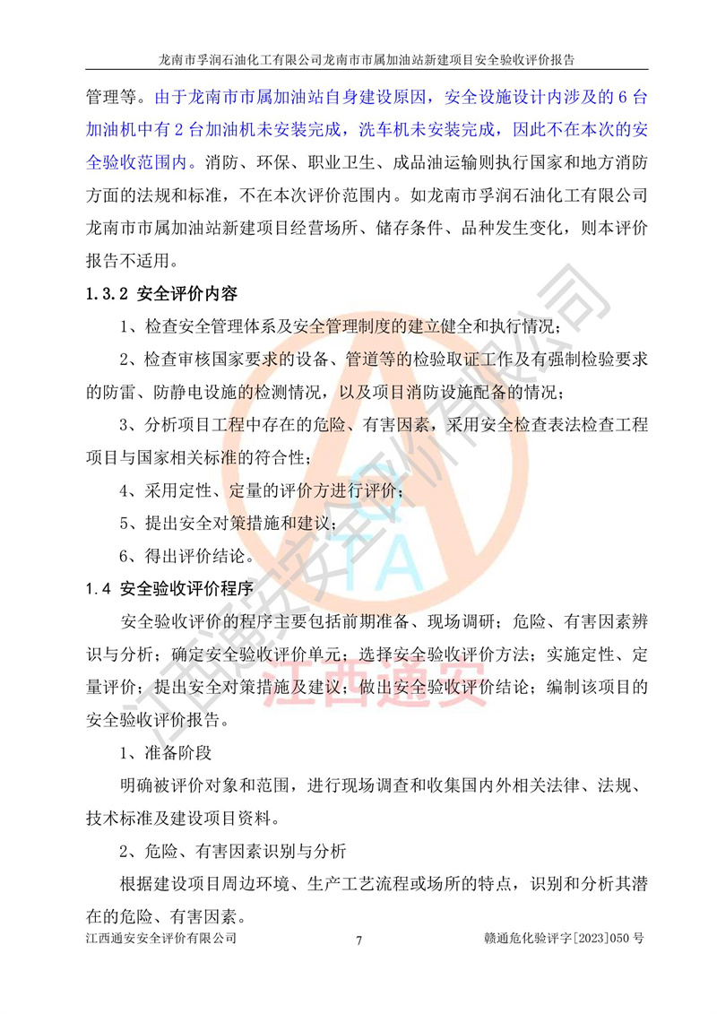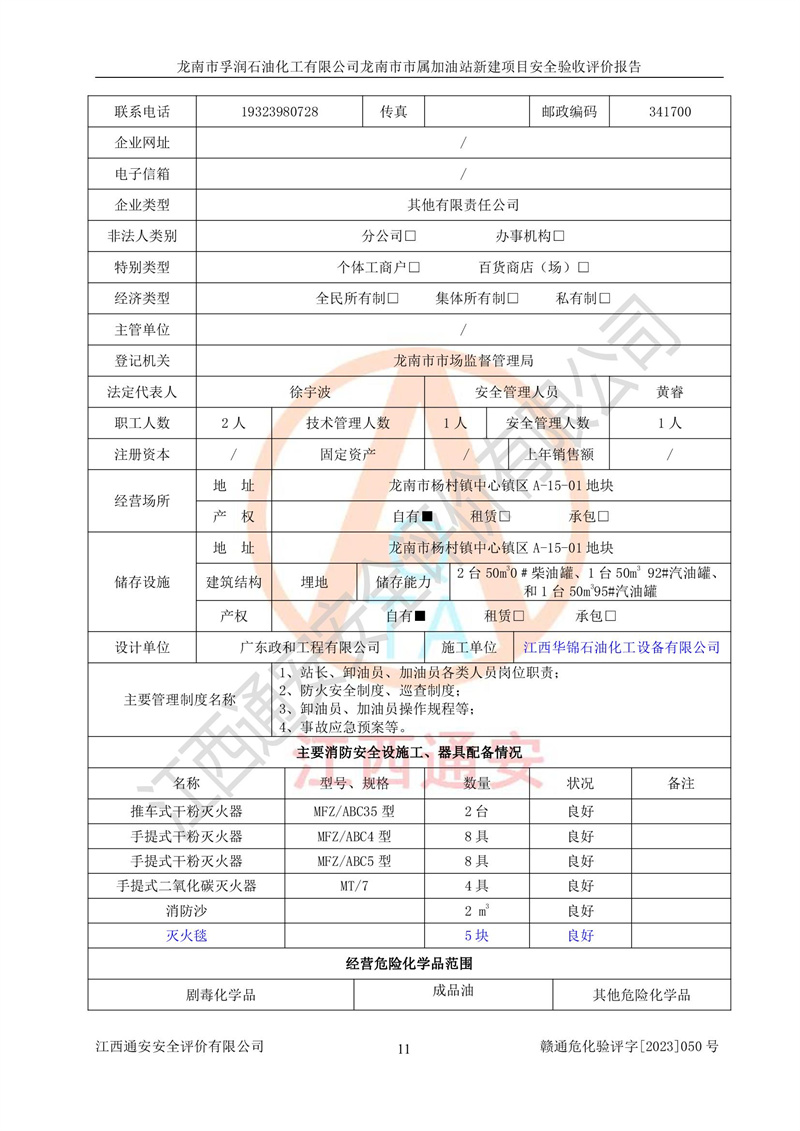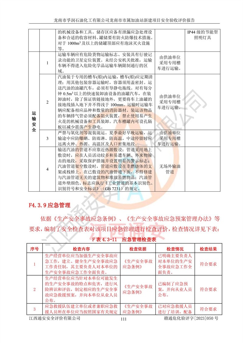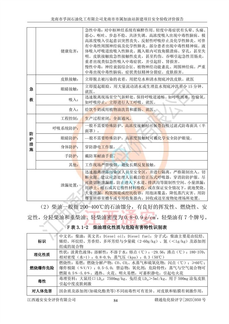1、龙南市市属加油站新建项目为成品油零售企业,属于二级加油站,油罐区为主要危险源。该加油站不构成危险化学品重大危险源。 2、龙南市市属加油站新建项目所经营的汽油属于重点监管危险化学品,应加强安全管理,根据“汽油安全措施和应急处理原则”要求的措施进行检查,加油站设置了视频监控系统、具有液位报警功能的液位监测系统、渗漏检测,并制定各种管理制度和操作规程,已落实到位。 3、通过本报告分析,该项目投入经营后仍将面对多种危险因素,如火灾,爆炸、中毒、电气伤害、**伤害、噪声等危险有害因素。而项目*主要的危险、有害因素是火灾、爆炸,对此,加油站全体员工**保持**的安全防护意识。 4、项目公用工程能够满足安全经营的基本需要。 5、该加油站内部平面布置符合**和行业相关标准、规范的要求。建筑结构、消防、安全设施等布置明确、合理,符合各相关规范的要求。 6、加油站取得了雷电防护装置检测报告。 7、项目油罐、通气管口和加油机与外部环境的防火距离、平面布置、消防安全设施和措施满足法律法规、标准规范的要求。电气防爆保护、机械设备的安全保护等方面的安全设施建立**。 8、作业条件危险性评价结果:在选定的3个单元的危险程度为“一般危险、需要注意”或“稍有危险,可以接受”,且一般危险或稍有危险作业环境的出现均由物料的危险程度所决定,作业条件相对安全。 9、危险度评价结果:油罐区得分为17分,为Ⅰ级,属于**危险。加油站油罐安装高液位报警功能的液位监测系统,当油料达到油罐容量90%时,触动高液位报警装置,油料达到油罐容量95%时,自动停止油料继续进罐。同时,也采取了防止油品渗漏的保护措施,降低火灾爆炸危险,满足安全经营条件要求。 10、加油站建立了安全责任制,制定了安全管理制度、操作规程,编制了事故应急预案,配备了应急救援器材,按要求定期进行相关培训及演练。 11、该项目不涉及重大生产安全事故隐患,安全经营条件符合《危险化学品经营许可证管理办法》的要求。 龙南市孚润石油化工有限公司龙南市市属加油站新建项目具备**有关安全生产法律、法规、部门规章及标准规范要求的安全条件,符合经营和储存危险化学品(汽油、柴油)的安全条件要求,具备安全验收的条件。 |