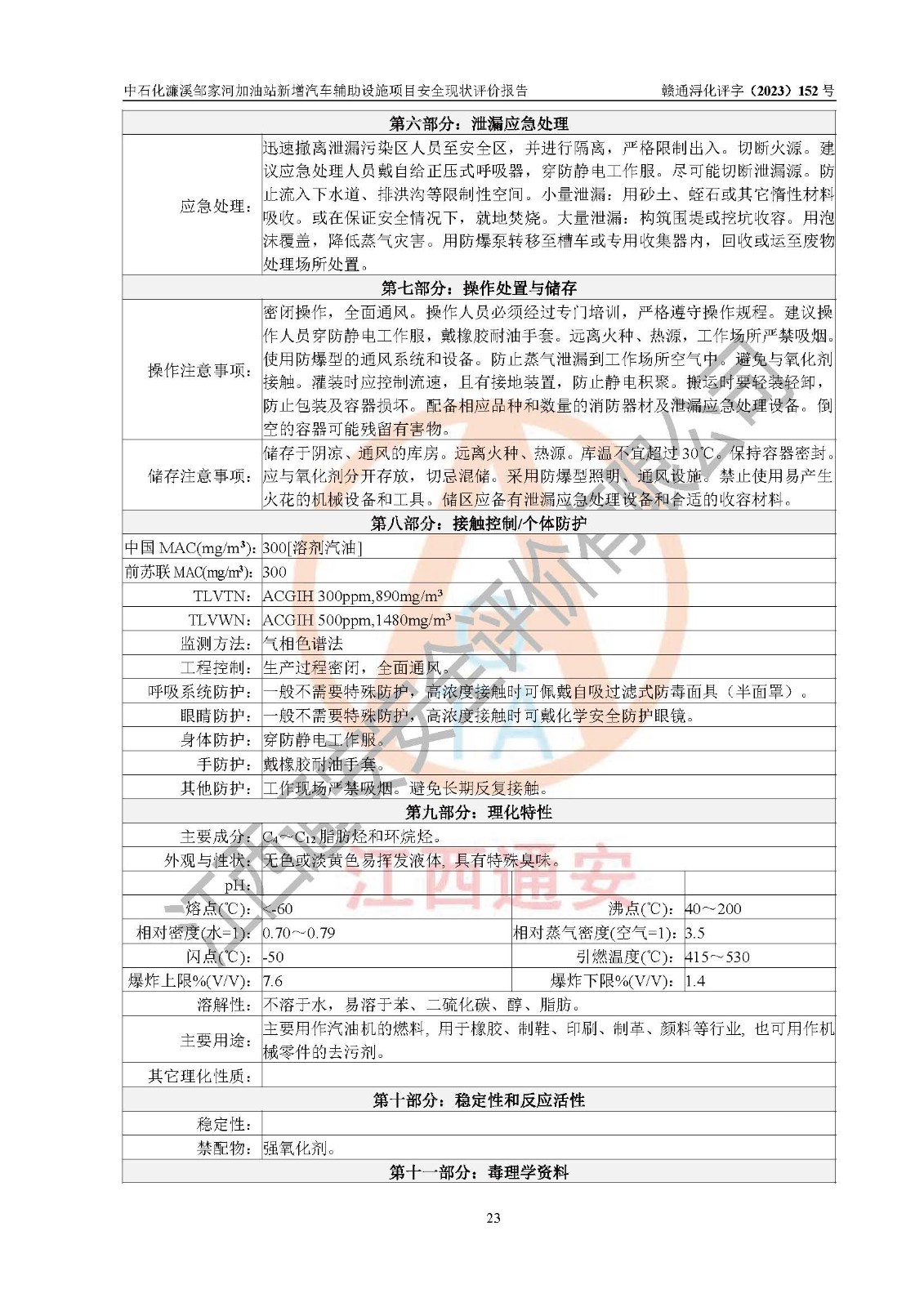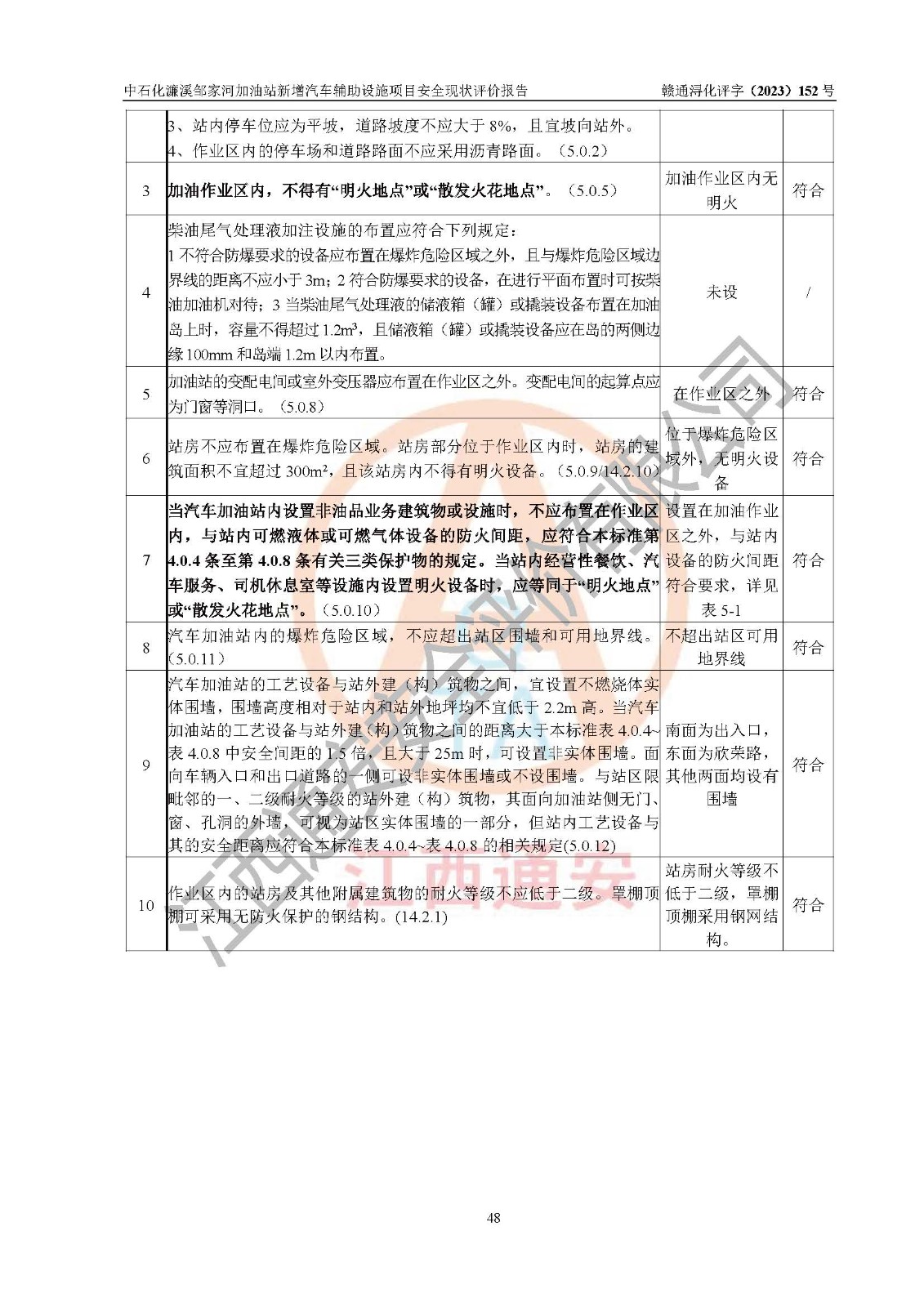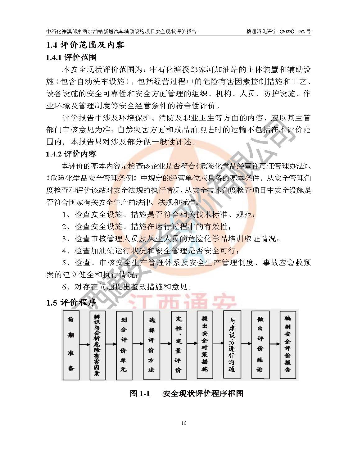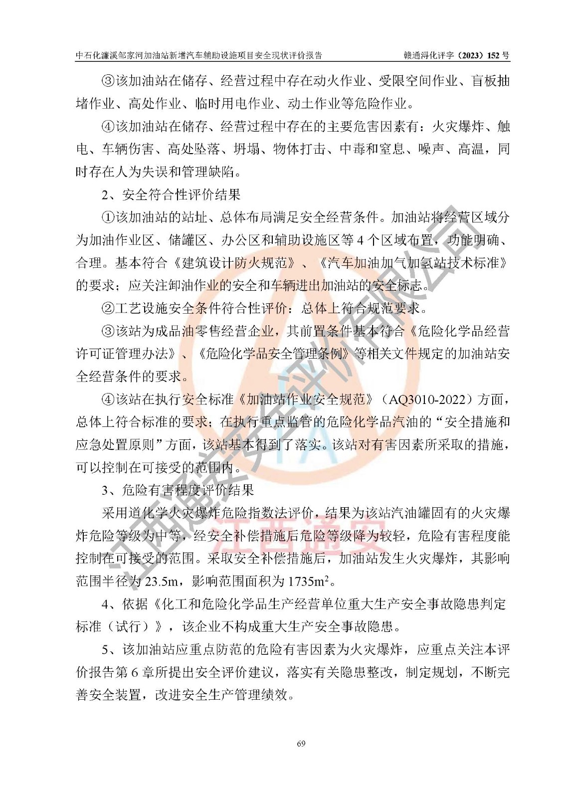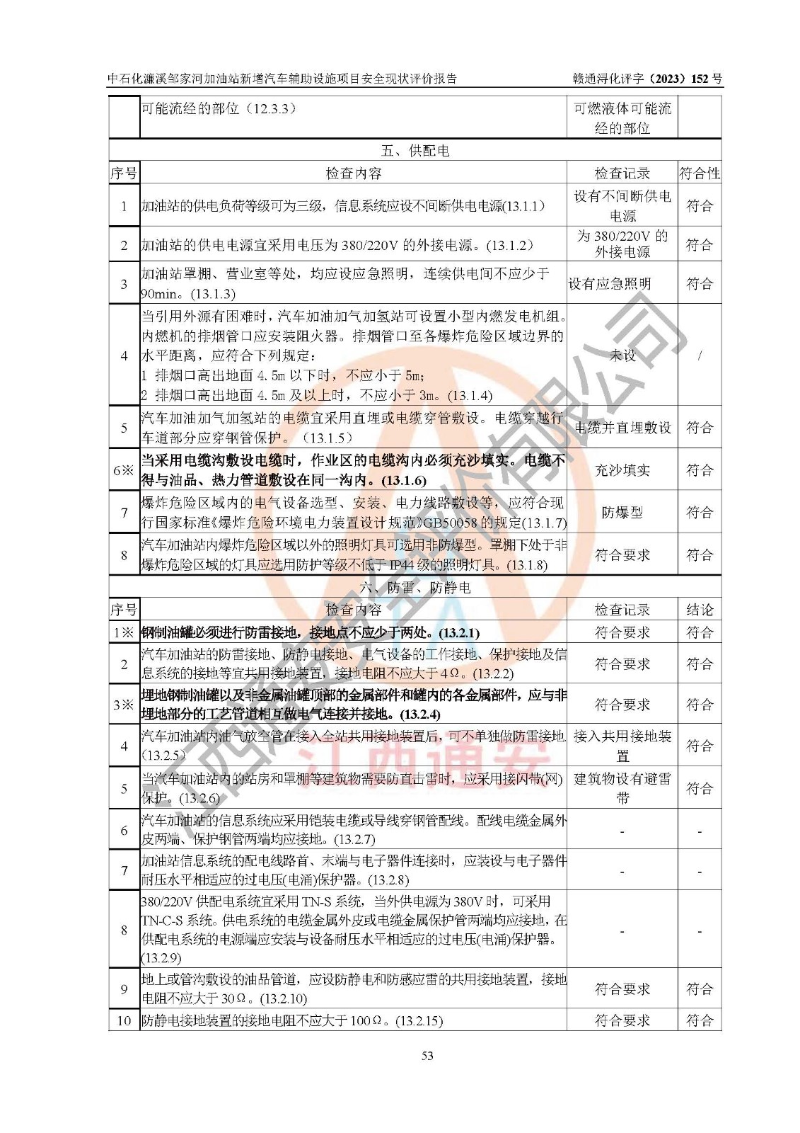 评价结论 | 中国石化销售股份有限公司江西九江濂溪石油分公司邹家河加油站新增汽车辅助设施项目涉及的安全条件、安全经营条件、安全生产管理符合《危险化学品经营许可证管理办法》、《汽车加油加气加氢站技术标准》等**有关法规、标准、规范要求,能满足危险化学品经营安全条件。 | |||