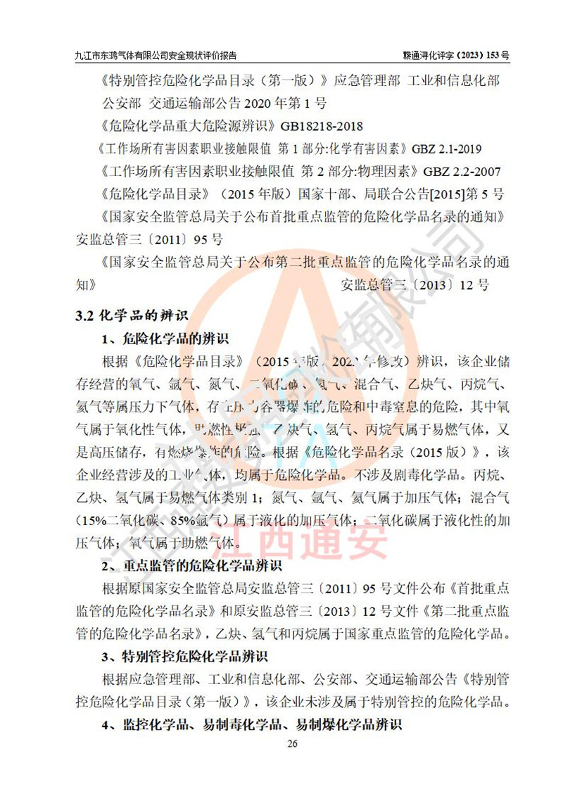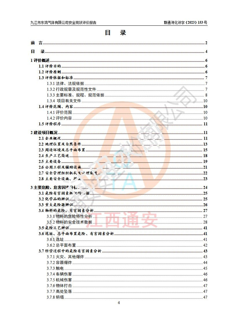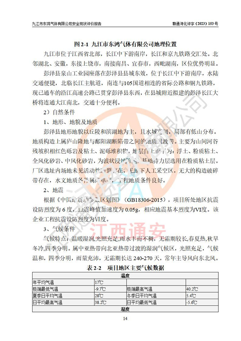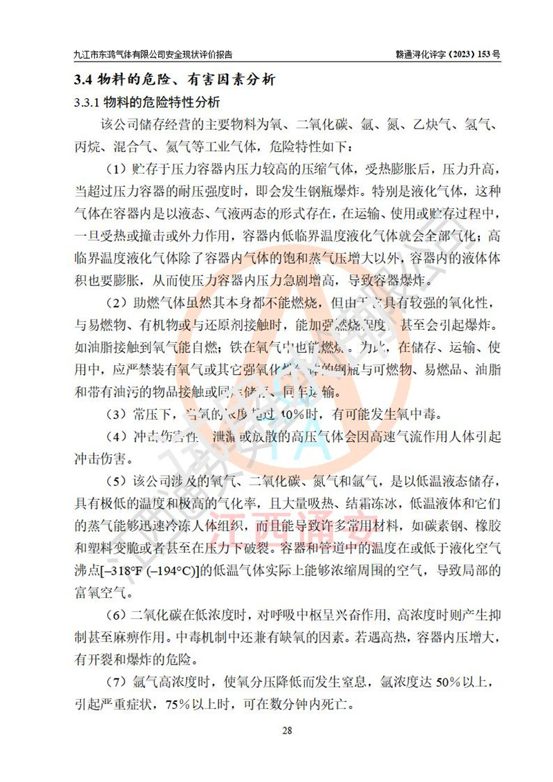 项目简介 | 九江市东鸿气体有限公司是一家从事储存经营液氧、液氩、液氮、液态二氧化碳、乙炔气、氢气、丙烷气、混合气(Ar+CO2)、氦气等工业气体的有限责任公司(自然人投资或控股),企业住所位于江西省九江市彭泽县泉山工业园,注册资本伍佰壹拾万元整。现有员工21人,其中安全管理人员2人,法定**人祝东华。 该公司占地面积为9327.9m2,该企业在储存、经营过程中涉及的危险化学品有液氧、液氩、液氮、液二氧化碳、乙炔气、氢气、丙烷气、氦气以及工业用混合气(Ar+CO2)。该公司现有液氧、液氩、液氮、液二氧化碳立式储罐各1台,从事储存及灌装经营;设有1个甲类仓库,从事乙炔气、氢气、丙烷气、氦气以及工业用混合气(Ar+CO2)等工业气体储存经营。企业经营过程中涉及的工业气体均已列入《危险化学品目录(2015年版,2022年修改)》。该公司于2021年02月27日由九江市应急管理局签发的《危险化学品经营许可证》(证号:赣九危化经字 [2021]000381号),**期至2024年02月26日。 根据《危险化学品经营许可证管理办法》(**安监总局第55号令,第79号令修改)以及《江西省安全生产监督管理局关于贯彻﹤危险化学品经营许可证管理办法﹥的通知》(赣安监管二字﹝2013﹞14号)的要求,危险化学品经营许可证的**期为3年。**期满后,企业需要继续从事危险化学品经营活动的,应当在危险化学品经营许可证**期满3个月前,向发证机关提出危险化学品经营许可证的延期申请。申请证照延期的所有储存、经营危险化学品的单位,应当提供安全评价报告。九江市东鸿气体有限公司目前正在做危险化学品经营许可证延期换证的准备工作,故委托江西通安安全评价有限公司承担其安全经营条件现状评价工作。 江西通安安全评价有限公司接受委托后,组织了评价小组。根据相关法律、法规和标准的规定,于2023 年12月勘察了企业经营场所。在对委托方相关装置的运行及其安全管理的现状进行充分了解后,充分查找了其存在的危险、有害因素种类和危险危害程度;对存在的问题,评价组成员和委托方的陪同人员进行了及时的沟通,并提出了整改措施;企业及时完成了整改。评价小组在委托方提供的有关技术和管理资料基础上,按照《安全评价通则》(AQ8001-2007)的要求,依据**有关法律、法规、标准和规范,采用合适的安全评价方法,编制完成了本安全评价报告,以作为企业安全生产技术与安全生产管理决策及应急管理部门实施监督管理提供安全技术依据。 本次安全评价范围,九江市东鸿气体有限公司储存经营工业气体的储存装置和辅助设施,以及充装过程中设备设施的安全技术措施和安全管理措施。包括储存经营过程中的危险有害因素、安全生产条件以及工艺、设备设施的安全可靠性和安全管理的组织、机构、人员、防护设施、作业环境、管理制度等。 项目涉及的环境保护、消防、职业卫生等问题则应执行**的有关规定及相关标准。本评价引用到的**、消防、职业卫生等方面的法规标准与安全评价有**的关联,环境保护、职业卫生与消防应以其主管部门审核意见为准。 | ||||||