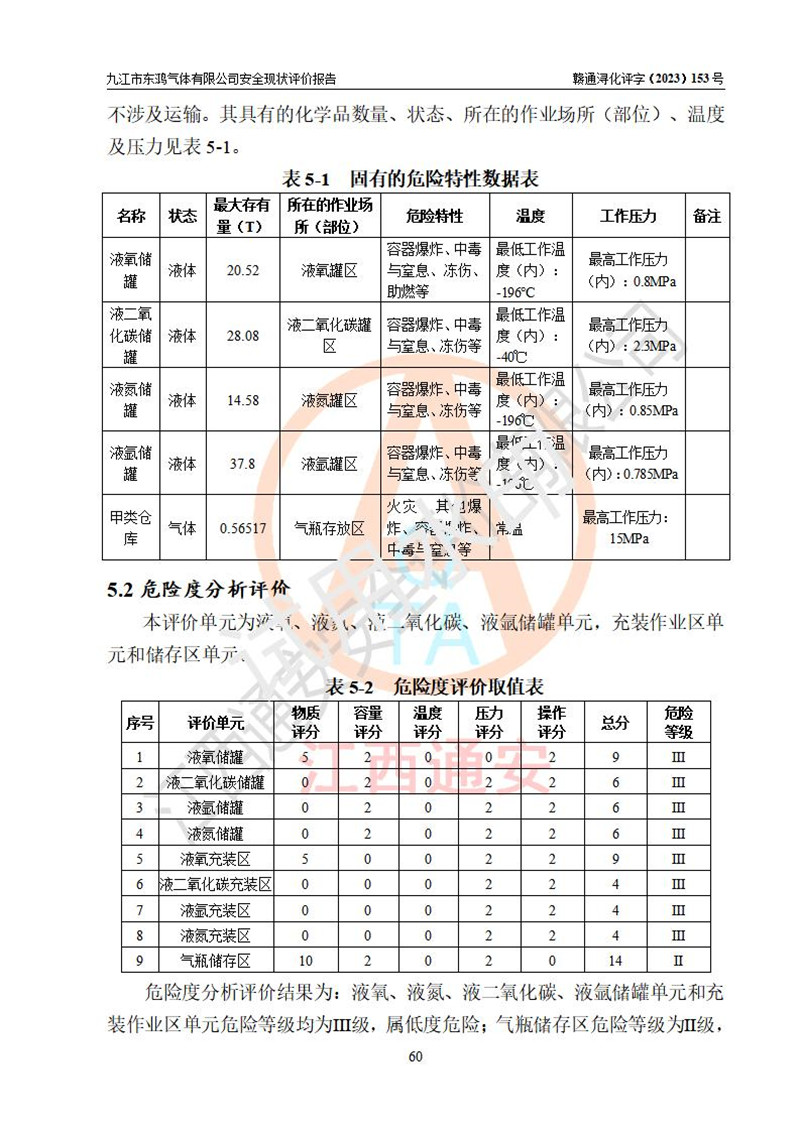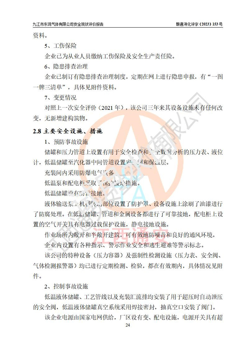 评价结论 | 综上所述:九江市东鸿气体有限公司外部防护距离和总平面布局符合《建筑设计防火规范2018年版》(GB50016-2014 )、《氧气站设计规范》(GB50030-2013)等标准规范要求,其他方面按相关法规、规范要求采取了相应的技术设施和安全管理措施,其风险可控,能达到可以接受的程度,可满足安全生产条件。 | ||||||