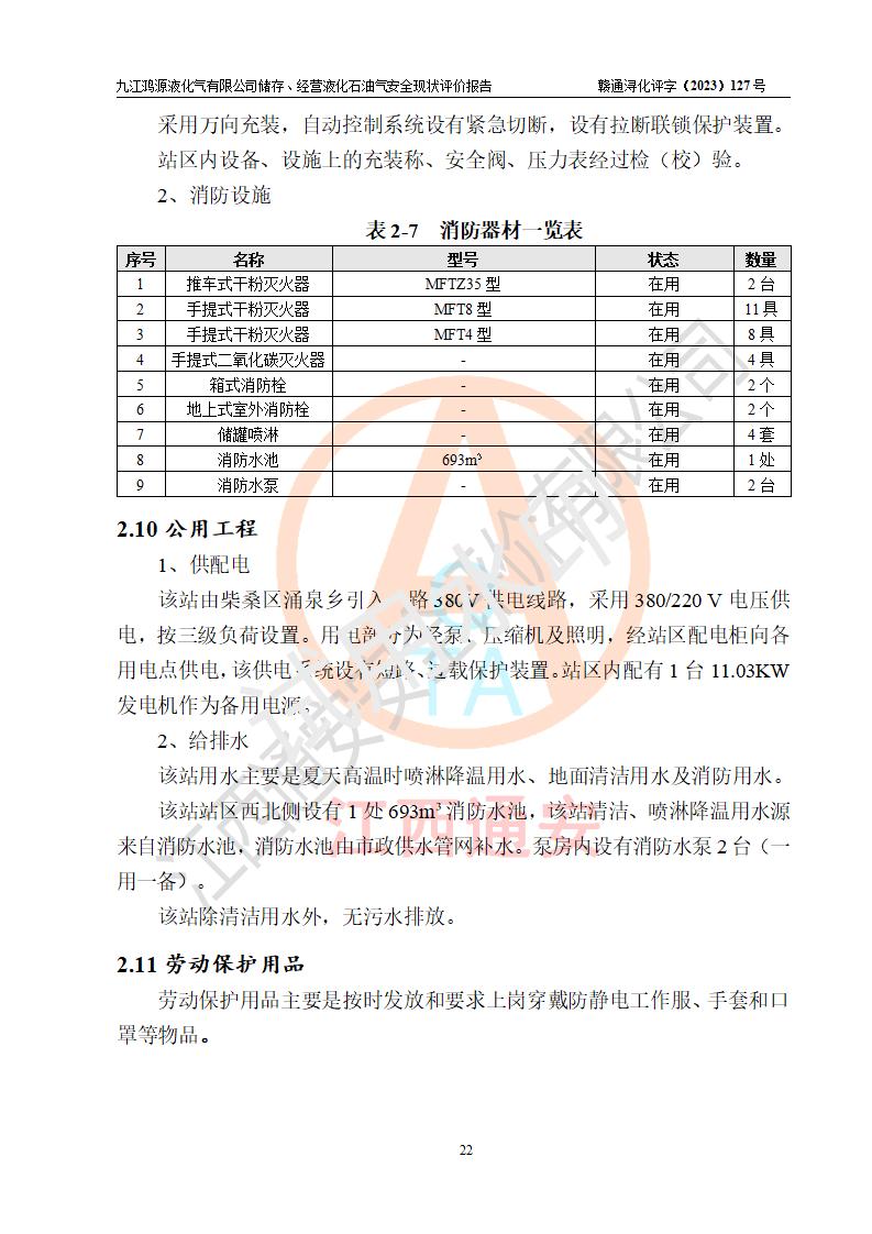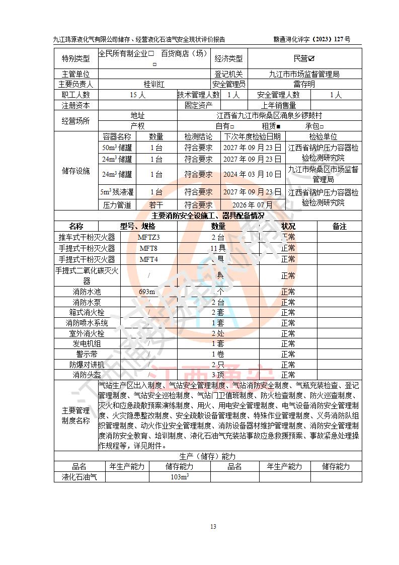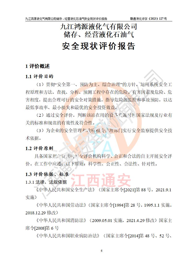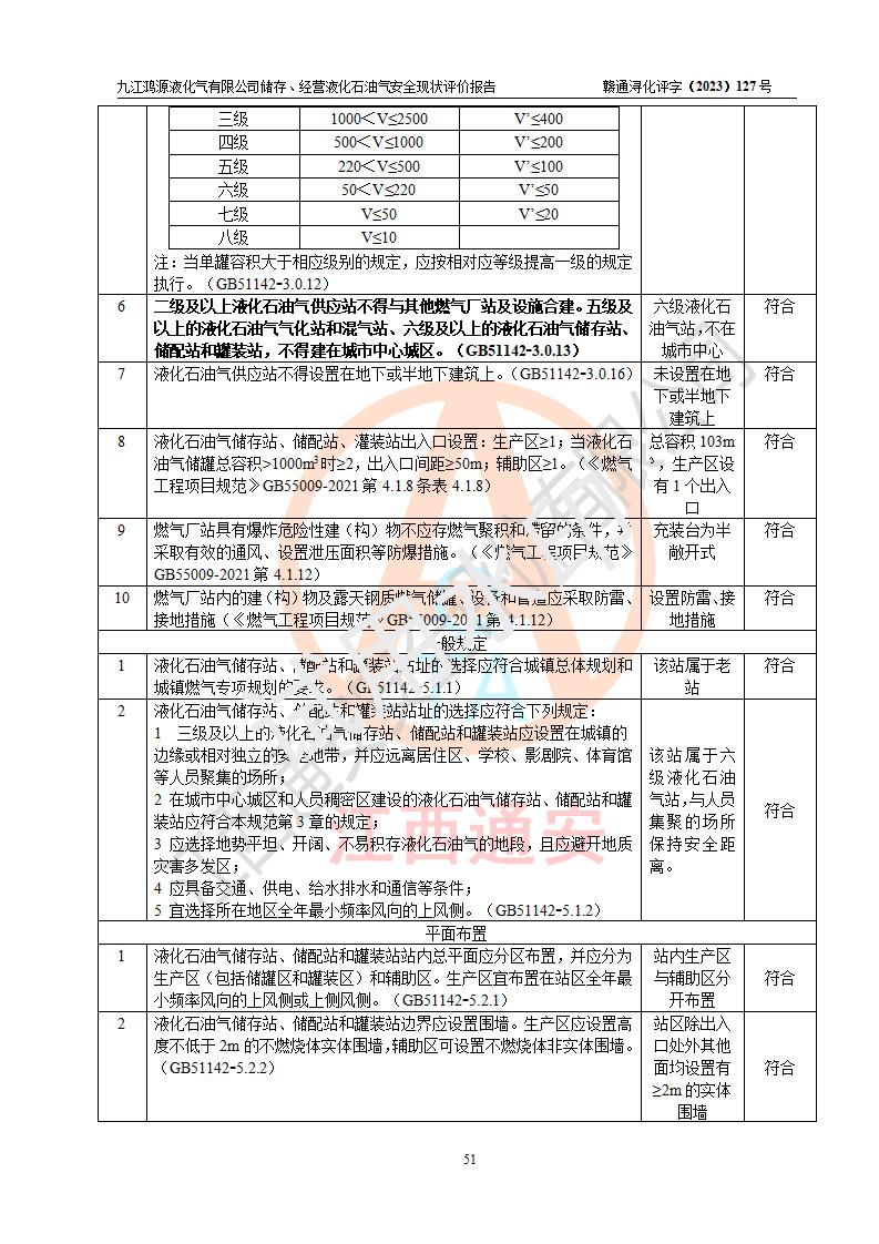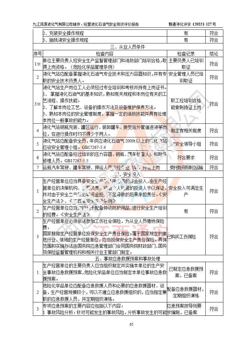 评价结论 | 综上所述:九江鸿源液化气有限公司储存、经营液化石油气站涉及的安全条件、安全生产条件、安全生产管理、应急管理符合**相关法律、法规、标准的要求,采取了相应的技术设施和安全管理措施,其风险可控,能达到可以接受的程度,可以满足液化石油气经营安全条件。 | ||||||