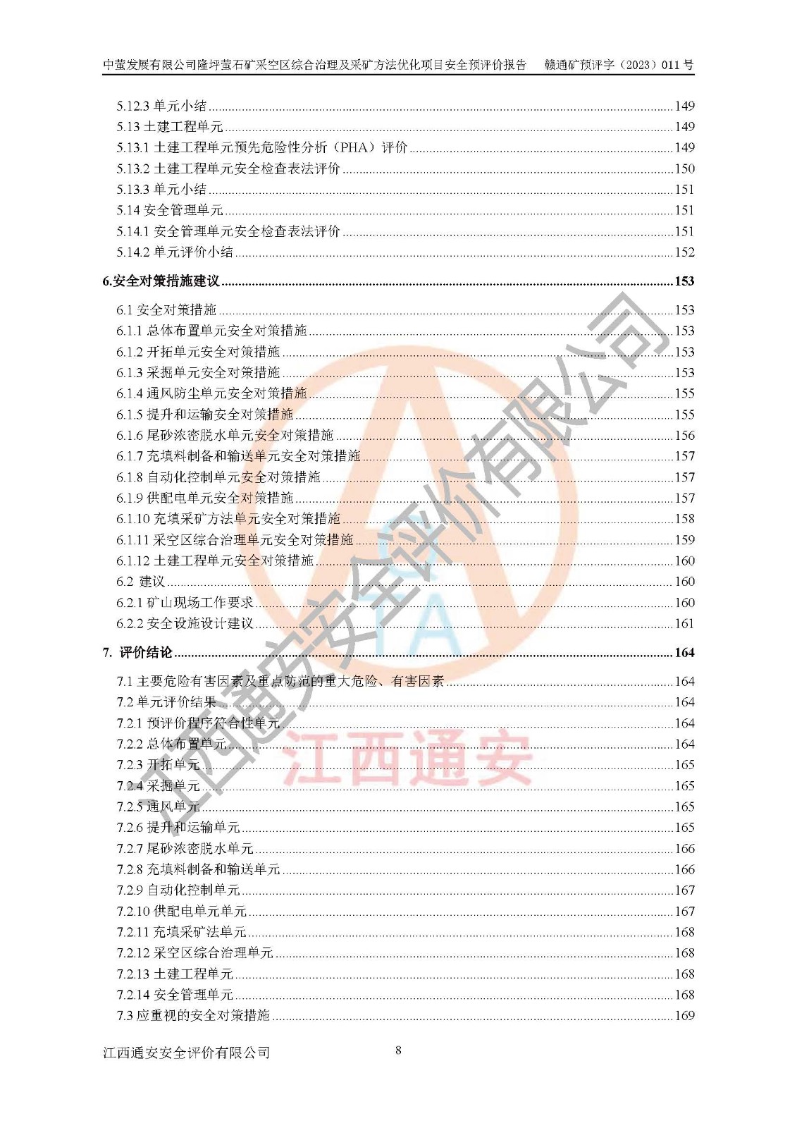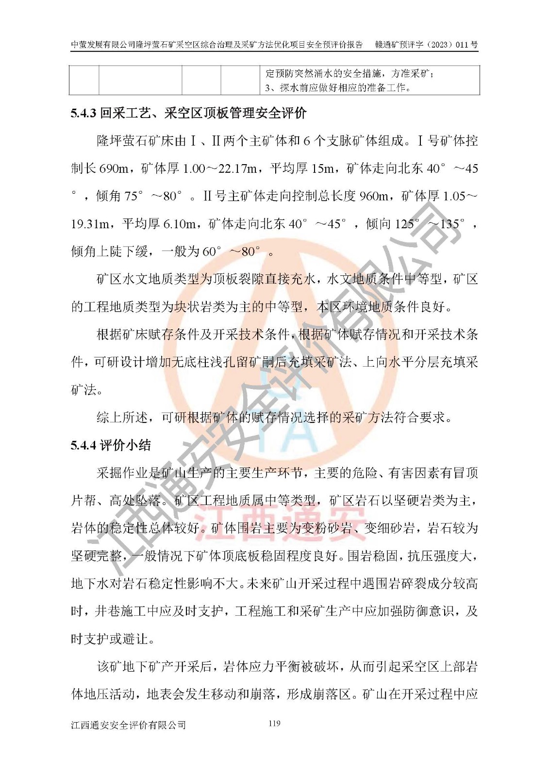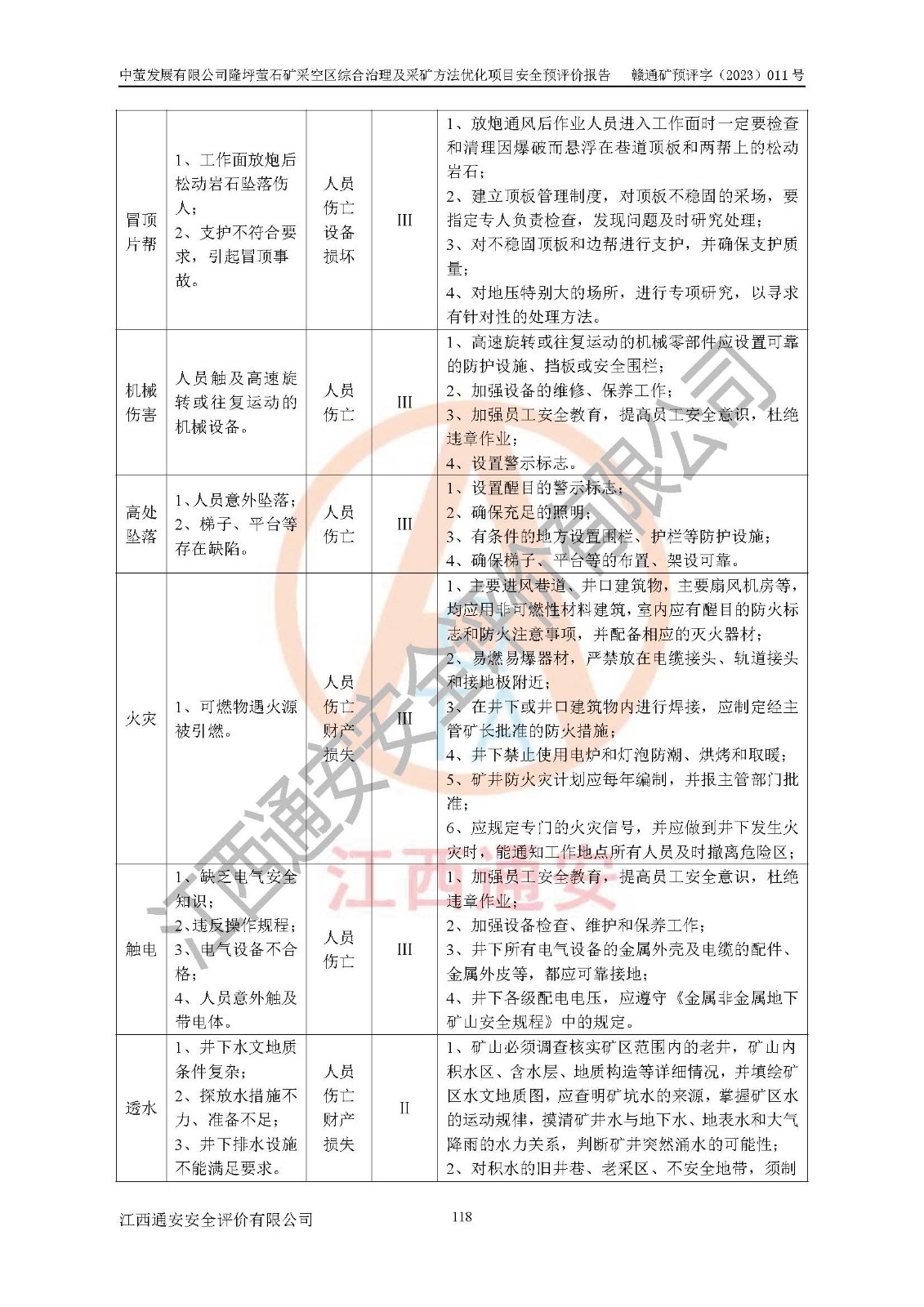 其它 | 1、该评价项目中存在的主要危险因素:滑坡坍塌、机械伤害、高处坠落、触电(雷击)、炸药爆炸、爆破伤害、冒顶片帮、起重伤害、**伤害、中毒窒息、物体打击、透水、淹溺、火灾等危险等级为Ⅲ~IV级;、粉尘、噪声与振动、高低温、γ辐射危害等级为Ⅱ;另外矿区还存在腐蚀、采光照明不良等危险、有害因素。 其中建设项目应重点防范的重大危险、有害因素有滑坡坍塌、机械伤害、高处坠落、爆破伤害、冒顶片帮、**伤害、中毒窒息、触电(雷击)、起重伤害等。 2、该矿山为非金属地下矿山,不存在瓦斯突出,非自燃发火危险的矿井,矿区工程及水文地质条件中等。生产场所、压力容器、压力管道未达到临界量,但冲击地压可能构成重大危险源。 建设项目拟定的优化开采方案、采用的采矿工艺及采空区综合治理方法的安全设施基本符合安全生产法律、法规和行业安全技术规程。在建设施工及生产运行中,如能严格执行**有关安全生产法律、法规和有关标准、规范,认真落实设计提出的安全措施,并合理采纳本报告中提出的安全对策措施及建议,项目的主要危险、有害因素可得到较好控制,安全生产风险在可接受范围。中萤发展有限公司隆坪萤石矿采空区综合治理及采矿方法优化项目从安全生产角度符合**有关安全生产法律、法规、规章、标准和规范的要求,风险可以接受。 | ||||