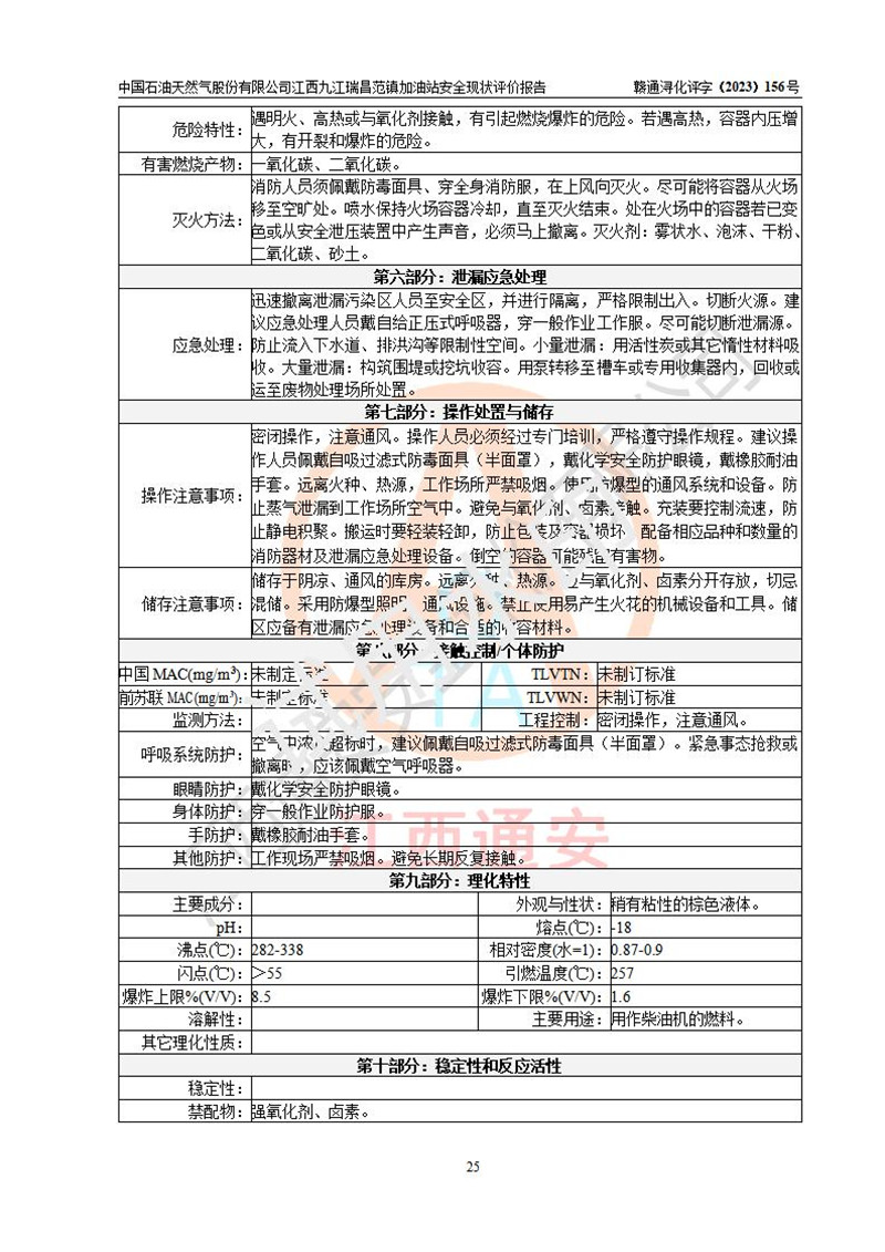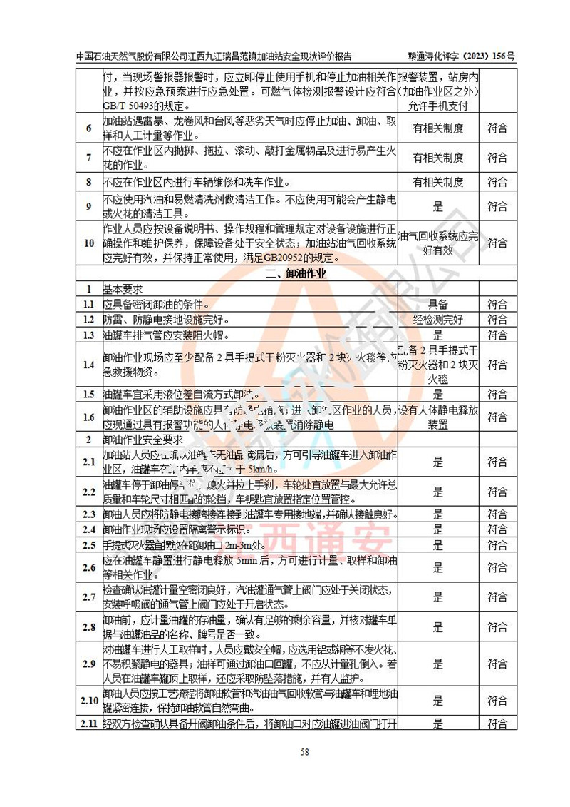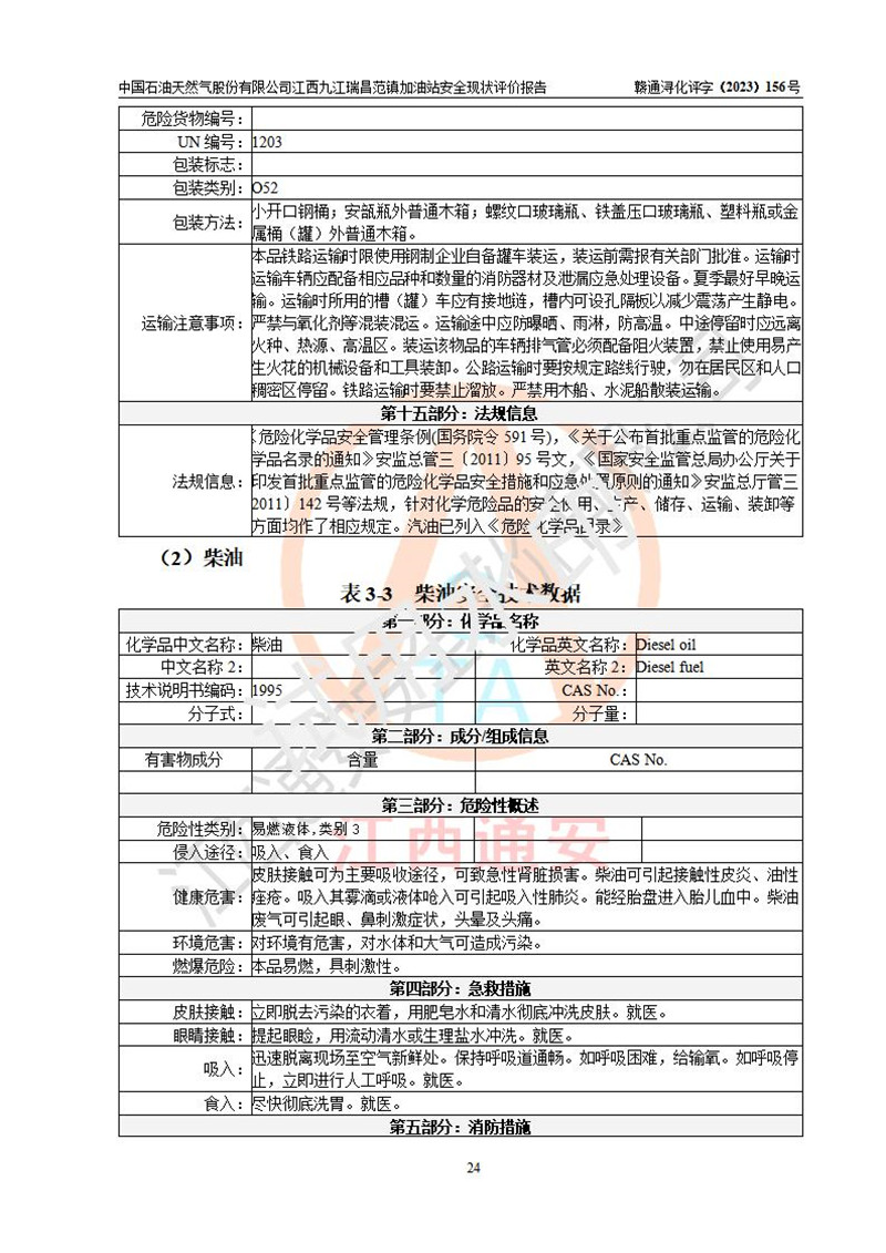 评价结论 | 中国石油天然气股份有限公司江西九江瑞昌范镇加油站涉及的安全条件、安全经营条件、安全生产管理符合《危险化学品经营许可证管理办法》、《汽车加油加气加氢站技术标准》等**有关法规、标准、规范要求,能满足危险化学品经营安全条件。 | |||