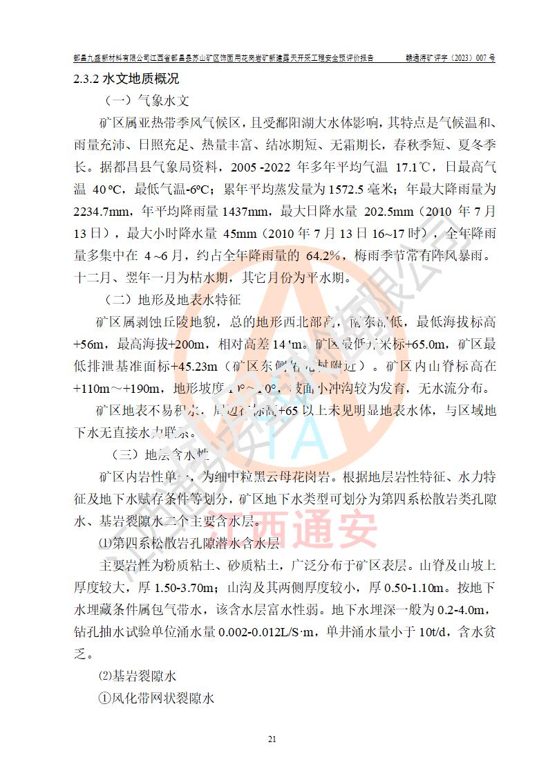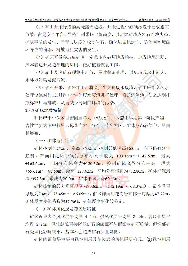项目简介 | 都昌九盛新材料有限公司是2023年1月13日注册成立的有限责任公司(非自然人投资或控股的法人独资),法定**人为倪飞立,注册地址为都昌县苏山乡尖山村委会刘堂州村27号,注册资本1亿元整,主要从事非煤矿山矿产资源开采、道路货物运输(不含危险货物)、水路普通货物运输、非金属矿物制品销售、建筑材料销售、新材料技术研发、新村料技术推广服务、采矿行业**节能技术研发,石灰和石膏销售、选矿、**货物运输代理、装卸搬运、普通货物仓储服务等。都昌县苏山矿区饰面用花岗岩矿是九江市自然资源局新设的矿山,矿山2021年4月由江西省地质矿产勘查开发局九一五地质大队编制了《江西省都昌县苏山矿区饰面用花岗岩矿详查报告》,并于2021年5月取得九江市自然资源局出具的详查报告资源储量评审意见书及备案证明【九自然资储备字(2021)005号】,2021年8月由九江创新矿业开发咨询服务公司编制《江西省都昌县苏山矿区饰面用花岗岩矿矿产资源开发利用、地质环境恢复治理与土地复垦方案》;矿山2023年9月进行了招拍挂,公司取得了矿权。2023年11月8日取得了《采矿许可证》。《采矿许可证》核定的矿区由10个拐点圈定范围,面积0.24km2,开采标高+200.0m~+65.0m,核定的生产规模为19万m3/a(花岗岩荒料,属大型矿山)。 | |||||