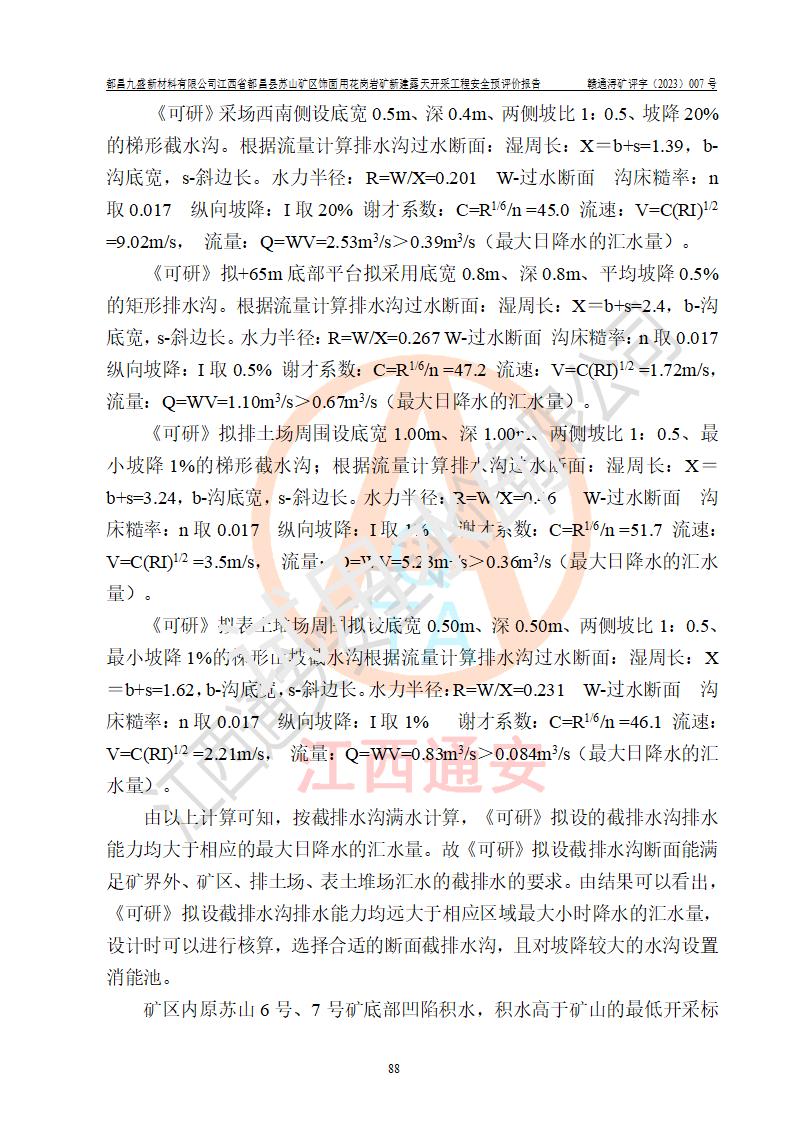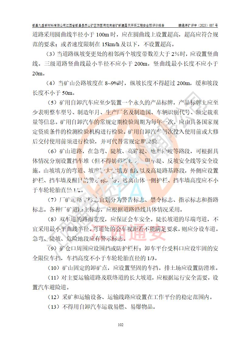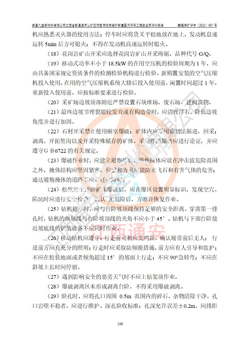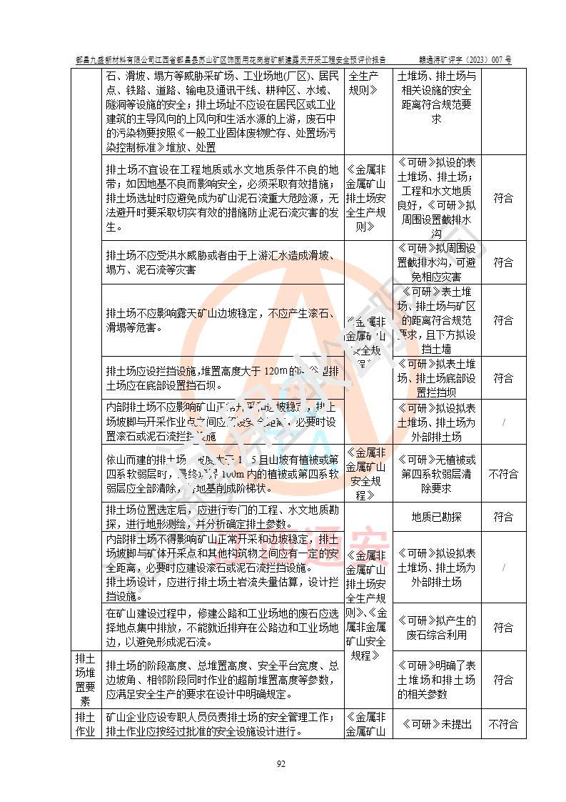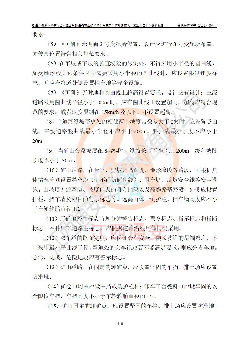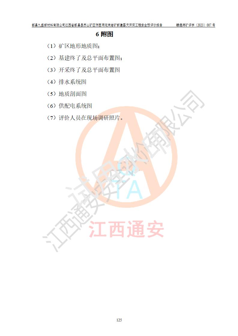 评价结论 | 总体结论:都昌九盛新材料有限公司江西省都昌县苏山矿区饰面用花岗岩矿新建露天开采工程潜在的坍塌(滑坡)、泥石流、放炮、火药爆炸、火灾、容器爆炸、灼烫、**伤害、触电、高处坠落、物体打击、机械伤害、淹溺、粉尘危害、噪声和振动等危险、有害因素,落实《可研》和本报告提出的安全措施和对策,风险可控,能达到可接受范围。 都昌九盛新材料有限公司江西省都昌县苏山矿区饰面用花岗岩矿新建露天开采工程落实《可研》和本报告提出的安全措施和对策,能够满足**有关法律、法规、规章、标准和规范的要求,可以建设。 | |||||