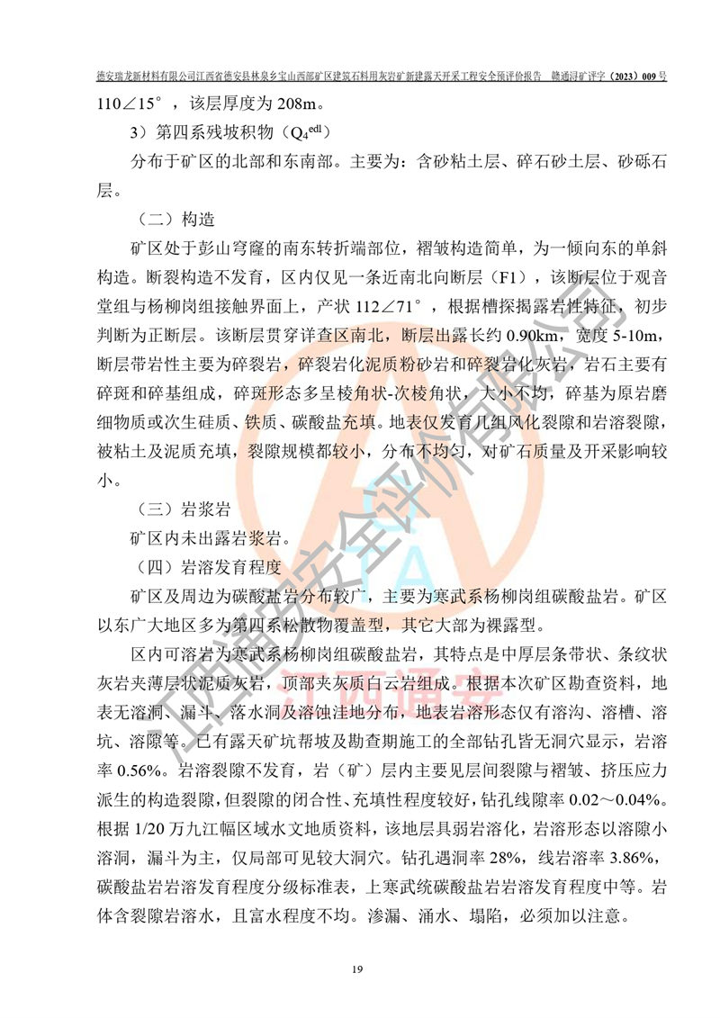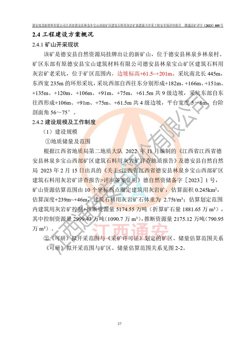 评价报告名称 | 德安瑞龙新材料有限公司江西省德安县林泉乡宝山西部矿区建筑石料用灰岩矿新建露天开采工程安全预评价报告 | |||||