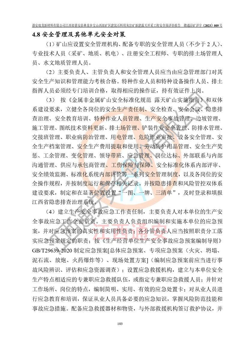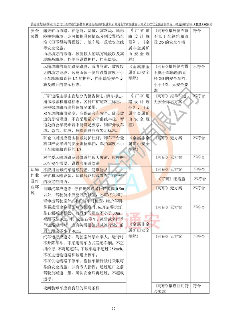评价结论 | 总体结论:德安瑞龙新材料有限公司江西省德安县林泉乡宝山西部矿区建筑石料用灰岩矿新建露天开采工程项目潜在火药与雷管爆炸、放炮、坍塌(滑坡)、泥石流、触电、火灾、**伤害、高处坠落、物体打击、容器爆炸、机械伤害、中毒与窒息、淹溺、粉尘、高低温、噪声、振动等危险、有害因素,落实《可研》、《建议书》和本报告提出的安全措施和对策,风险可控,能达到可接受范围。 江西省德安县林泉乡宝山西部矿区建筑石料用灰岩矿新建露天开采工程项目露天开采工程落实《可研》、《建议书》和本报告提出的安全措施和对策,能够满足**有关法律、法规、规章、标准和规范的要求,可以进行建设。 | |||||