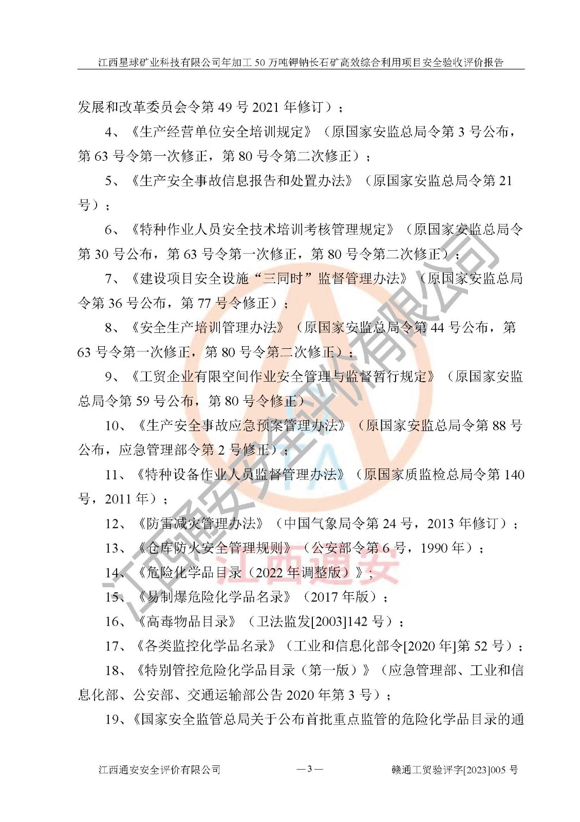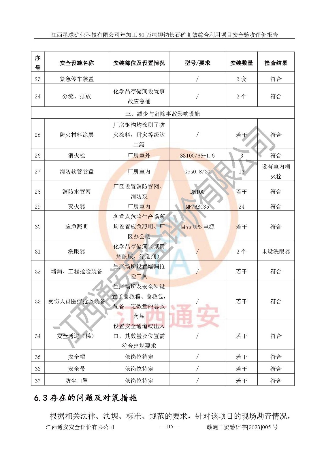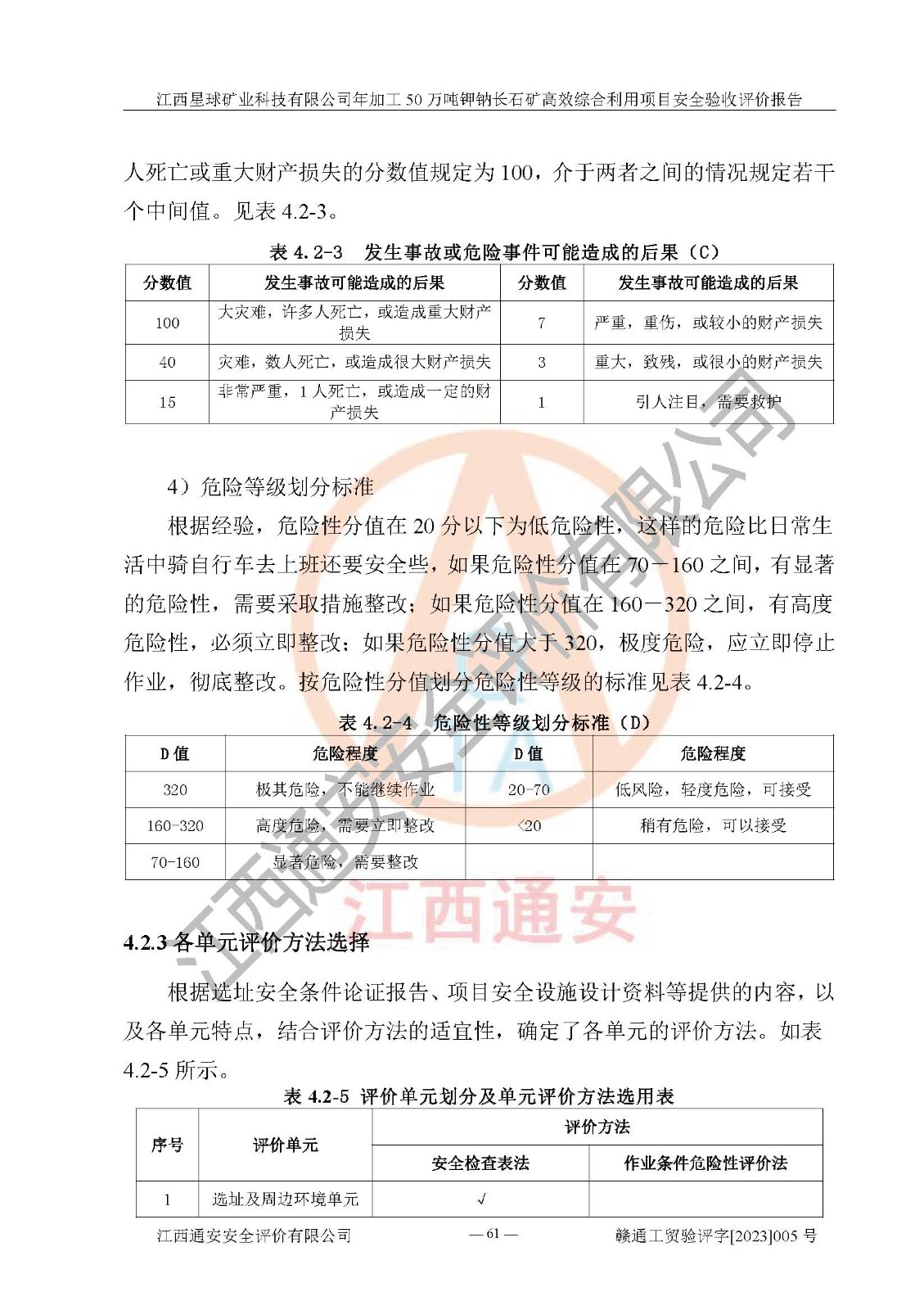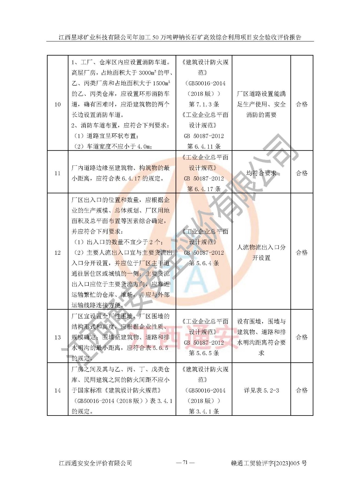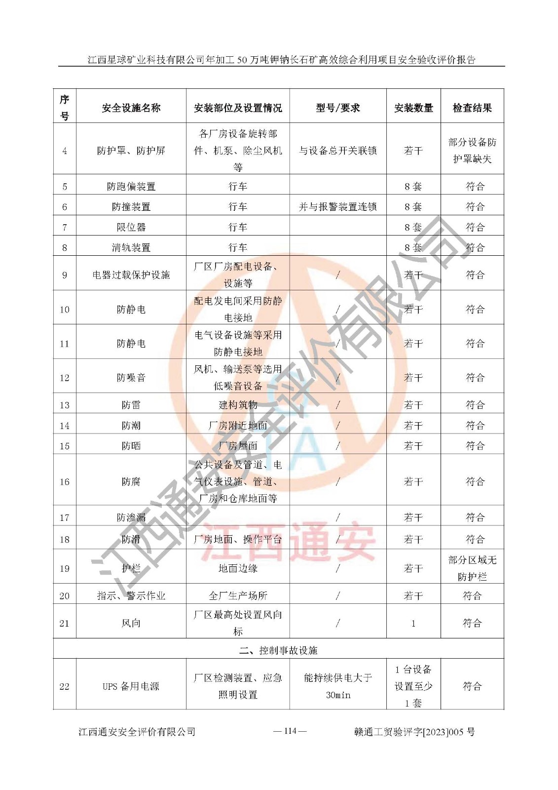 其它 | 根据《中华人民共和国安全生产法》、《新建项目安全设施“三同时”监督管理办法》(原**安全生产监督管理总局令第77号修订)等法律法规的要求,对江西星球矿业科技有限公司年加工50万吨钾钠长石矿**综合利用项目安全验收的基本条件进行分析,结果如下: 1)本项目在初步设计及建设过程中基本能贯彻执行**、地方及有关部门的安全生产法律法规、标准要求,取得了**相关部门的许可、备案。项目的设计、施工、监理等单位均有相应资质。 2)本项目址选符合要求;总平面布置合理,主要建筑的防火间距符合符合《建筑设计防火规范》(GB50016-2014,2018版)、《工业企业总平面设计规范》(GB50187-2012)有关规范、标准的要求。 3)本项目生产工艺成熟、试运行正常,试运行中过程中工艺和装置、设备(设施)安全、可靠,未发生安全事故。 4)本项目的特种设备由有资质单位设计、制造、安装,特种设备经宜春市特种设备检验中心检验合格,符合《中华人民共和国特种设备安全法》、《特种设备安全监察条例》(中华人民共和国***令第549号)的规定。特种设备作业人员、特种作业人员均持证上岗。 5)公司主要负责人及安全管理人员取得了江西省亿源企业咨询服务有限公司颁发的培训证书,特种作业人员操作证在**期内,其他从业人员经安全培训符合,取得上岗证。符合要求。 6)公司建立有安全管理制度,制定有各类人员的安全生产责任制、各项安全管理制度和操作规程。按照**有关规定编制了事故应急救援预案并进行了备案,并定期进行演练等,符合要求。 7)本项目作业条件危险性分析结果:在选定的单元的危险程度均为“可能危险,需要注意”或“稍有危险,可以接受”,作业条件相对安全。 评价结论: 江西星球矿业科技有限公司年加工50万吨钾钠长石矿**综合利用项目的安全设施及安全管理符合**及有关部门关于安全生产法律、法规、标准的要求,该项目试生产以来,工艺设备、安全设施及企业安全管理机制等运行正常,安全设施、措施达到设计要求和预期结果,可以满足建设项目安全生产的要求,安全生产管理**,具备竣工验收条件。 | ||||
