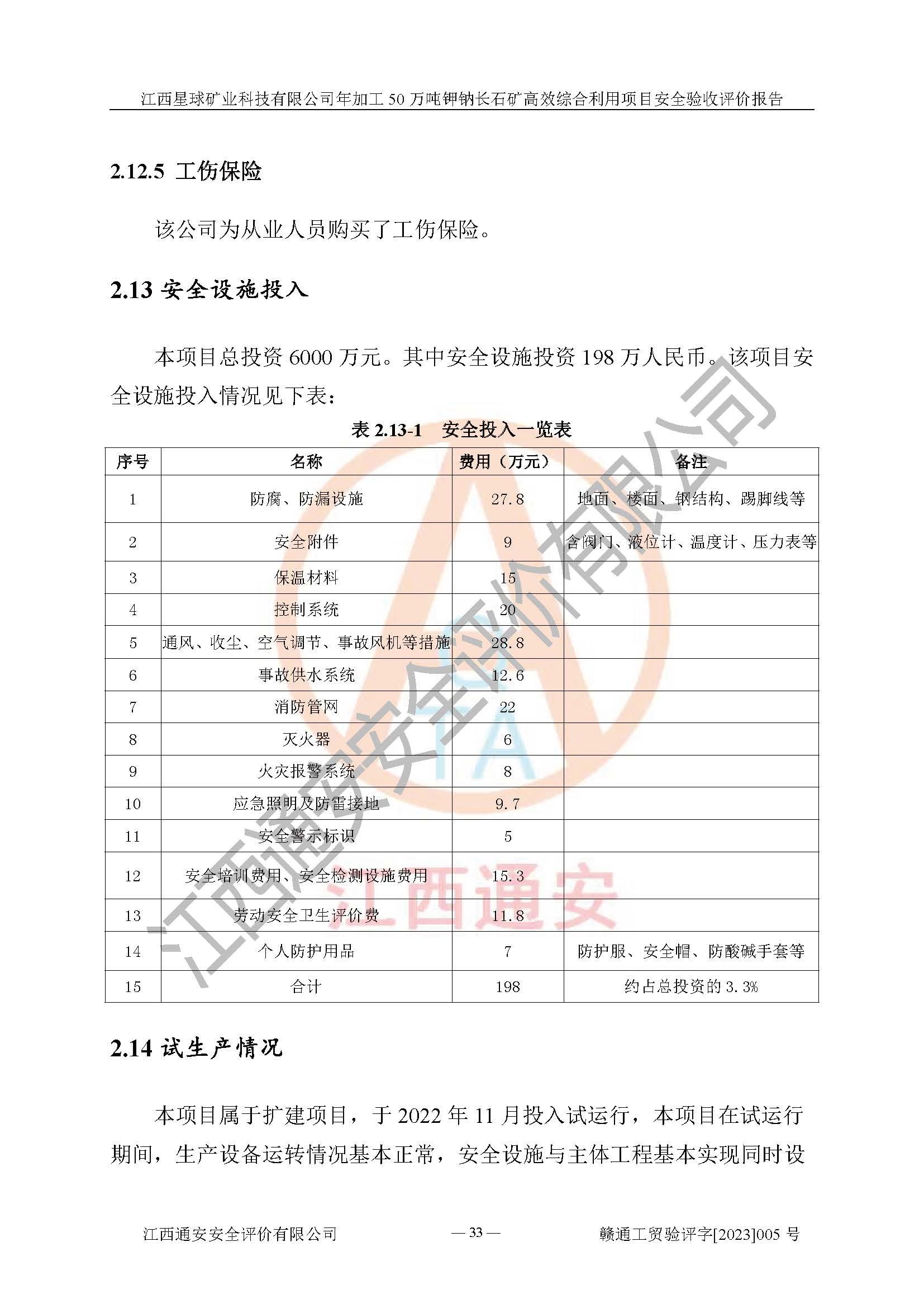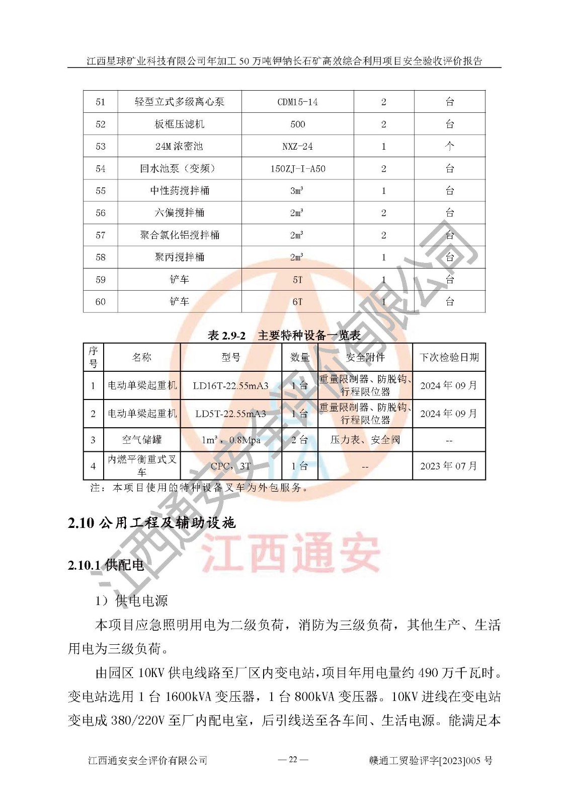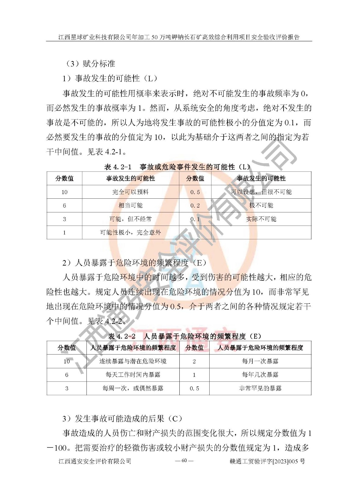 项目简介 | 本报告为江西星球矿业科技有限公司年加工50万吨钾钠长石矿**综合利用项目安全验收评价报告。江西星球矿业科技有限公司成立于2010年11月04日,统一社会信用代码:9136092456381952X5,注册地址江西省宜春市宜丰县工业园,注册资金500万元,法人**为何剑兴,经营范围:陶瓷原料、化工产品(不含危险化学品)加工、销售;瓷土加工与销售;瓷土露天开采。本项目为年加工50万吨钾钠长石矿**综合利用项目,总投资6000万元。 江西星球矿业科技有限公司于2015年前后建设投产了江西星球矿业科技有限公司年产15万吨精选钾长石粉项目(一期5万吨),为宜春市陶瓷产业提供优质的钾长石原料。为了适应市场需求以及公司更好的发展,从锂瓷石矿中提取优质的锂云母资源,江西星球矿业科技有限公司决定将现有已建工程(包括已建生产线及配套设施)**拆除,保留现有工程建构筑物,在此基础上建设“江西星球矿业科技有限公司年加工50万吨钾钠长石矿**综合利用项目”。本次扩建主要增加锂云母提取工艺,为宜春市各锂电产业提供优质的锂云母原料。 本项目于2022年02月28日在宜丰县发展和改革委员会备案,取得《江西省企业投资项目备案通知书》(宜丰县发展和改革委员会,项目统一代码为:2201-360924-04-01-704455),2022年4月组织技术人员编制了《江西星球矿业科技有限公司年加工50万吨钾钠长石扩建项目安全生产条件和设施综合分析报告》,2022年10月委托中裕工程集团有限公司编制了《江西星球矿业科技有限公司年加工50万吨钾钠长石矿**综合利用项目安全设施设计》。本项目外购矿石,通过破碎、球磨、选矿、脱水后*终产出锂云母精矿、长石粉及尾泥。其中在生产工艺中主要涉及的化学品为聚丙烯酸酰胺、浮选剂,检维修工序使用到的氧气、乙炔以及装载车和叉车使用到的燃料柴油。经辨识,该项目不构成危险品重大危险源。根据生产工艺特点及物料的理化特性可知,该项目生产过程中存在火灾、爆炸、机械伤害、灼烫、触电、**伤害、高处坠落、坍塌、物体打击、淹溺、起重伤害、中毒窒息、其他伤害等危险有害因素。
