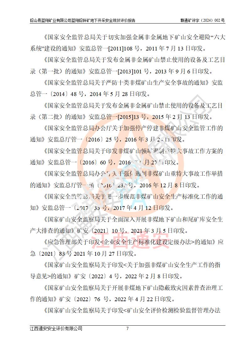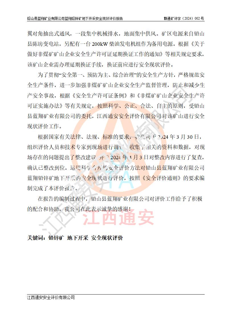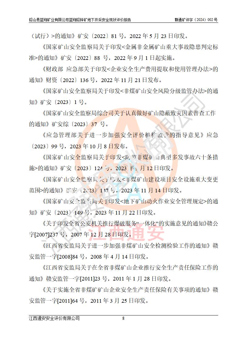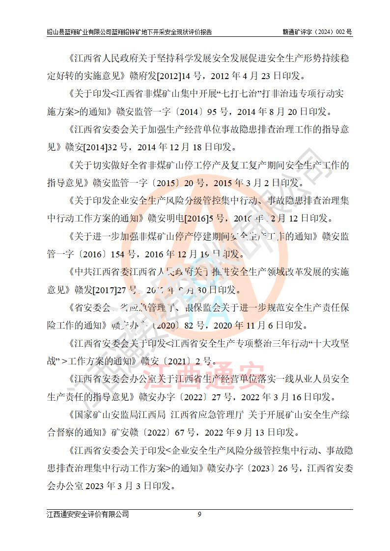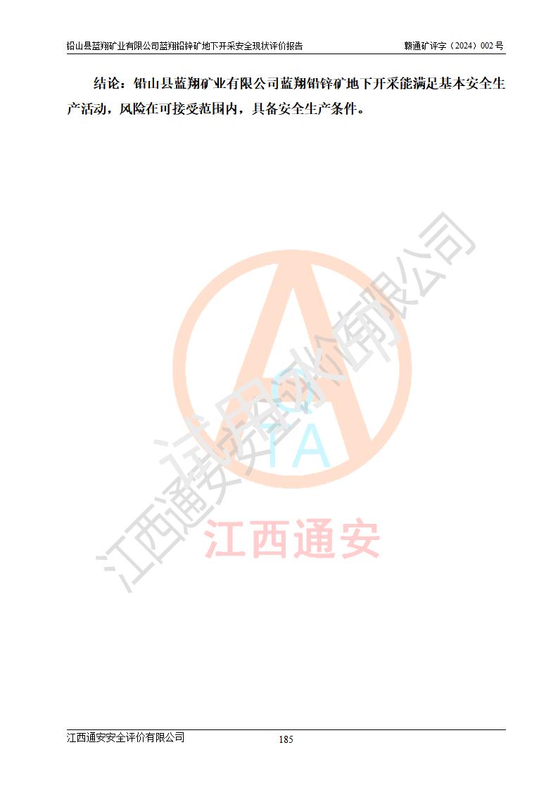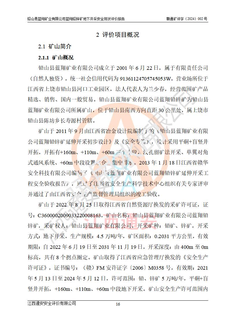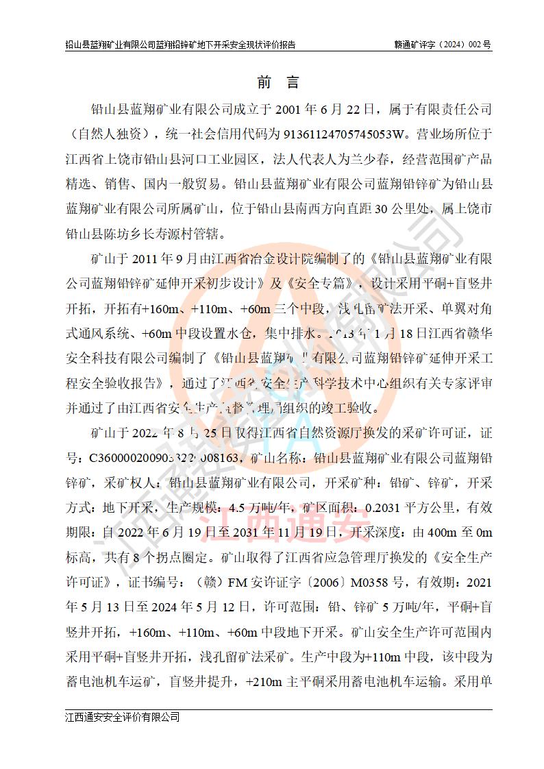 报告名称 | 铅山县蓝翔矿业有限公司蓝翔铅锌矿地下开采安全现状评价报告 | |||||