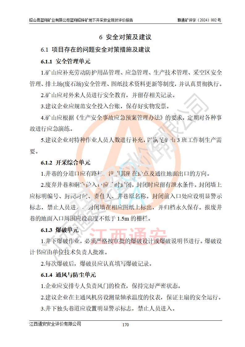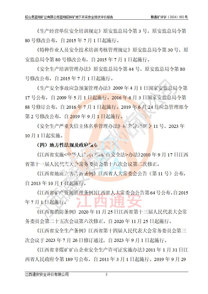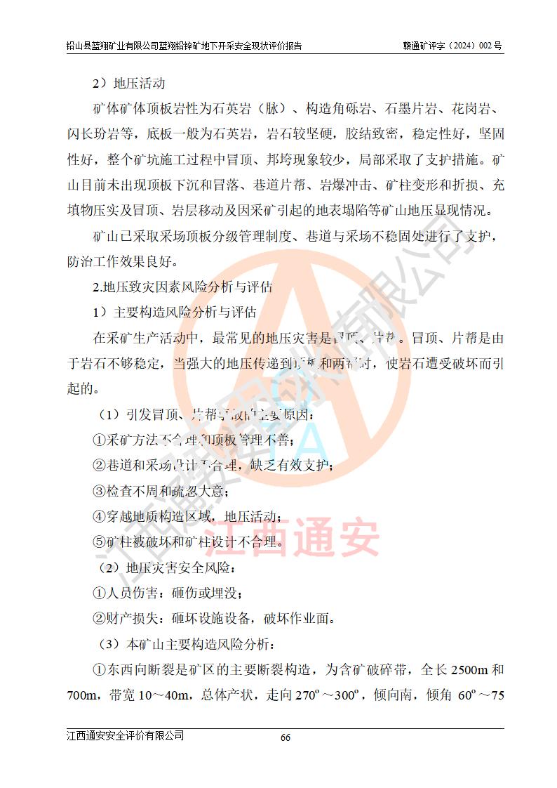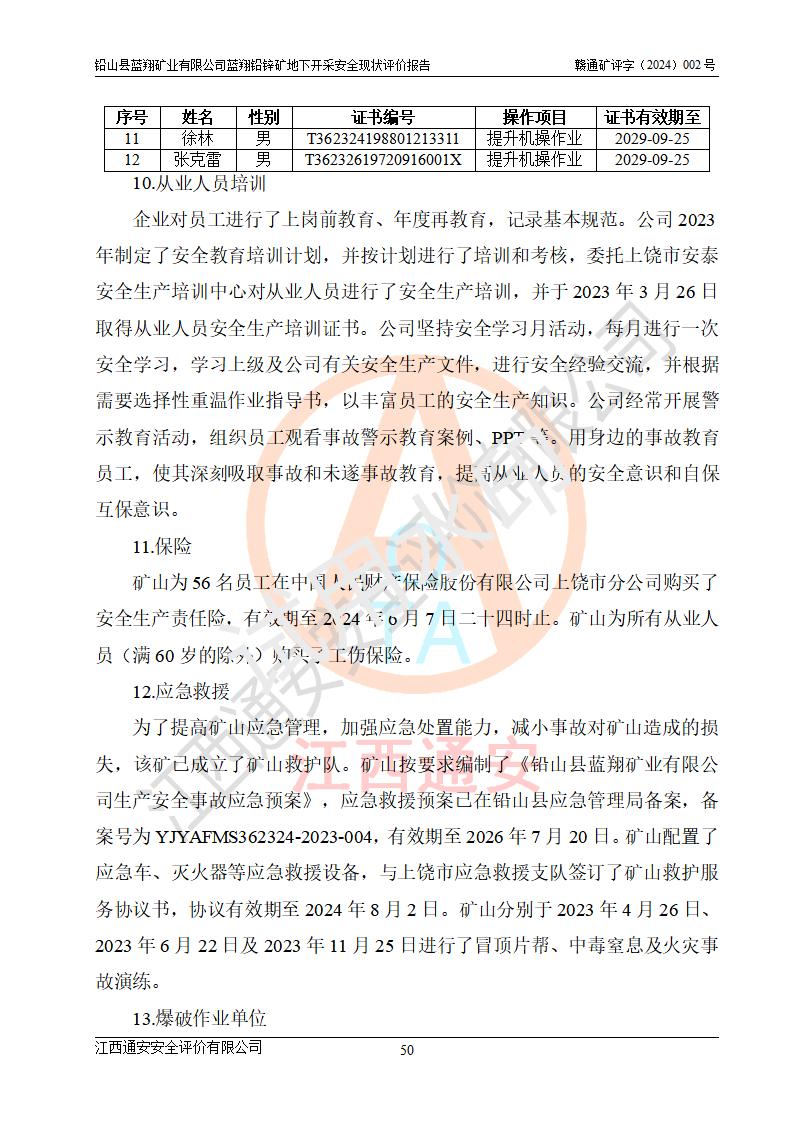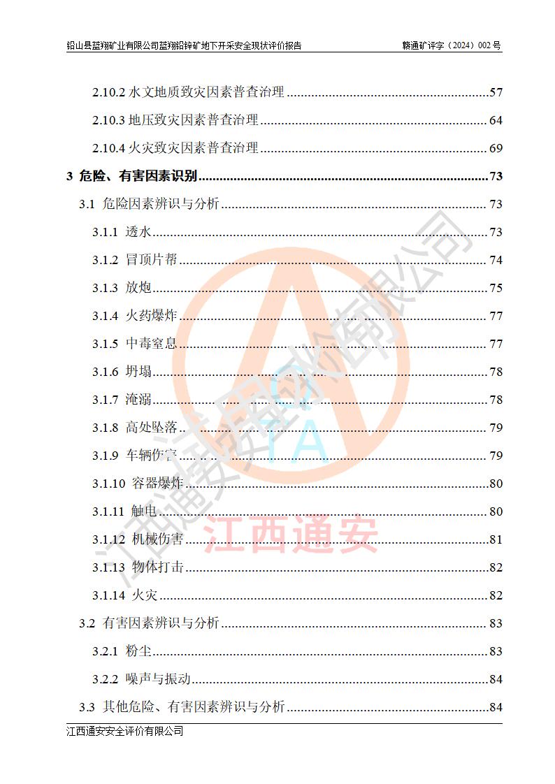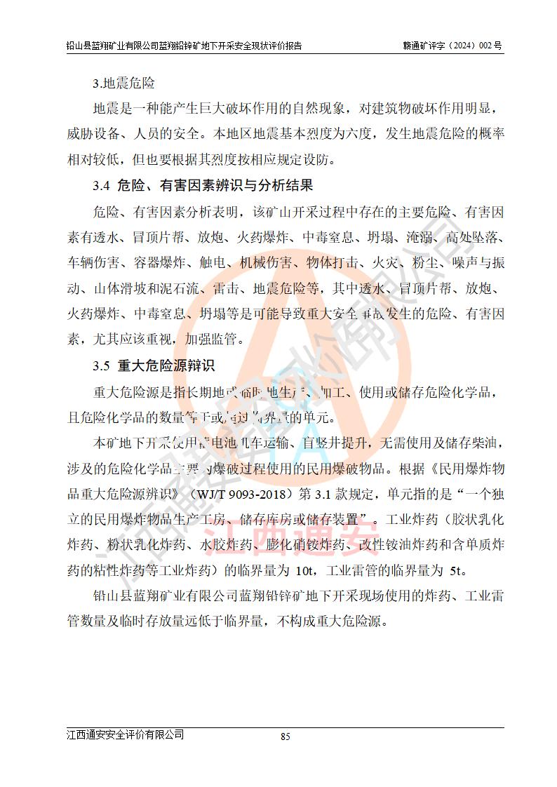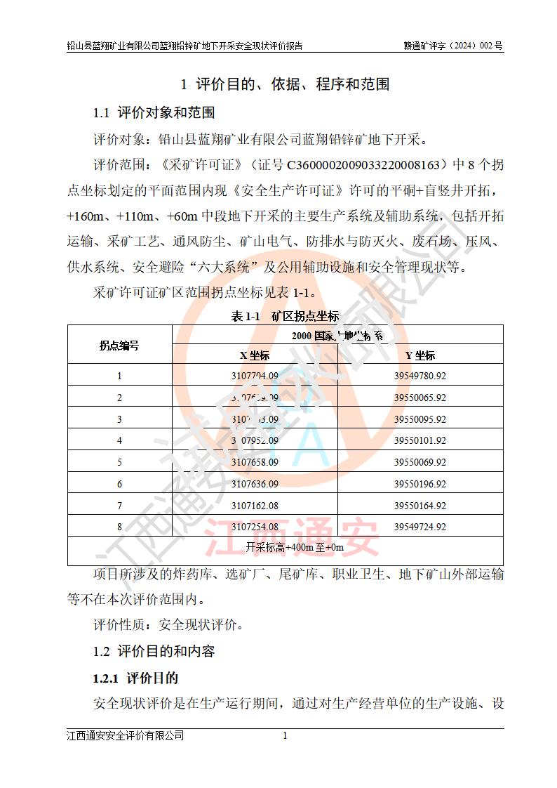 报告名称 | 铅山县蓝翔矿业有限公司蓝翔铅锌矿地下开采安全现状评价报告 | |||||