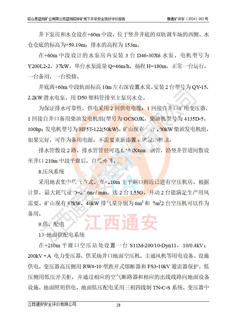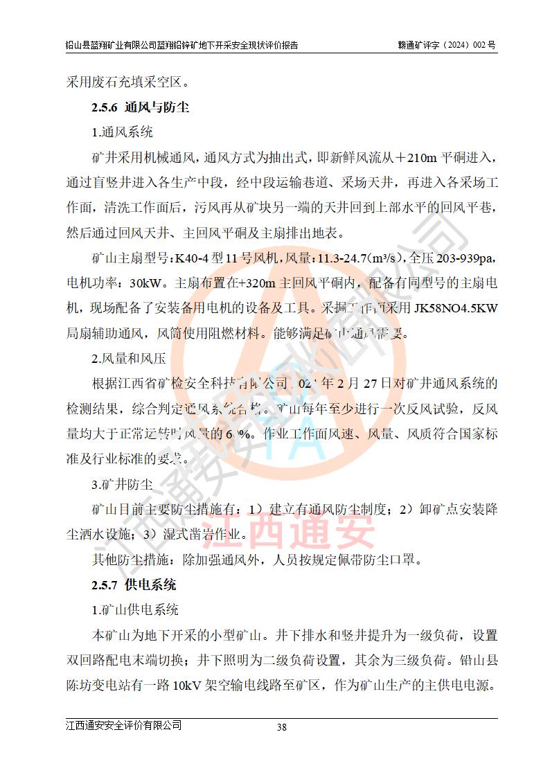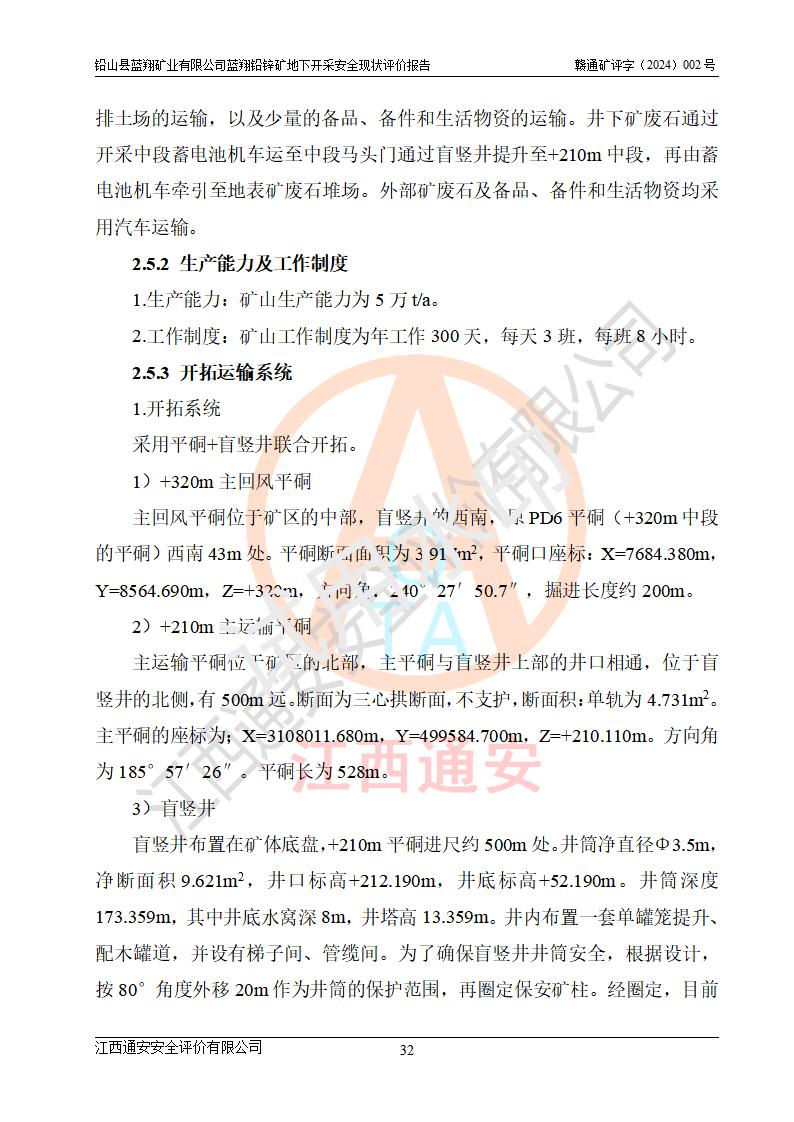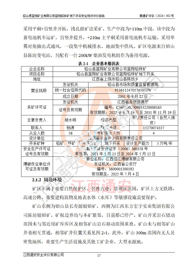项目简介 | 铅山县蓝翔矿业有限公司成立于2001年6月22日,属于有限责任公司(自然人独资),统一社会信用代码为91361124705745053W。营业场所位于江西省上饶市铅山县河口工业园区,法人**人为兰少春,经营范围矿产品精选、销售、**一般贸易。铅山县蓝翔矿业有限公司蓝翔铅锌矿为铅山县蓝翔矿业有限公司所属矿山,位于铅山县南西方向直距30**处,属上饶市铅山县陈坊乡长寿源村管辖。 矿山于2011年9月由江西省冶金设计院编制了的《铅山县蓝翔矿业有限公司蓝翔铅锌矿延伸开采初步设计》及《安全专篇》,设计采用平硐+盲竖井开拓,开拓有+160m、+110m、+60m三个中段,浅孔留矿法开采、单翼对角式通风系统、+60m中段设置水仓,集中排水。2013年1月18日江西省赣华安全科技有限公司编制了《铅山县蓝翔矿业有限公司蓝翔铅锌矿延伸开采工程安全验收报告》,通过了江西省安全生产科学技术中心组织有关专家评审并通过了由江西省安全生产监督管理局组织的竣工验收。 矿山于2022年8月25日取得江西省自然资源厅换发的采矿许可证,证号:C3600002009033220008163,矿山名称:铅山县蓝翔矿业有限公司蓝翔铅锌矿,采矿权人:铅山县蓝翔矿业有限公司,开采矿种:铅矿、锌矿,开采方式:地下开采,生产规模:4.5万吨/年,矿区面积:0.2031平方**,**期限:自2022年6月19日至2031年11月19日,开采深度:由400m至0m标高,共有8个拐点圈定。矿山取得了江西省应急管理厅换发的《安全生产许可证》,证书编号:(赣)FM安许证字〔2006〕M0358号,**期:2021年5月13日至2024年5月12日,许可范围:铅、锌矿5万吨/年,平硐+盲竖井开拓,+160m、+110m、+60m中段地下开采。矿山安全生产许可范围内采用平硐+盲竖井开拓,浅孔留矿法采矿。生产中段为+110m中段,该中段为蓄电池机车运矿,盲竖井提升,+210m主平硐采用蓄电池机车运输。采用单翼对角抽出式通风,一段集中机械排水,地面集中供风。矿区电源来自铅山县陈坊变电站,另配有一台200kW柴油发电机组作为备用电源。 | |||||