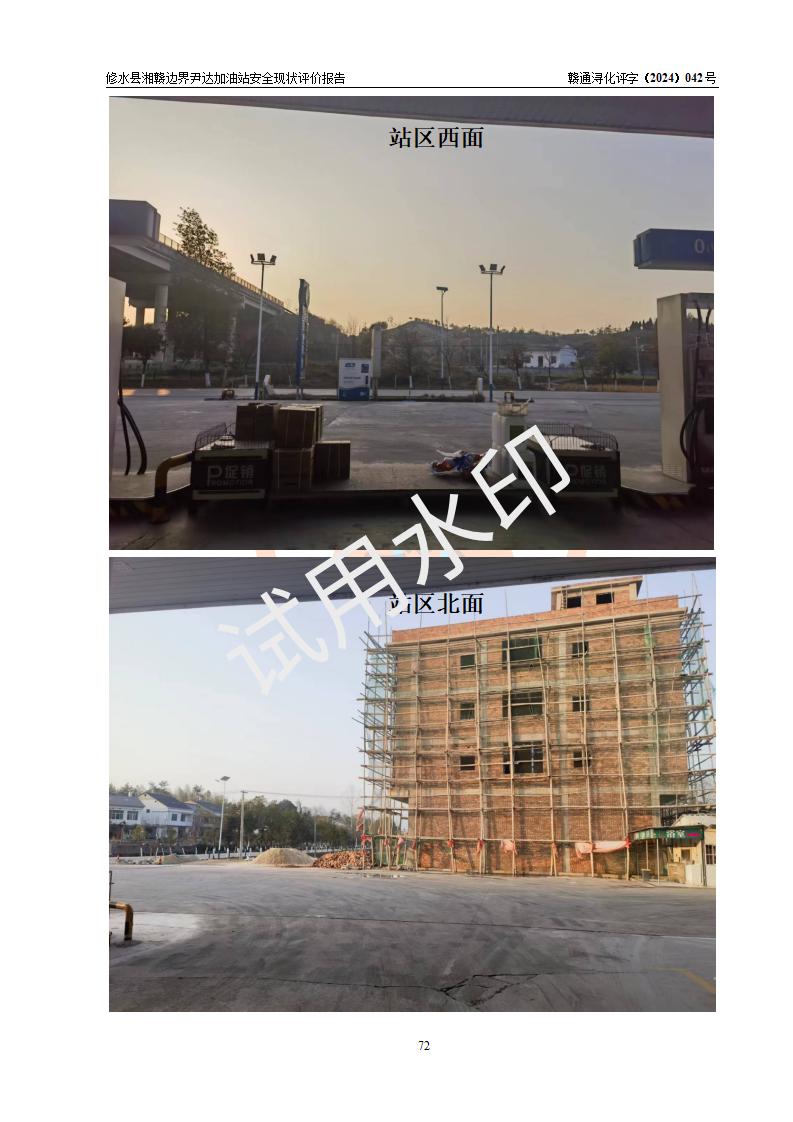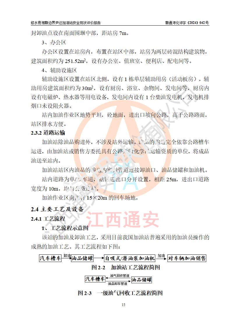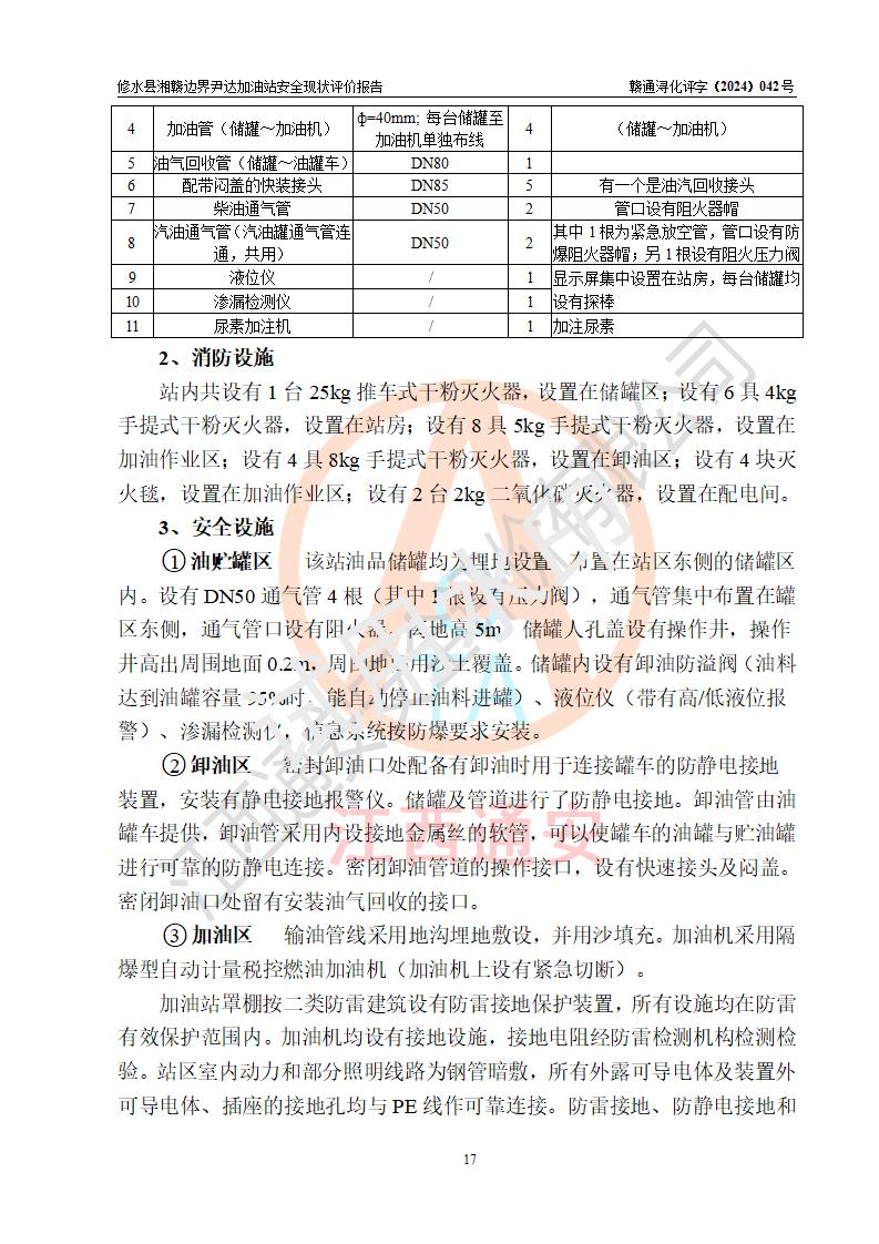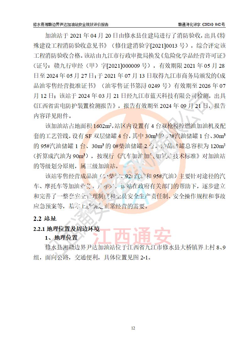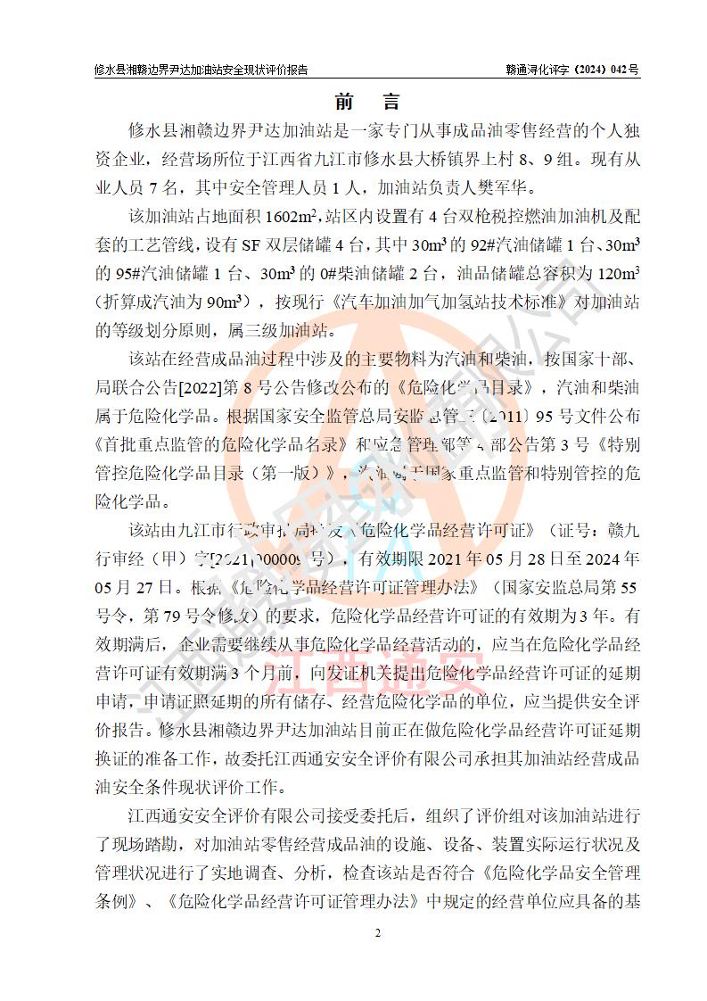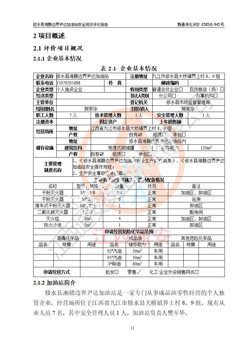 项目简介 | 修水县湘赣边界尹达加油站是一家专门从事成品油零售经营的个人独资企业,经营场所位于江西省九江市修水县大桥镇界上村8、9组。现有从业人员7名,其中安全管理人员1人,加油站负责人樊军华。 该加油站占地面积1602m2,站区内设置有4台双枪税控燃油加油机及配套的工艺管线,设有SF双层储罐4台,其中30m3的92#汽油储罐1台、30m3的95#汽油储罐1台、30m3的0#柴油储罐2台,油品储罐总容积为120m3(折算成汽油为90m3),按现行《汽车加油加气加氢站技术标准》对加油站的等级划分原则,属三级加油站。 该站由九江市行政审批局换发《危险化学品经营许可证》(证号:赣九行审经(甲)字[2021]000009号),**期限2021年05月28日至2024年05月27日。 | |||