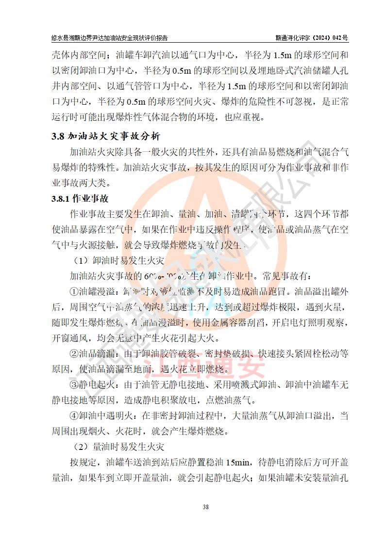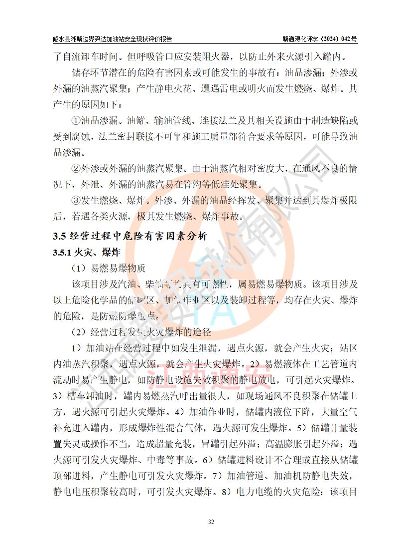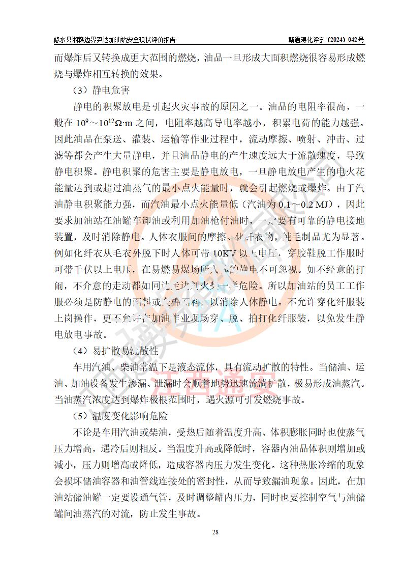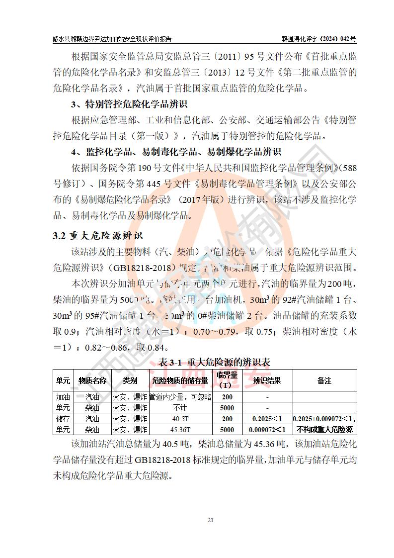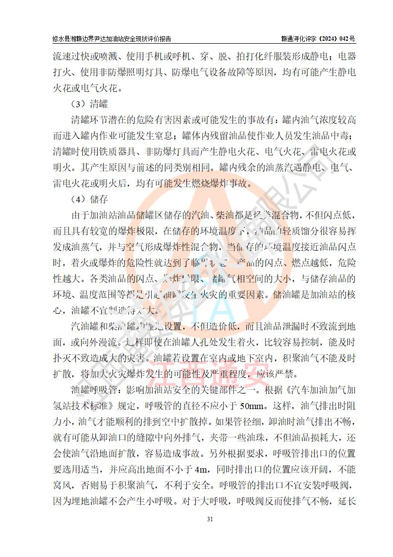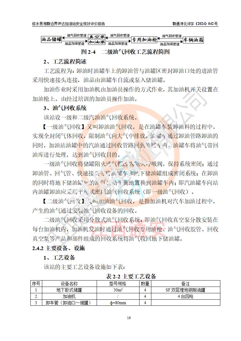 项目简介 | 修水县湘赣边界尹达加油站是一家专门从事成品油零售经营的个人独资企业,经营场所位于江西省九江市修水县大桥镇界上村8、9组。现有从业人员7名,其中安全管理人员1人,加油站负责人樊军华。 该加油站占地面积1602m2,站区内设置有4台双枪税控燃油加油机及配套的工艺管线,设有SF双层储罐4台,其中30m3的92#汽油储罐1台、30m3的95#汽油储罐1台、30m3的0#柴油储罐2台,油品储罐总容积为120m3(折算成汽油为90m3),按现行《汽车加油加气加氢站技术标准》对加油站的等级划分原则,属三级加油站。 该站由九江市行政审批局换发《危险化学品经营许可证》(证号:赣九行审经(甲)字[2021]000009号),**期限2021年05月28日至2024年05月27日。 | |||