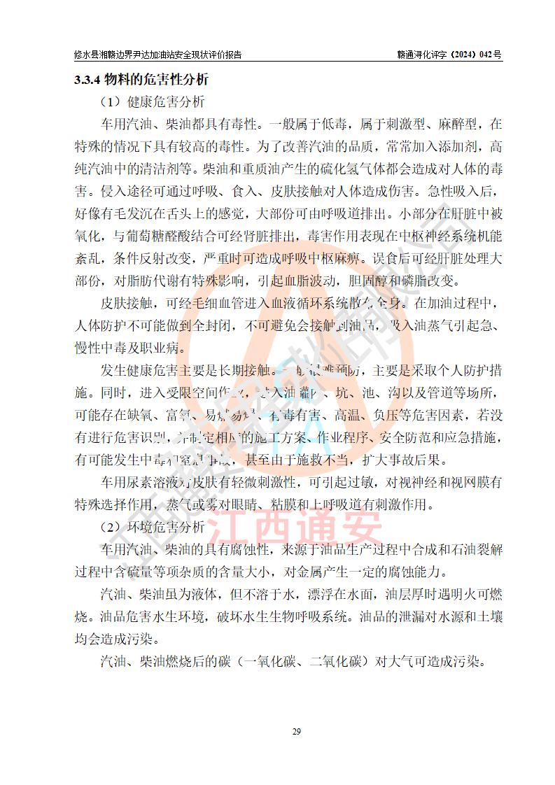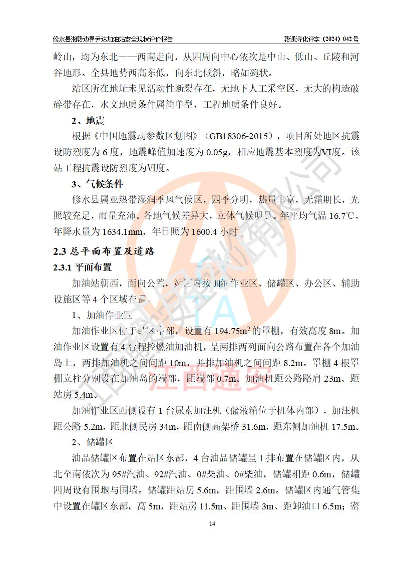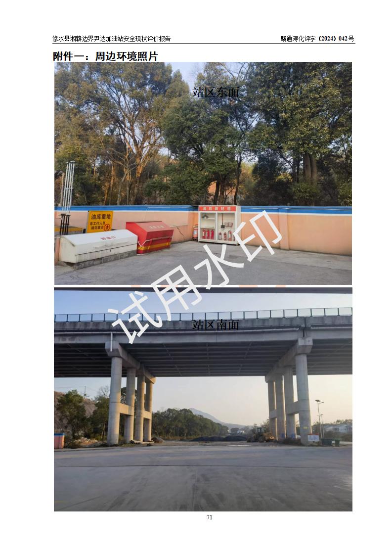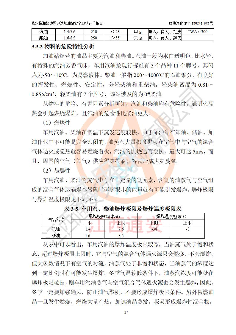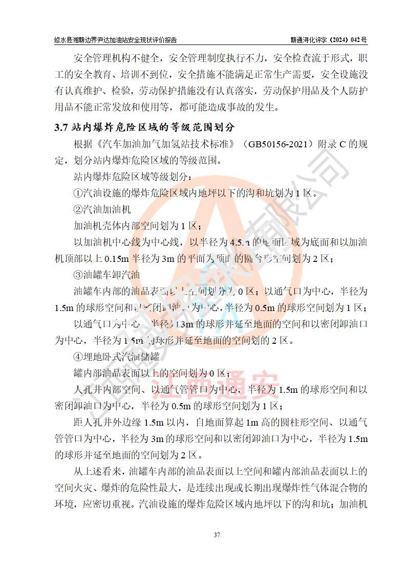 项目简介 | 修水县湘赣边界尹达加油站是一家专门从事成品油零售经营的个人独资企业,经营场所位于江西省九江市修水县大桥镇界上村8、9组。现有从业人员7名,其中安全管理人员1人,加油站负责人樊军华。 该加油站占地面积1602m2,站区内设置有4台双枪税控燃油加油机及配套的工艺管线,设有SF双层储罐4台,其中30m3的92#汽油储罐1台、30m3的95#汽油储罐1台、30m3的0#柴油储罐2台,油品储罐总容积为120m3(折算成汽油为90m3),按现行《汽车加油加气加氢站技术标准》对加油站的等级划分原则,属三级加油站。 该站由九江市行政审批局换发《危险化学品经营许可证》(证号:赣九行审经(甲)字[2021]000009号),**期限2021年05月28日至2024年05月27日。 | |||