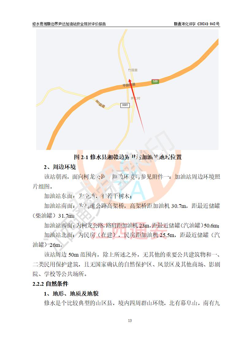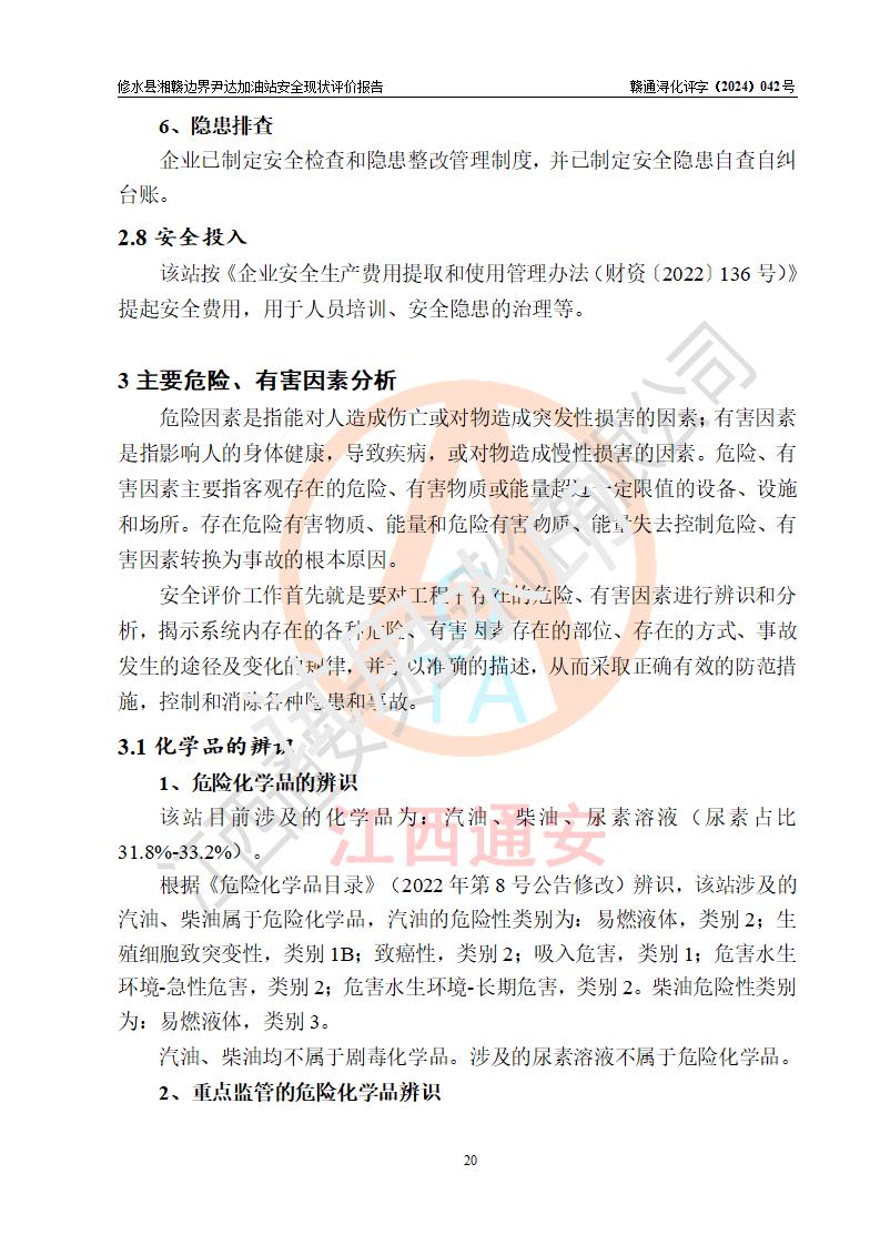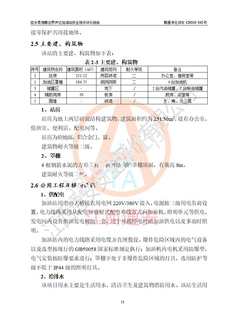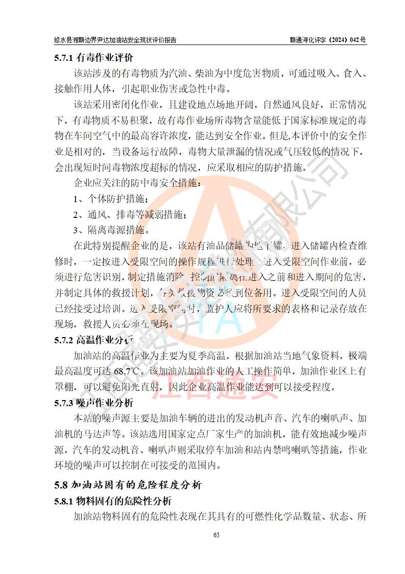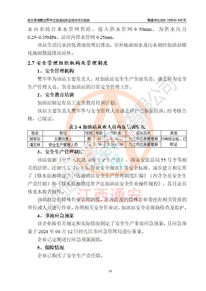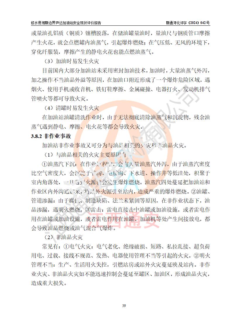 项目简介 | 修水县湘赣边界尹达加油站是一家专门从事成品油零售经营的个人独资企业,经营场所位于江西省九江市修水县大桥镇界上村8、9组。现有从业人员7名,其中安全管理人员1人,加油站负责人樊军华。 该加油站占地面积1602m2,站区内设置有4台双枪税控燃油加油机及配套的工艺管线,设有SF双层储罐4台,其中30m3的92#汽油储罐1台、30m3的95#汽油储罐1台、30m3的0#柴油储罐2台,油品储罐总容积为120m3(折算成汽油为90m3),按现行《汽车加油加气加氢站技术标准》对加油站的等级划分原则,属三级加油站。 该站由九江市行政审批局换发《危险化学品经营许可证》(证号:赣九行审经(甲)字[2021]000009号),**期限2021年05月28日至2024年05月27日。 | |||