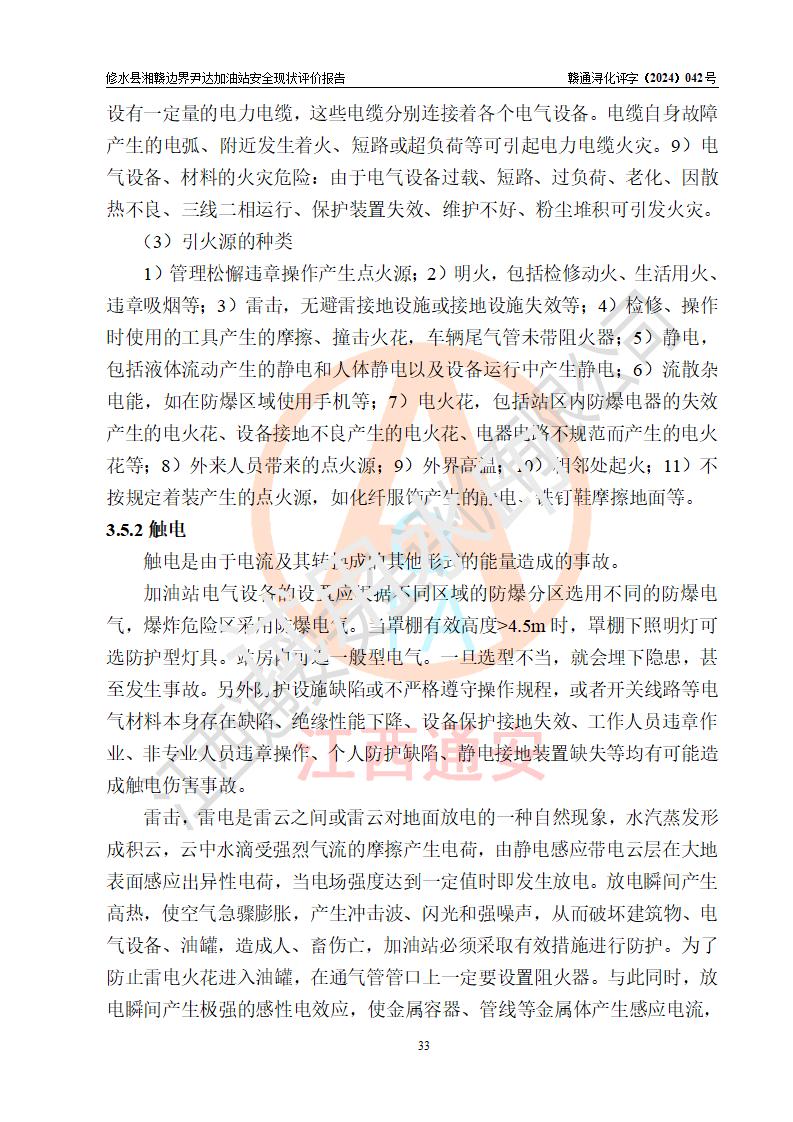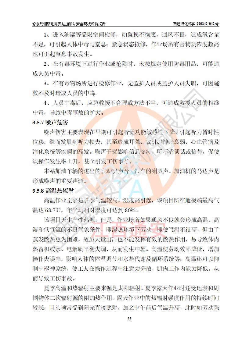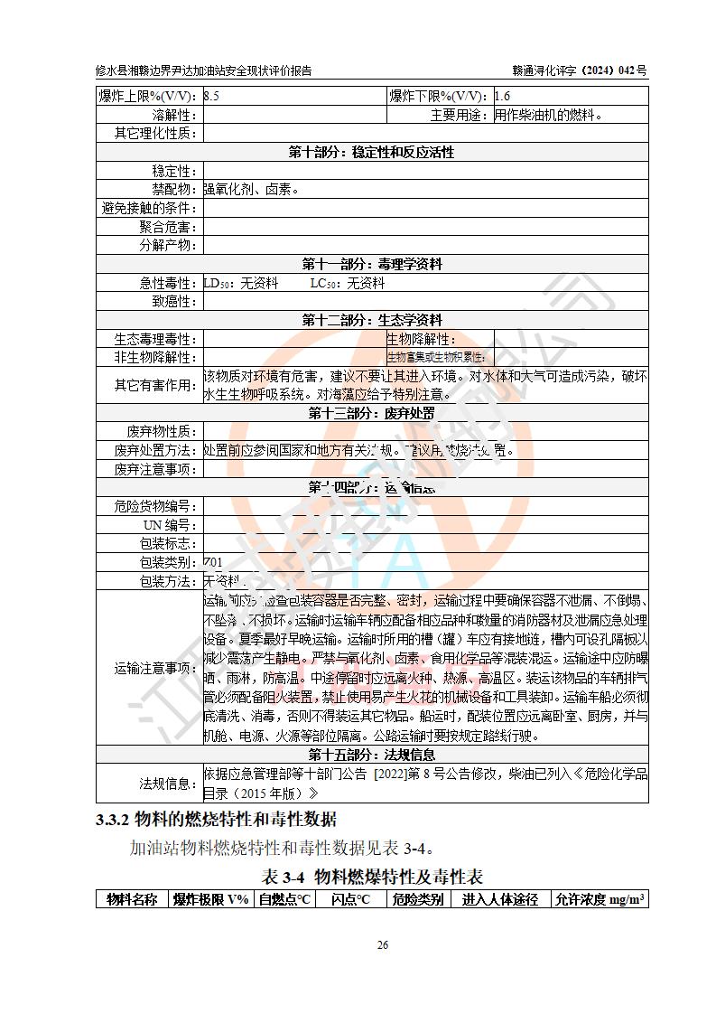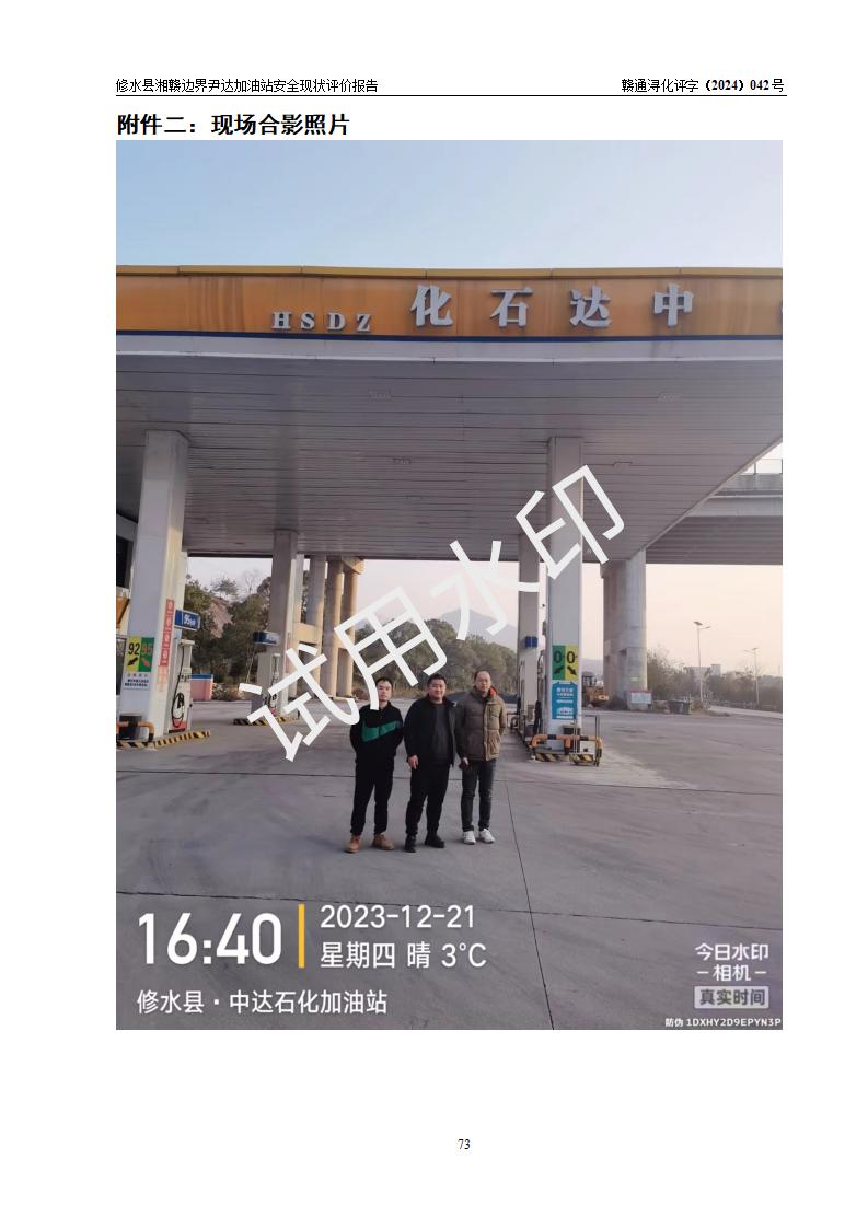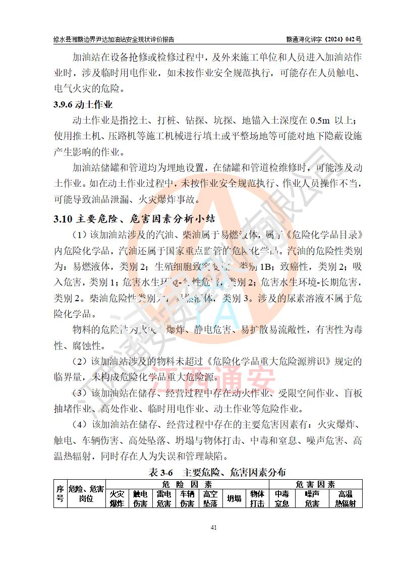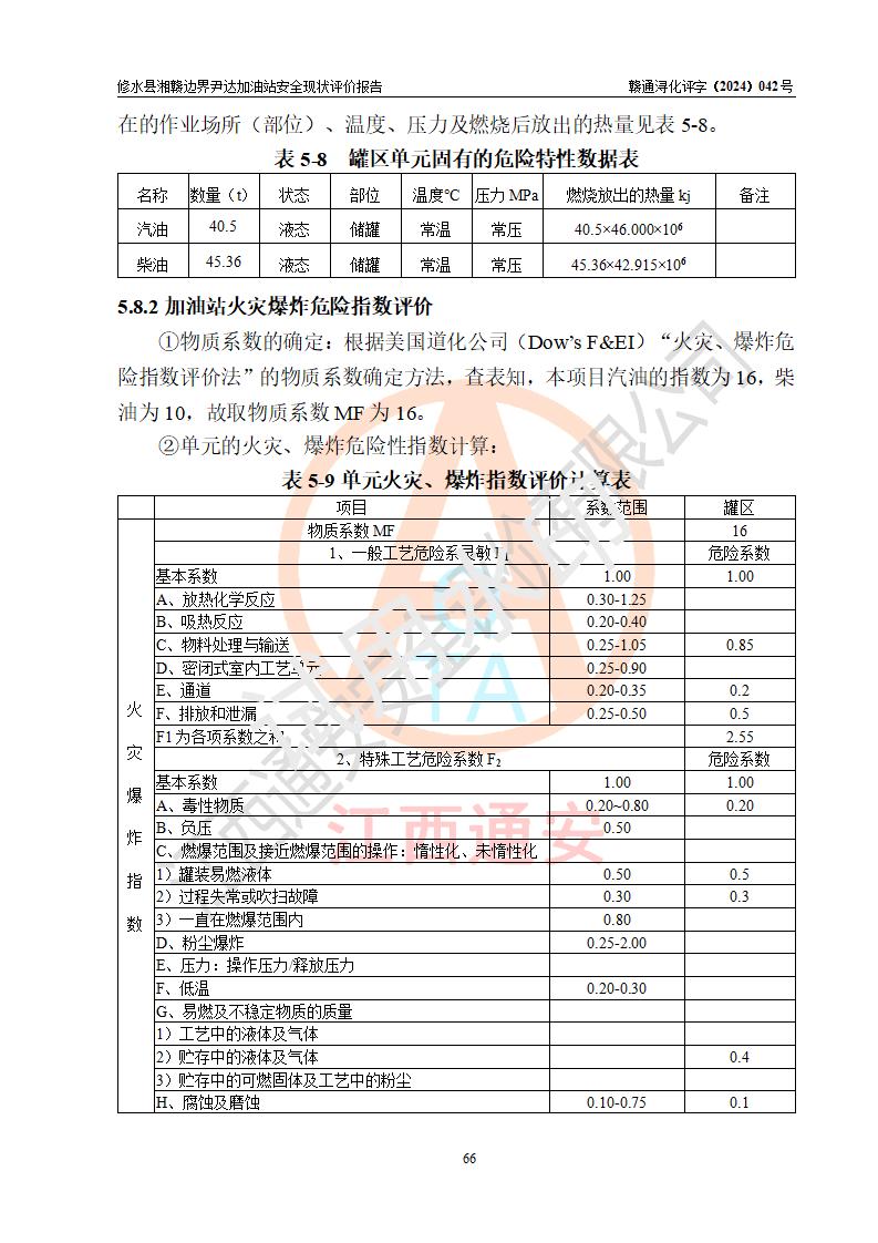 项目简介 | 修水县湘赣边界尹达加油站是一家专门从事成品油零售经营的个人独资企业,经营场所位于江西省九江市修水县大桥镇界上村8、9组。现有从业人员7名,其中安全管理人员1人,加油站负责人樊军华。 该加油站占地面积1602m2,站区内设置有4台双枪税控燃油加油机及配套的工艺管线,设有SF双层储罐4台,其中30m3的92#汽油储罐1台、30m3的95#汽油储罐1台、30m3的0#柴油储罐2台,油品储罐总容积为120m3(折算成汽油为90m3),按现行《汽车加油加气加氢站技术标准》对加油站的等级划分原则,属三级加油站。 该站由九江市行政审批局换发《危险化学品经营许可证》(证号:赣九行审经(甲)字[2021]000009号),**期限2021年05月28日至2024年05月27日。 | |||