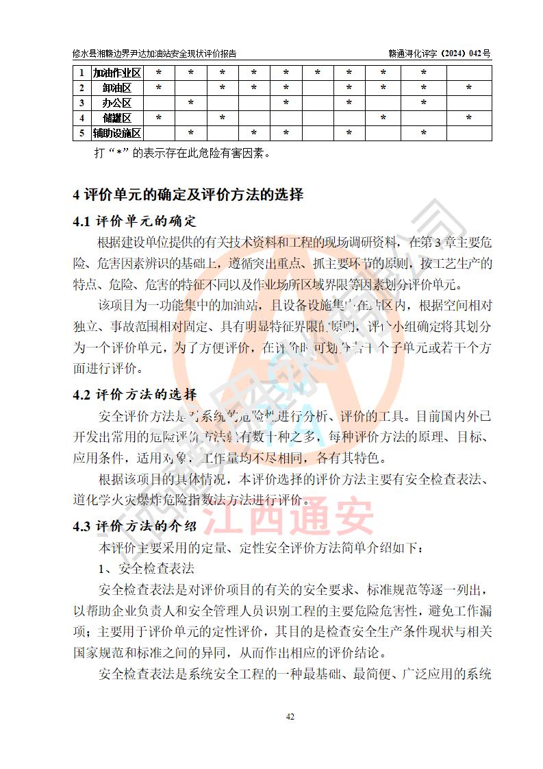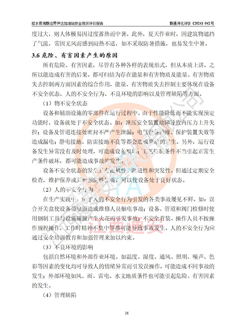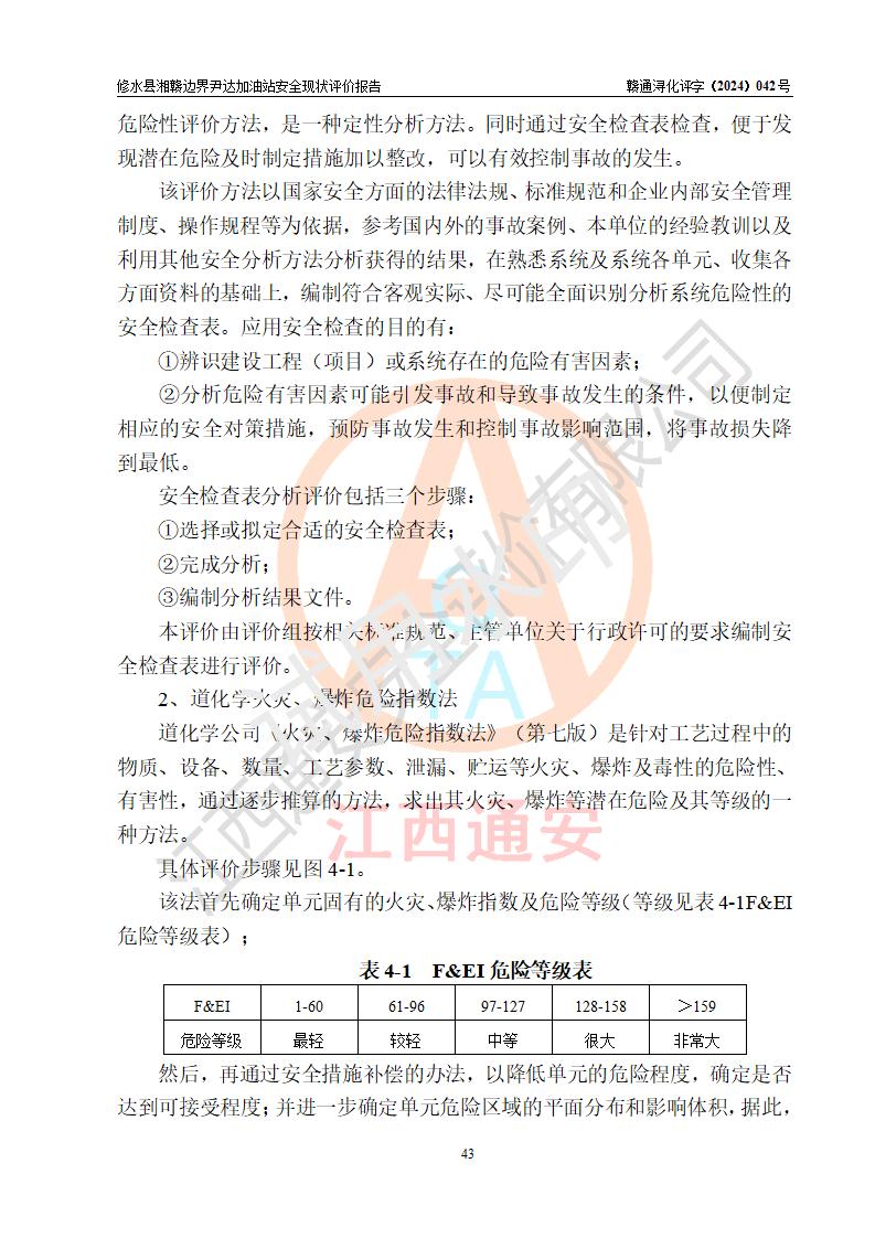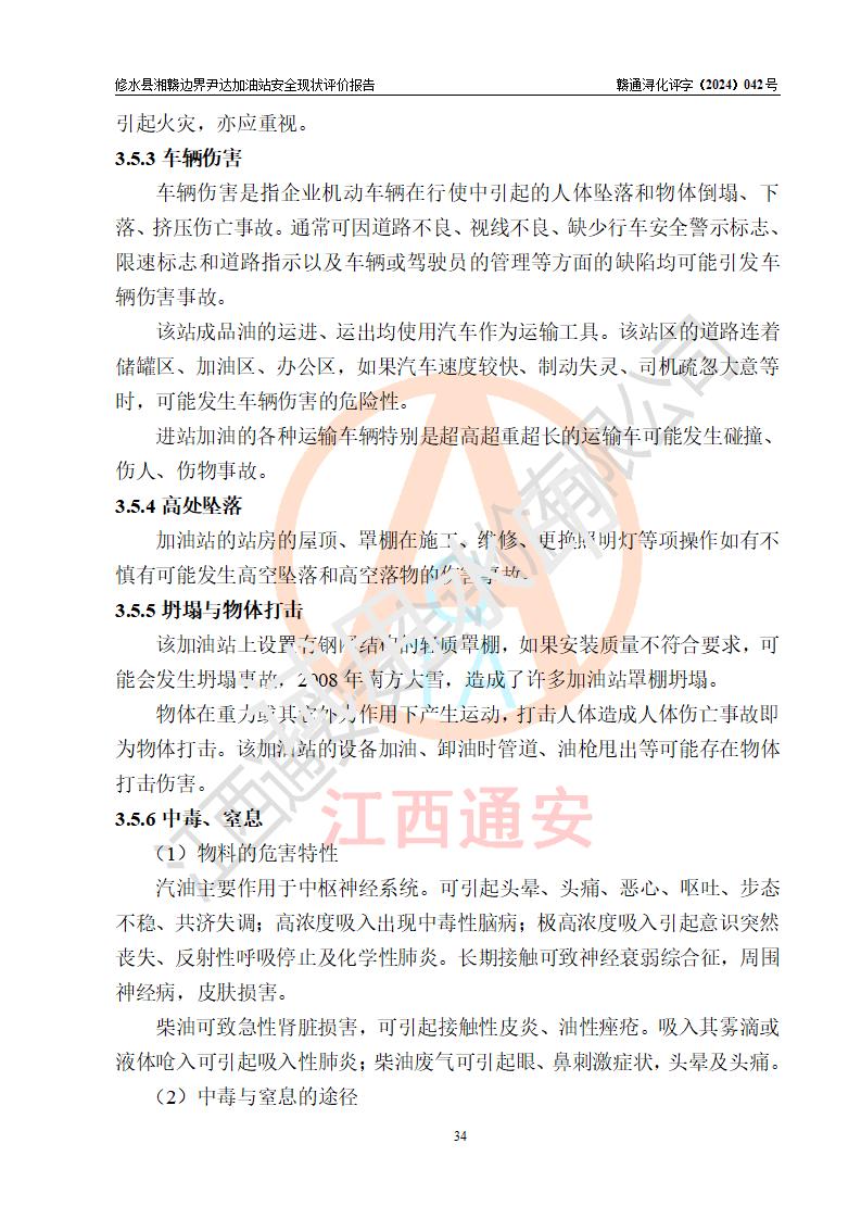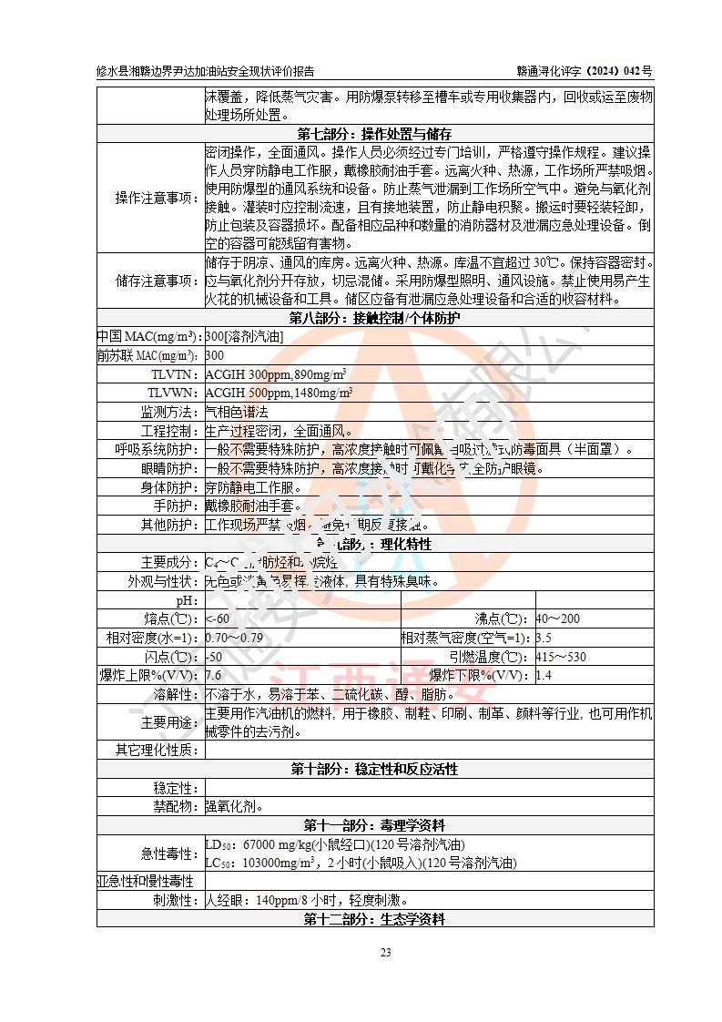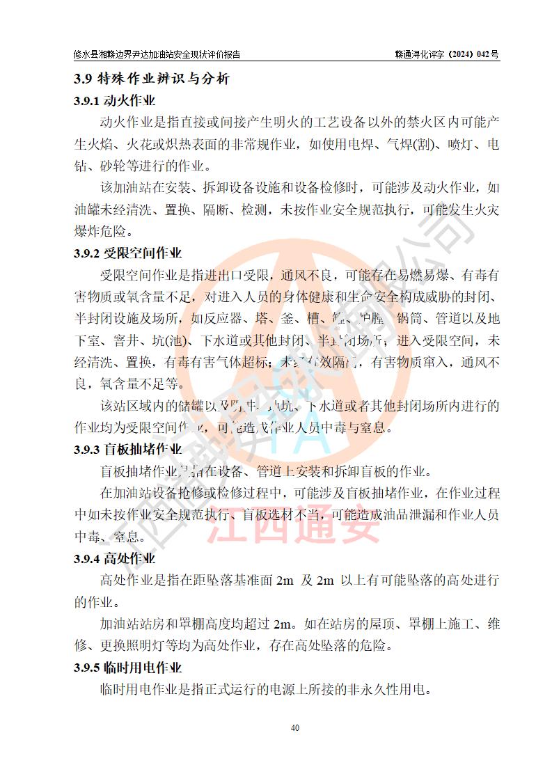 项目简介 | 修水县湘赣边界尹达加油站是一家专门从事成品油零售经营的个人独资企业,经营场所位于江西省九江市修水县大桥镇界上村8、9组。现有从业人员7名,其中安全管理人员1人,加油站负责人樊军华。 该加油站占地面积1602m2,站区内设置有4台双枪税控燃油加油机及配套的工艺管线,设有SF双层储罐4台,其中30m3的92#汽油储罐1台、30m3的95#汽油储罐1台、30m3的0#柴油储罐2台,油品储罐总容积为120m3(折算成汽油为90m3),按现行《汽车加油加气加氢站技术标准》对加油站的等级划分原则,属三级加油站。 该站由九江市行政审批局换发《危险化学品经营许可证》(证号:赣九行审经(甲)字[2021]000009号),**期限2021年05月28日至2024年05月27日。 | |||