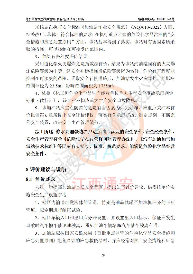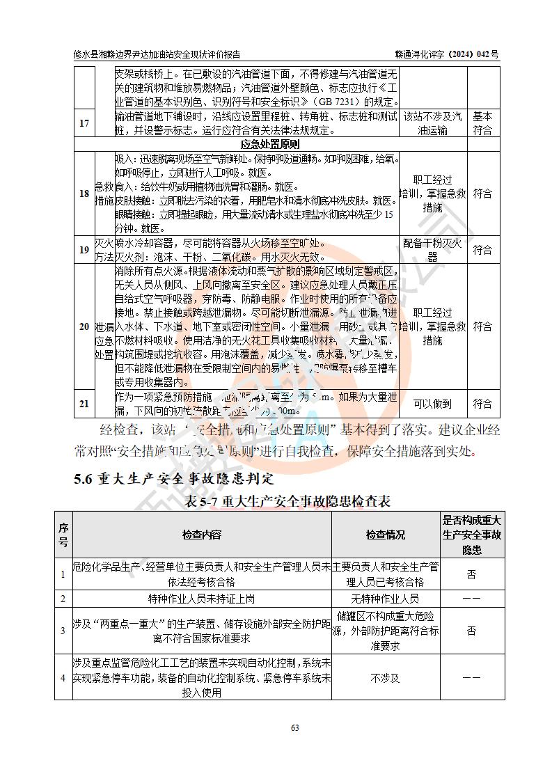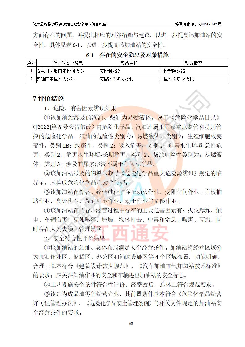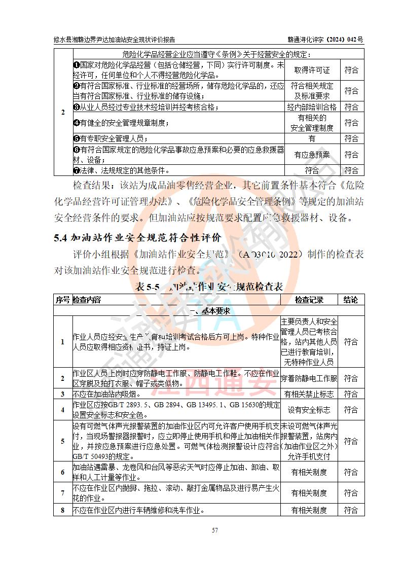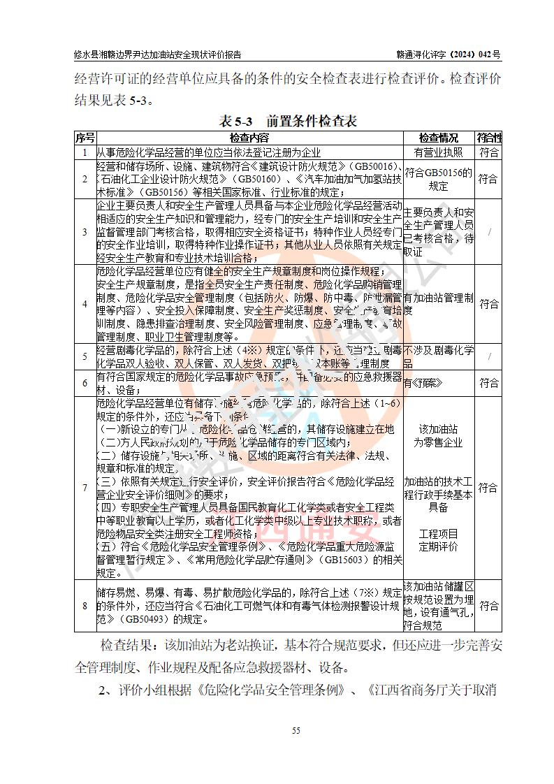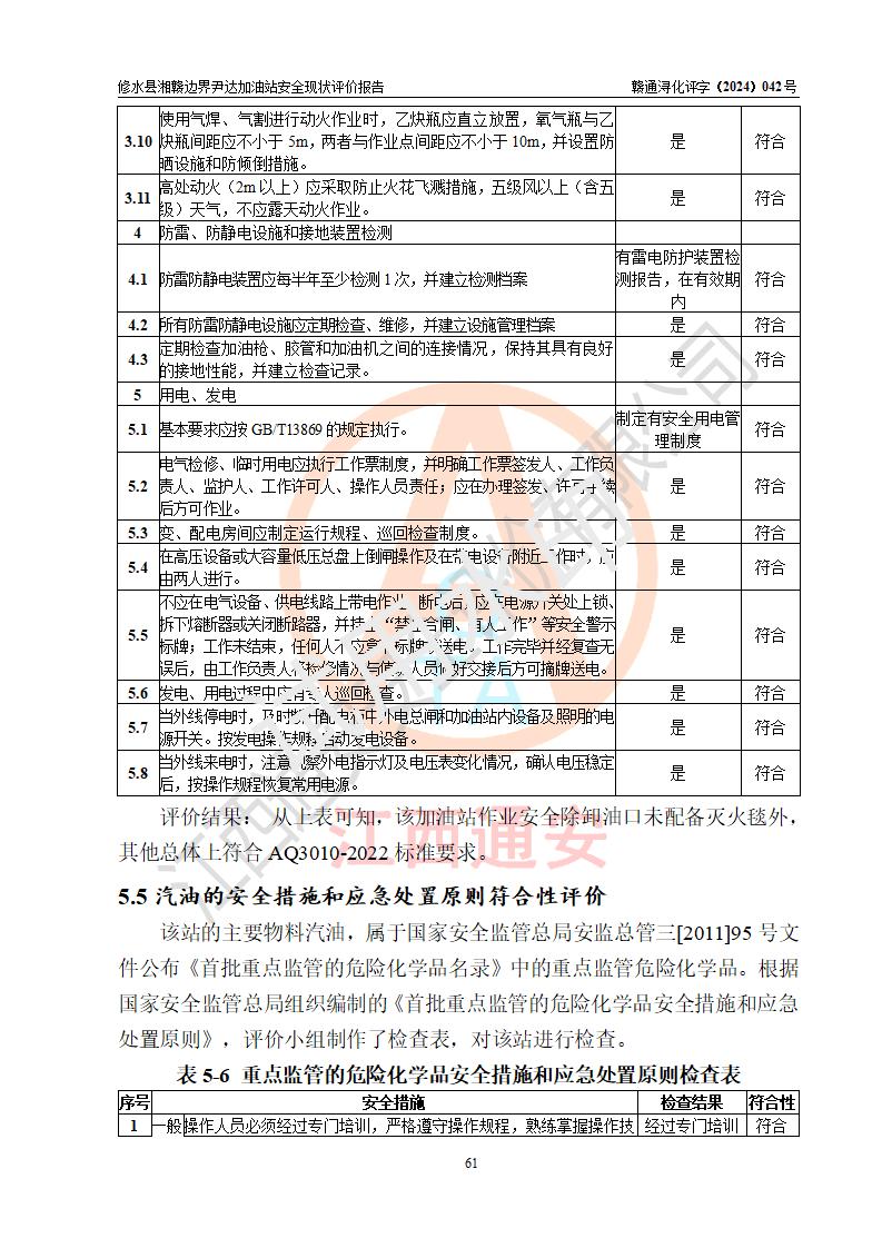 评价结论 | 修水县湘赣边界尹达加油站涉及的安全条件、安全经营条件、安全生产管理符合《危险化学品经营许可证管理办法》、《汽车加油加气加氢站技术标准》等**有关法规、标准、规范要求,能满足危险化学品经营安全条件。 | |||