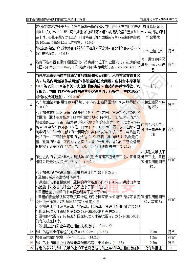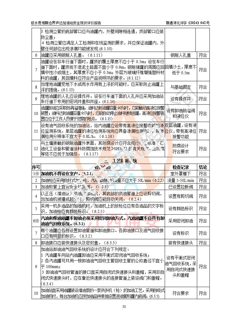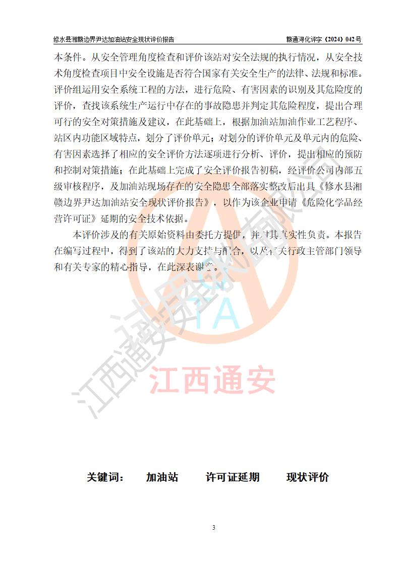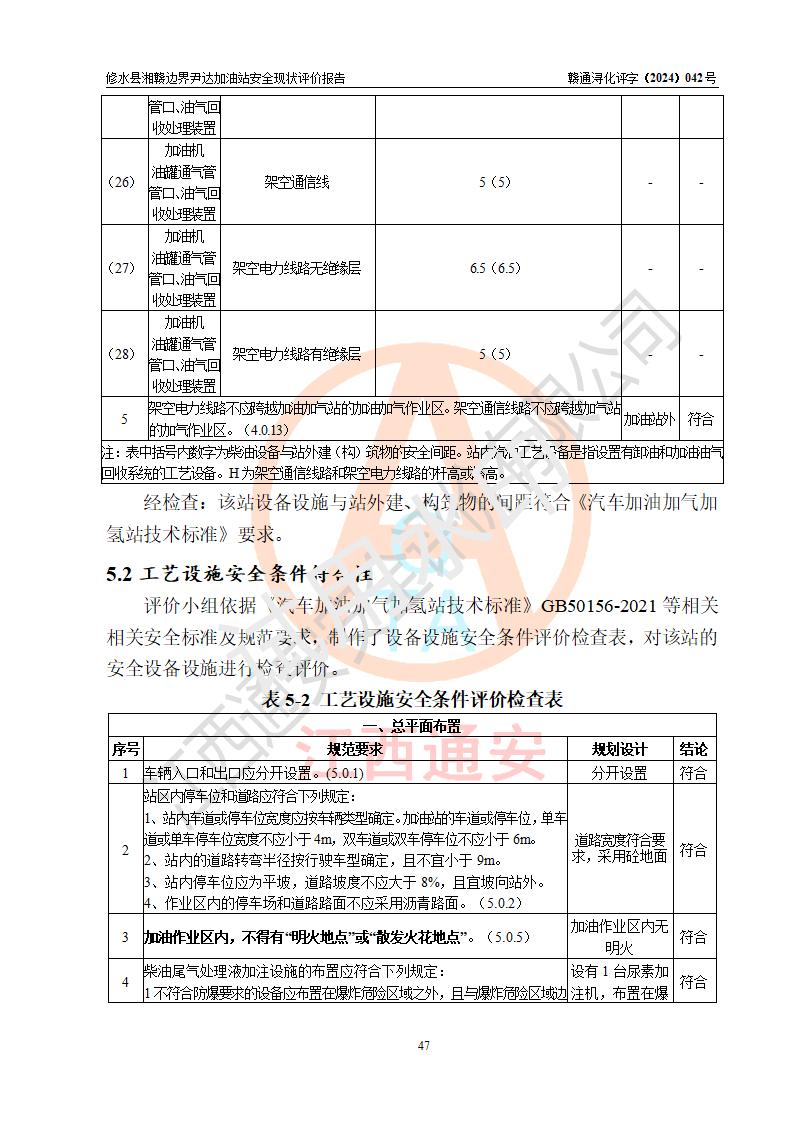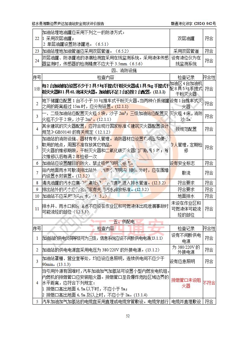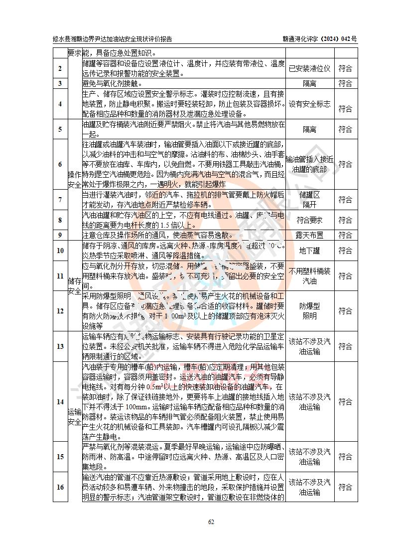 评价结论 | 修水县湘赣边界尹达加油站涉及的安全条件、安全经营条件、安全生产管理符合《危险化学品经营许可证管理办法》、《汽车加油加气加氢站技术标准》等**有关法规、标准、规范要求,能满足危险化学品经营安全条件。 | |||