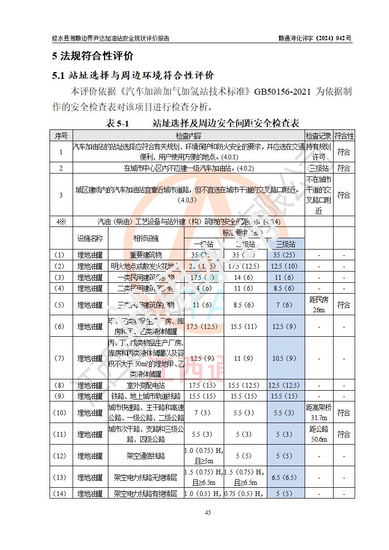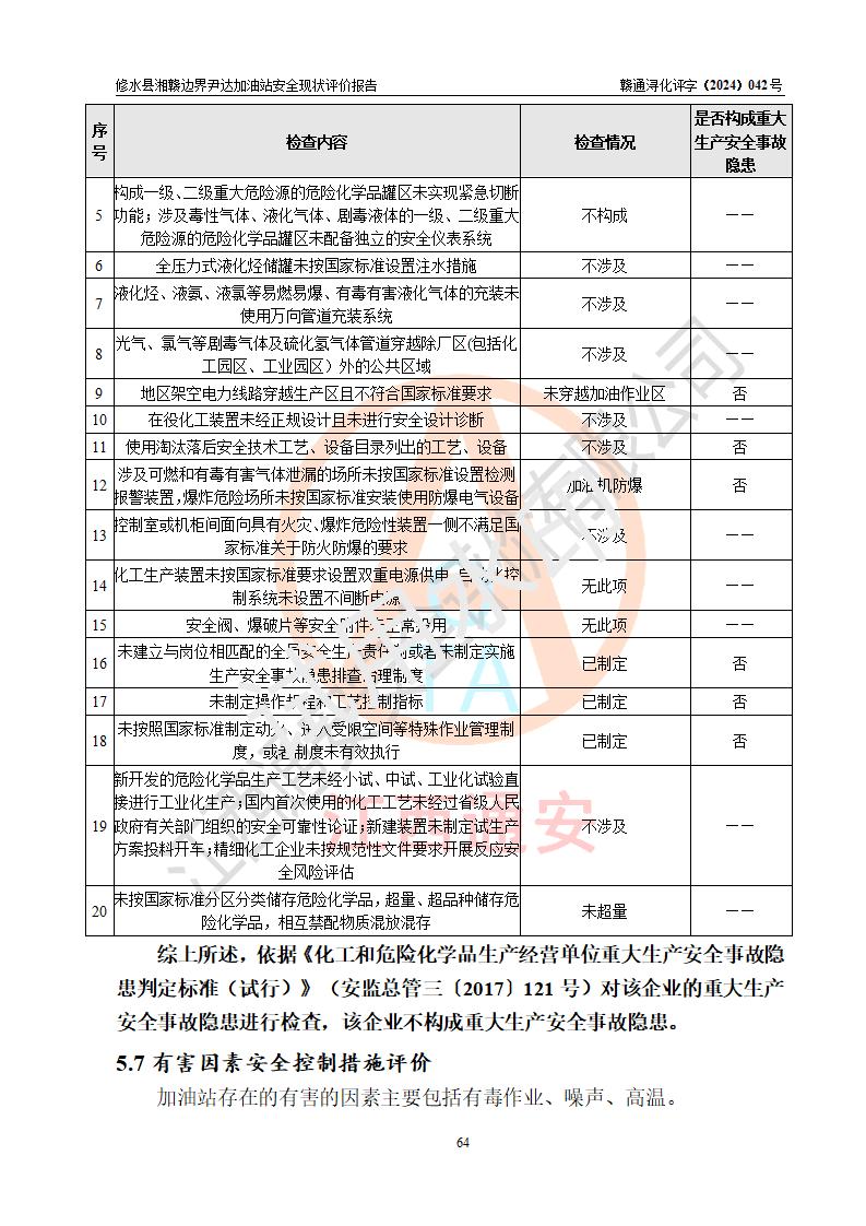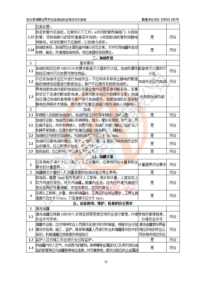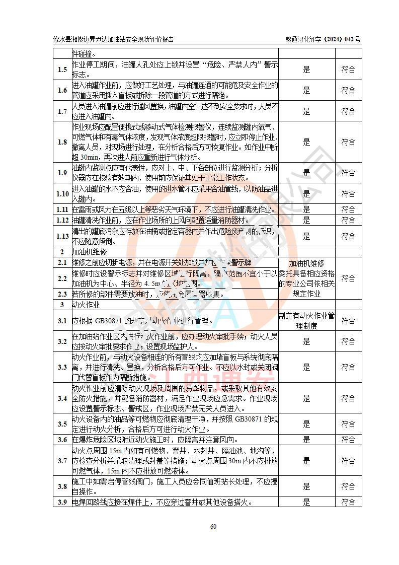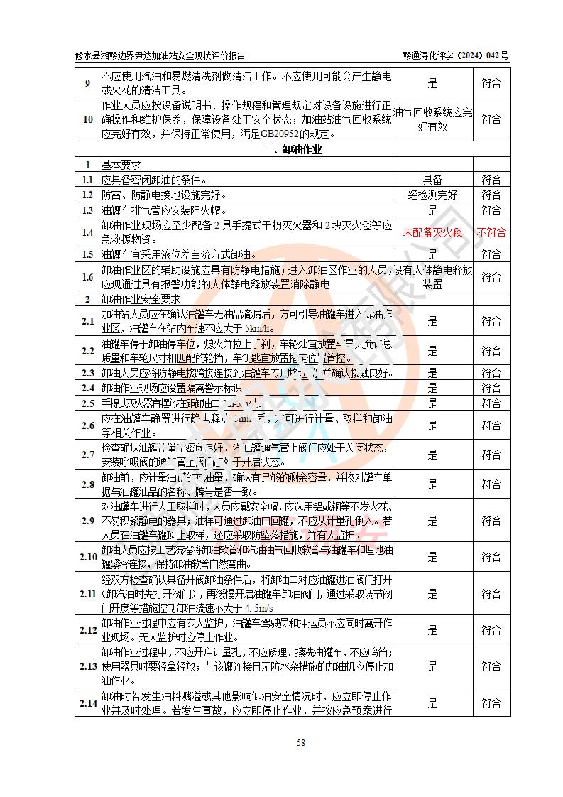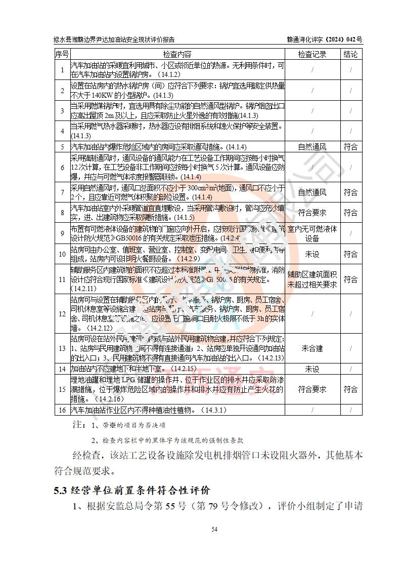 评价结论 | 修水县湘赣边界尹达加油站涉及的安全条件、安全经营条件、安全生产管理符合《危险化学品经营许可证管理办法》、《汽车加油加气加氢站技术标准》等**有关法规、标准、规范要求,能满足危险化学品经营安全条件。 | |||