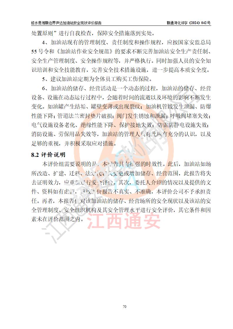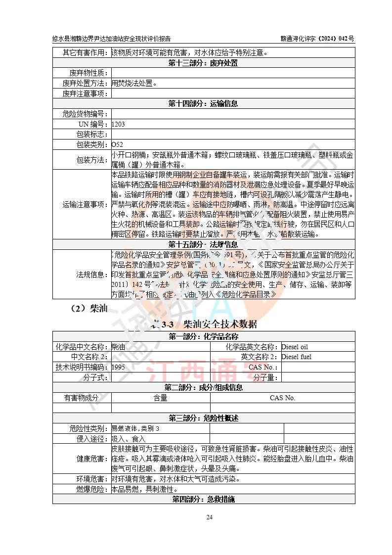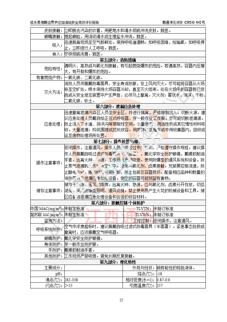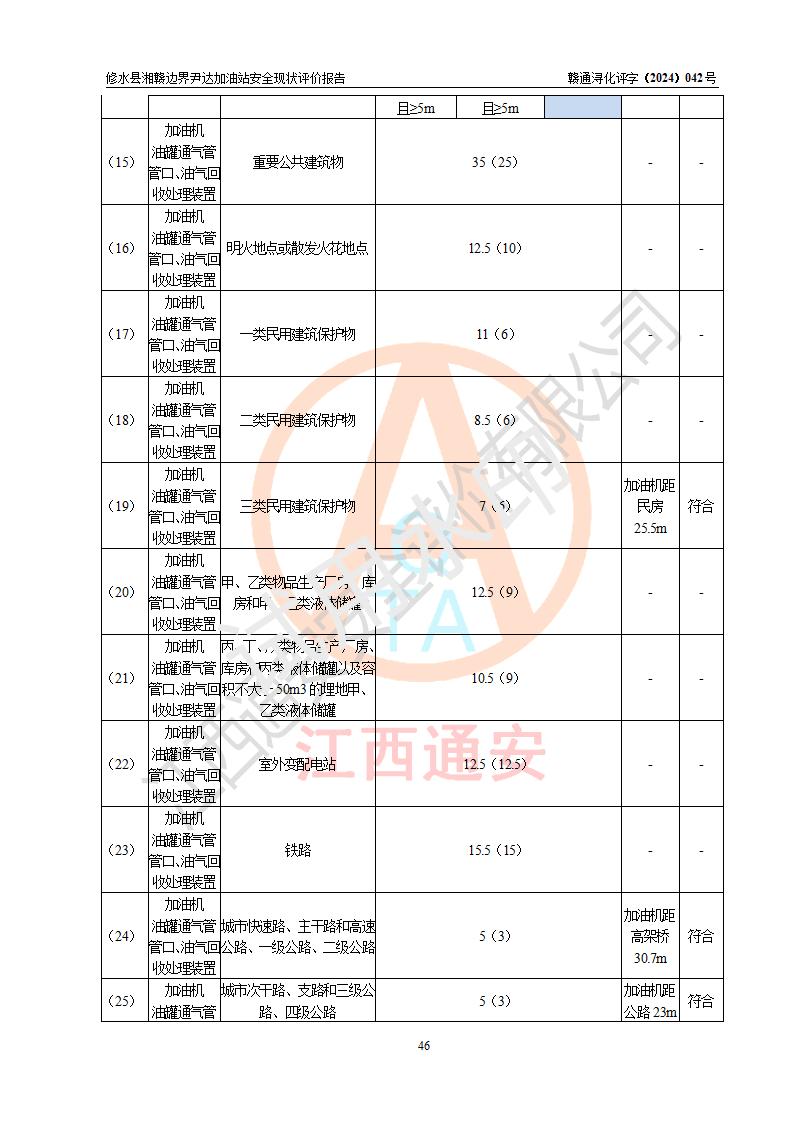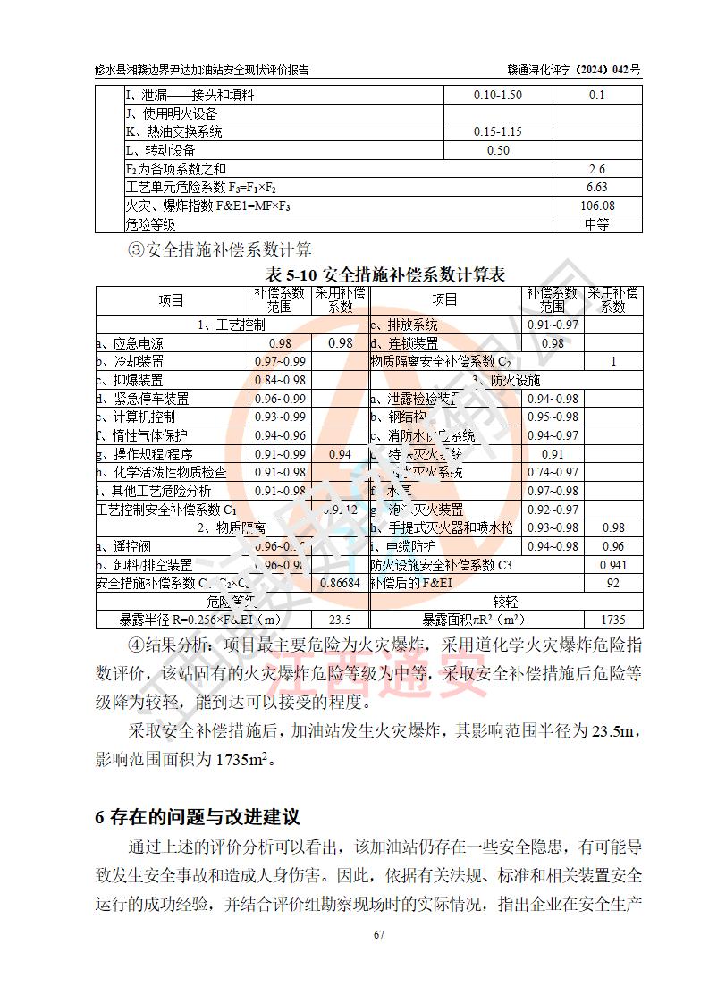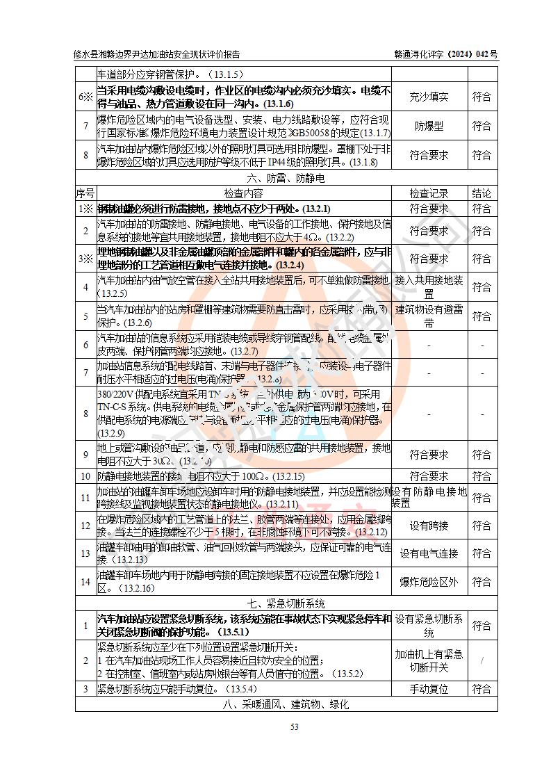 评价结论 | 修水县湘赣边界尹达加油站涉及的安全条件、安全经营条件、安全生产管理符合《危险化学品经营许可证管理办法》、《汽车加油加气加氢站技术标准》等**有关法规、标准、规范要求,能满足危险化学品经营安全条件。 | |||