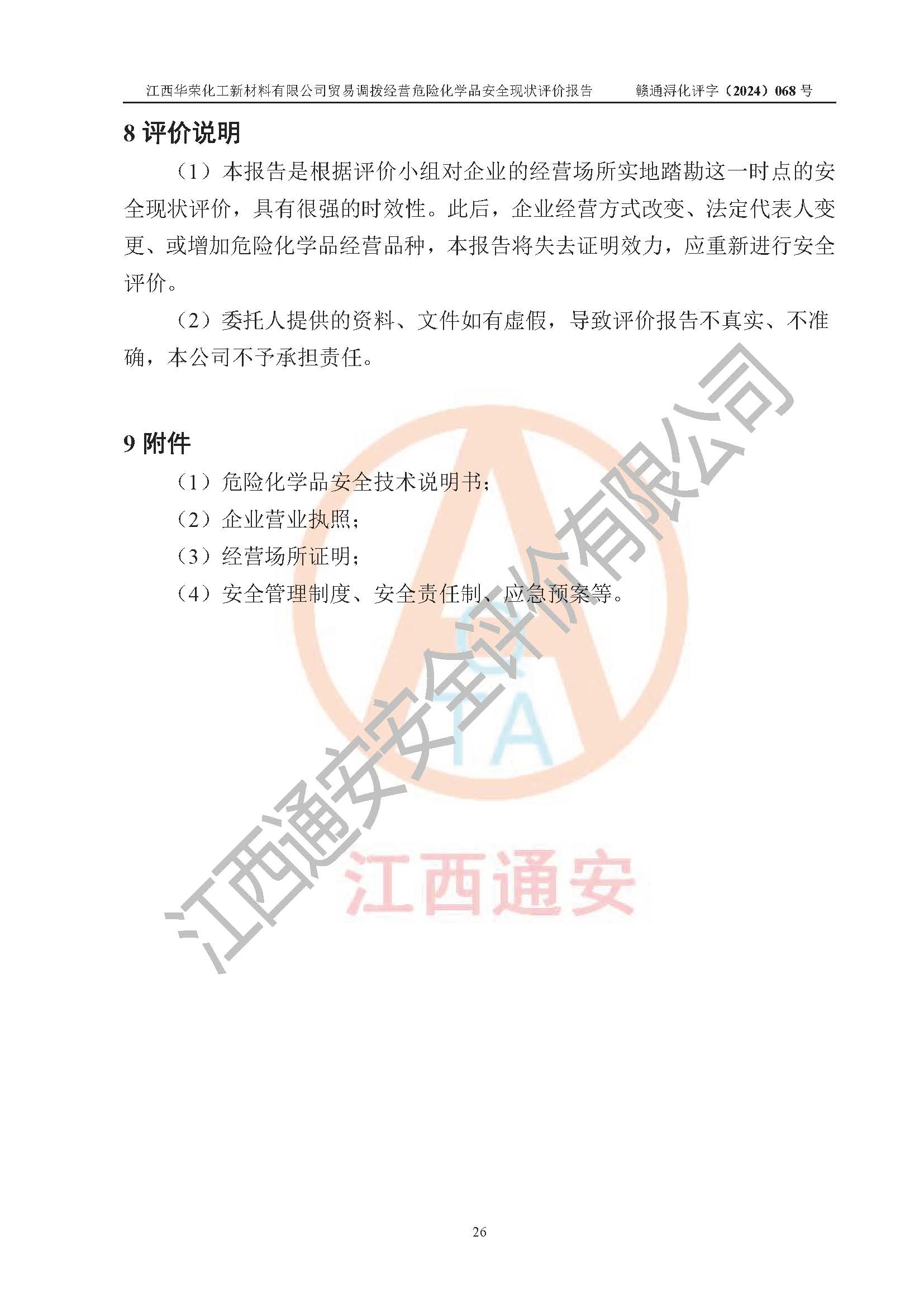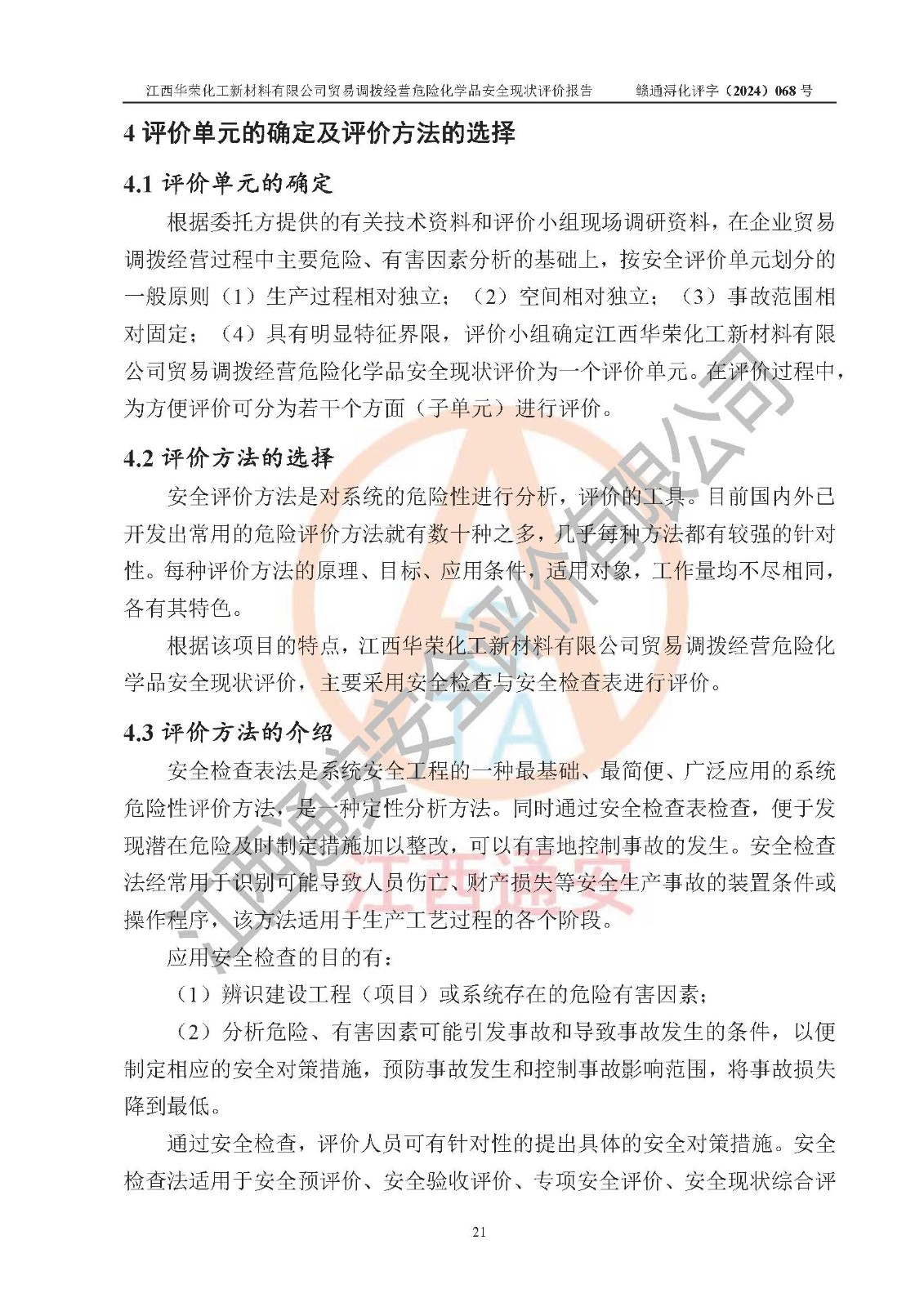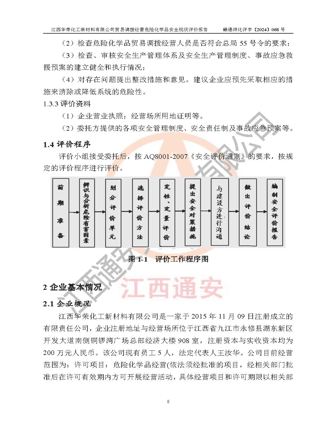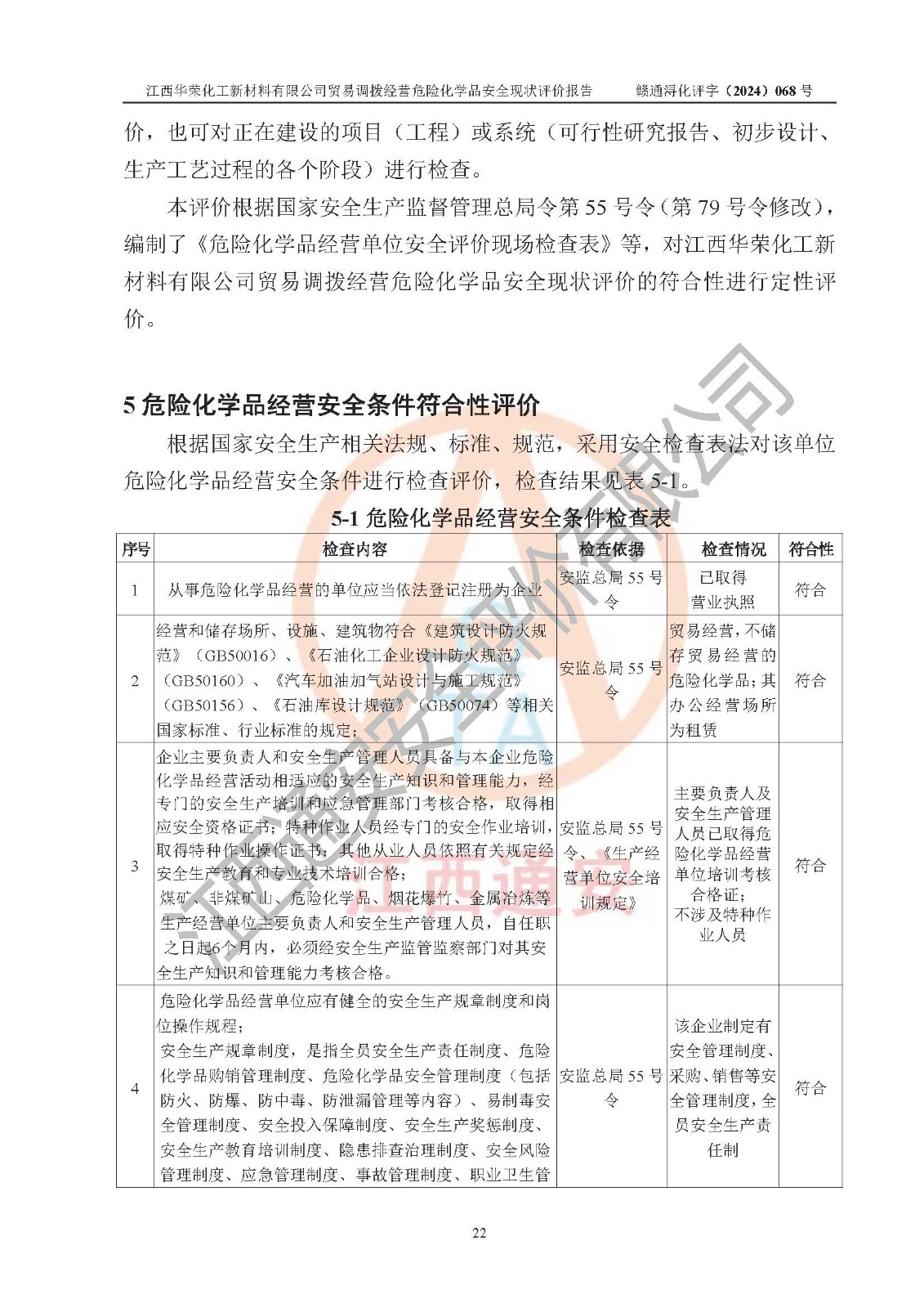 评价结论 | 综上所述:江西华荣化工新材料有限公司贸易调拨经营危险化学品的安全条件符合**有关法规、标准、规范要求,风险可控,具备危险化学品贸易调拨经营的安全条件。 | ||||||