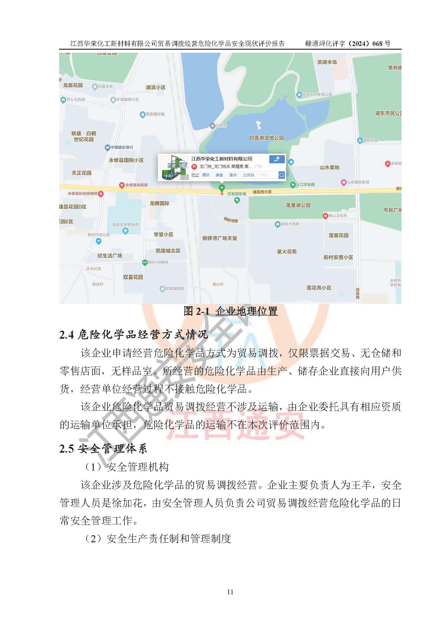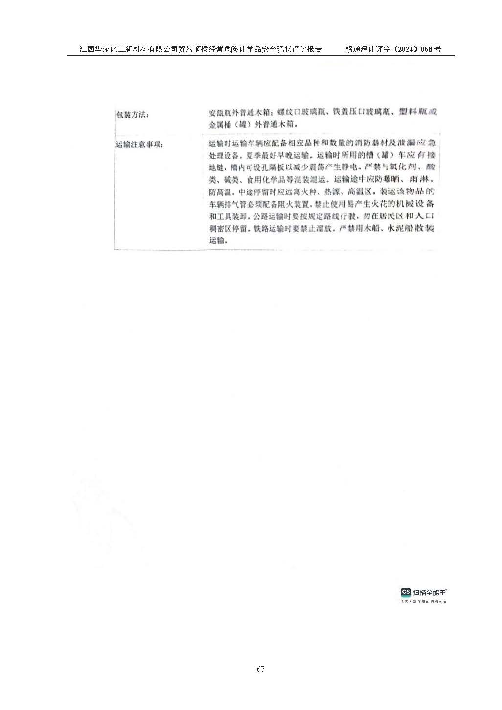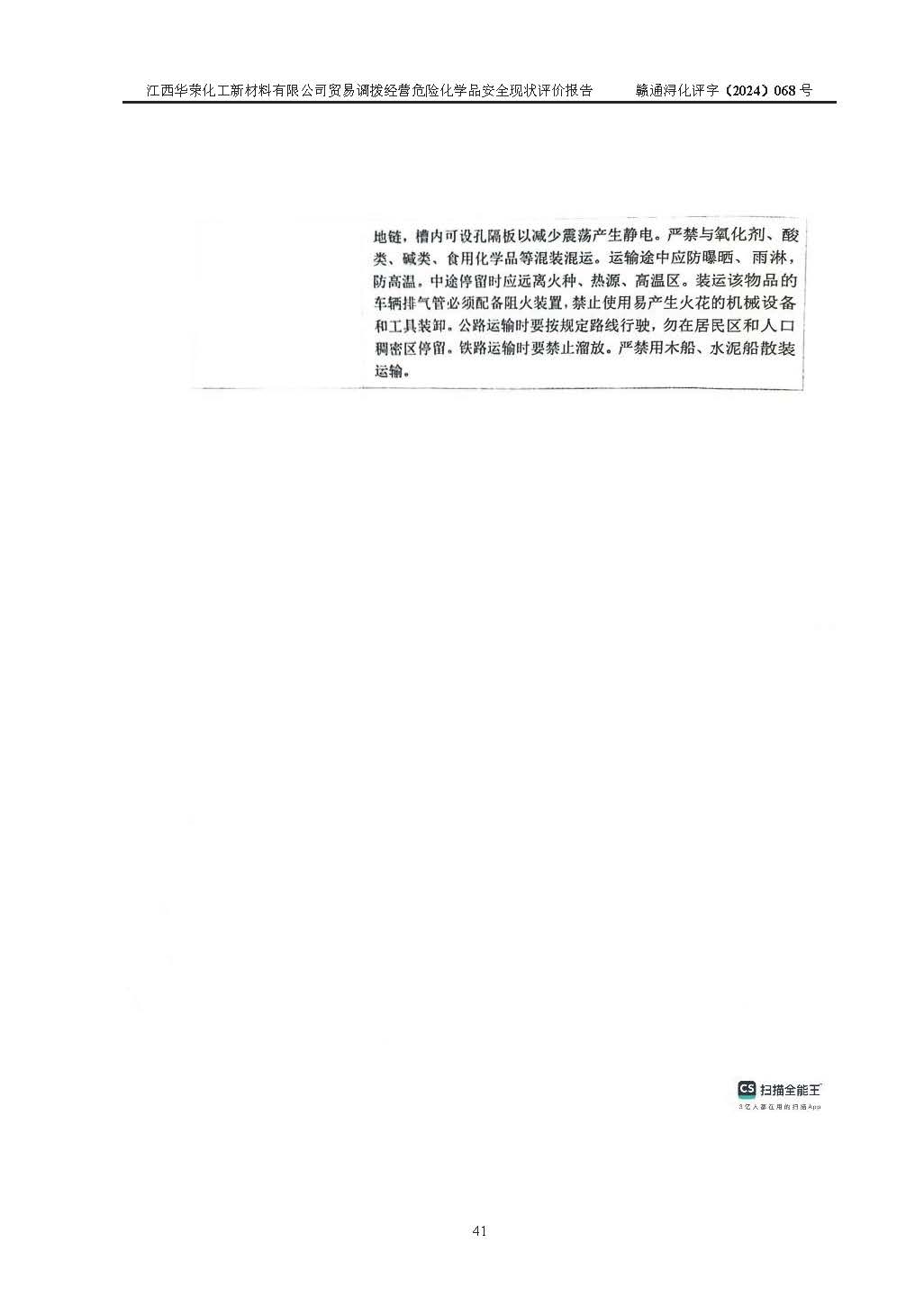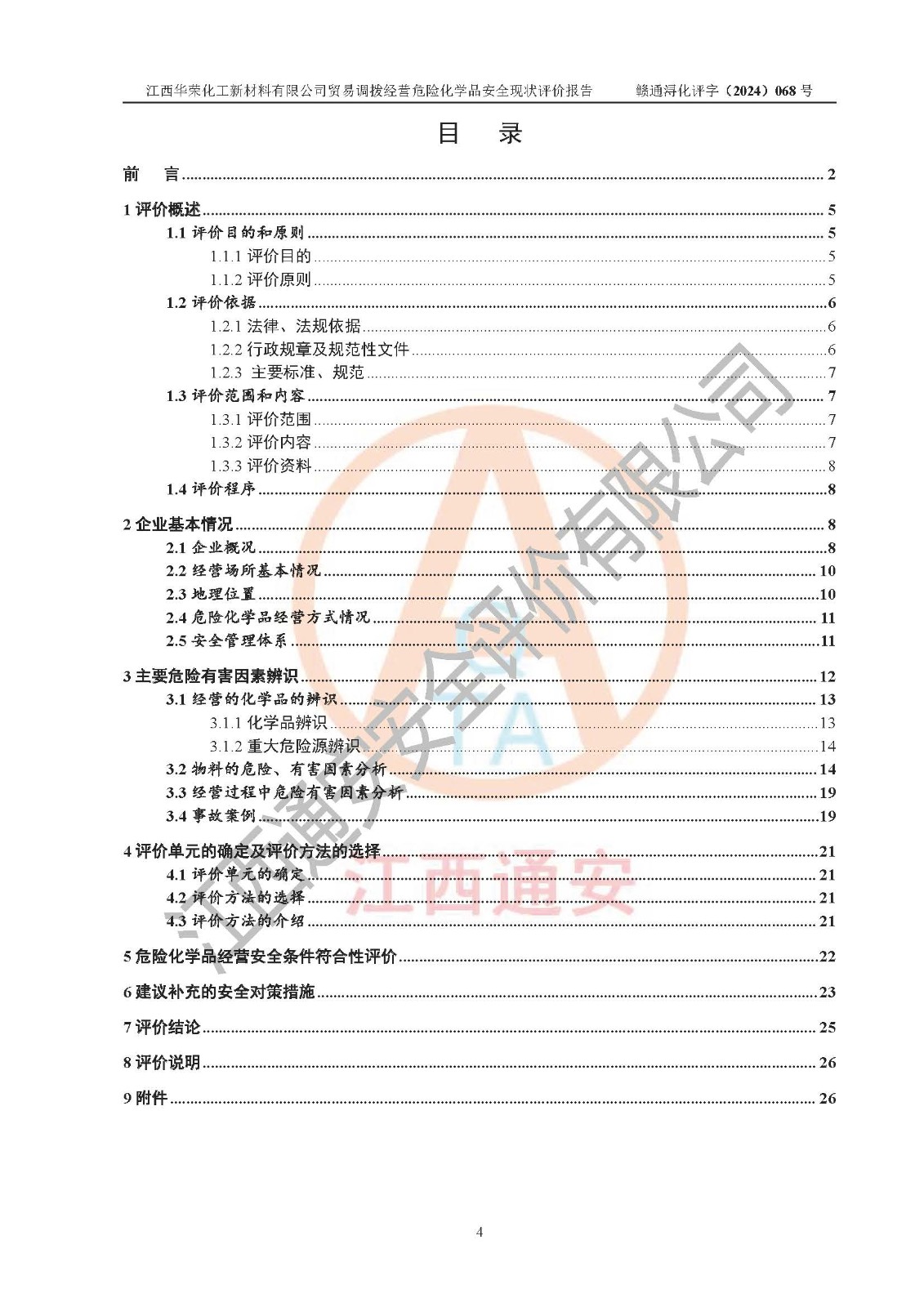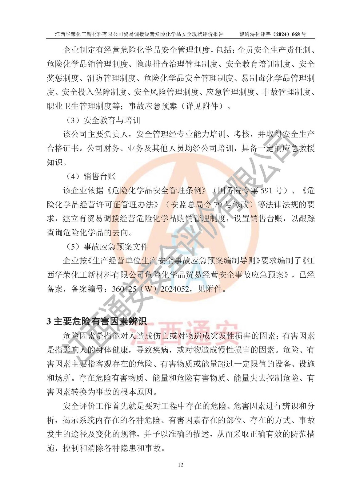 评价结论 | 综上所述:江西华荣化工新材料有限公司贸易调拨经营危险化学品的安全条件符合**有关法规、标准、规范要求,风险可控,具备危险化学品贸易调拨经营的安全条件。 | ||||||