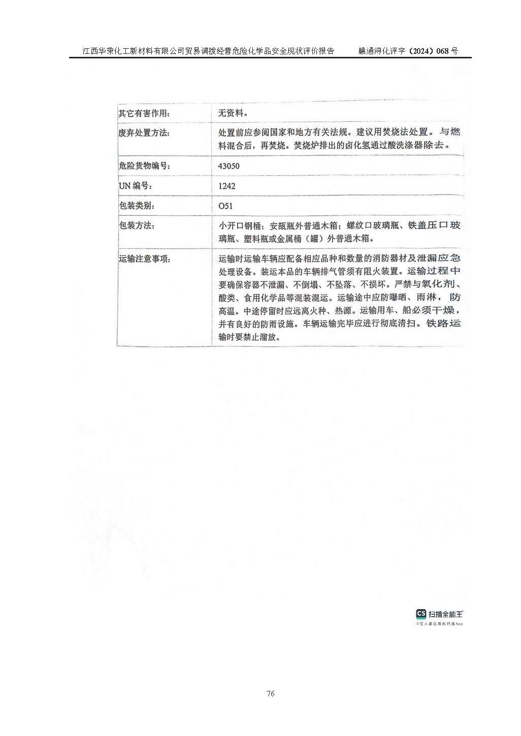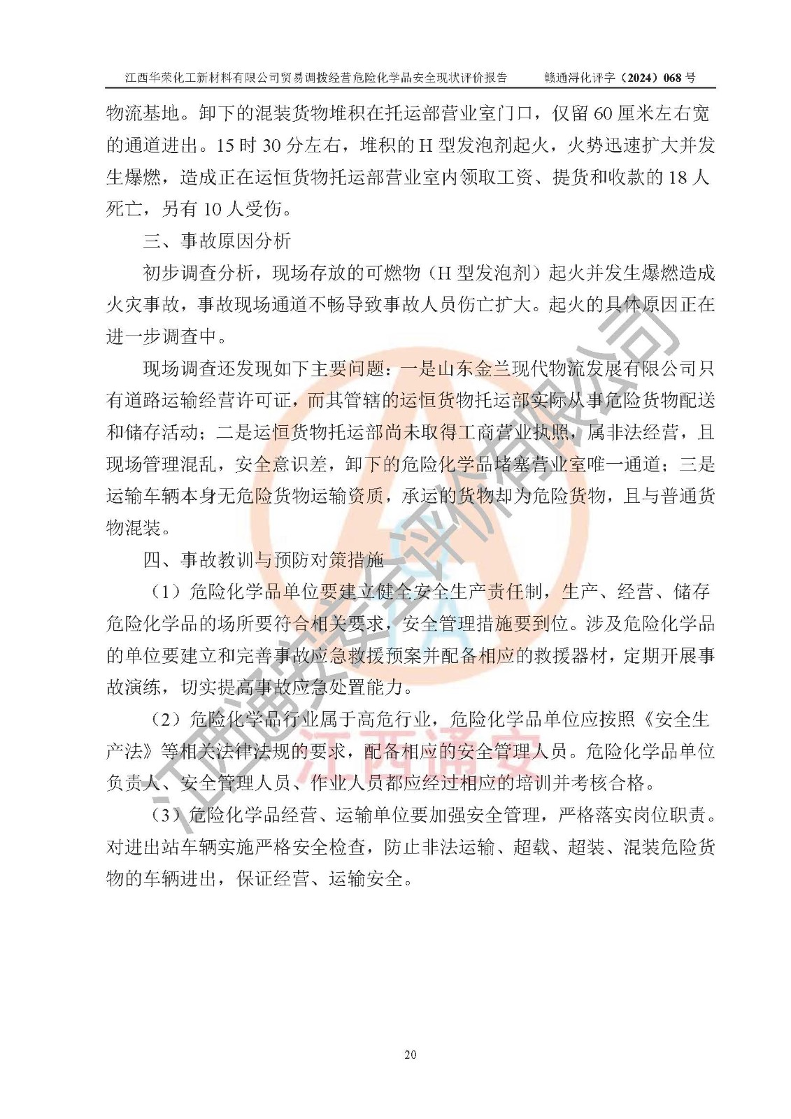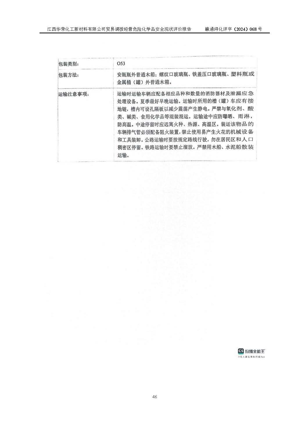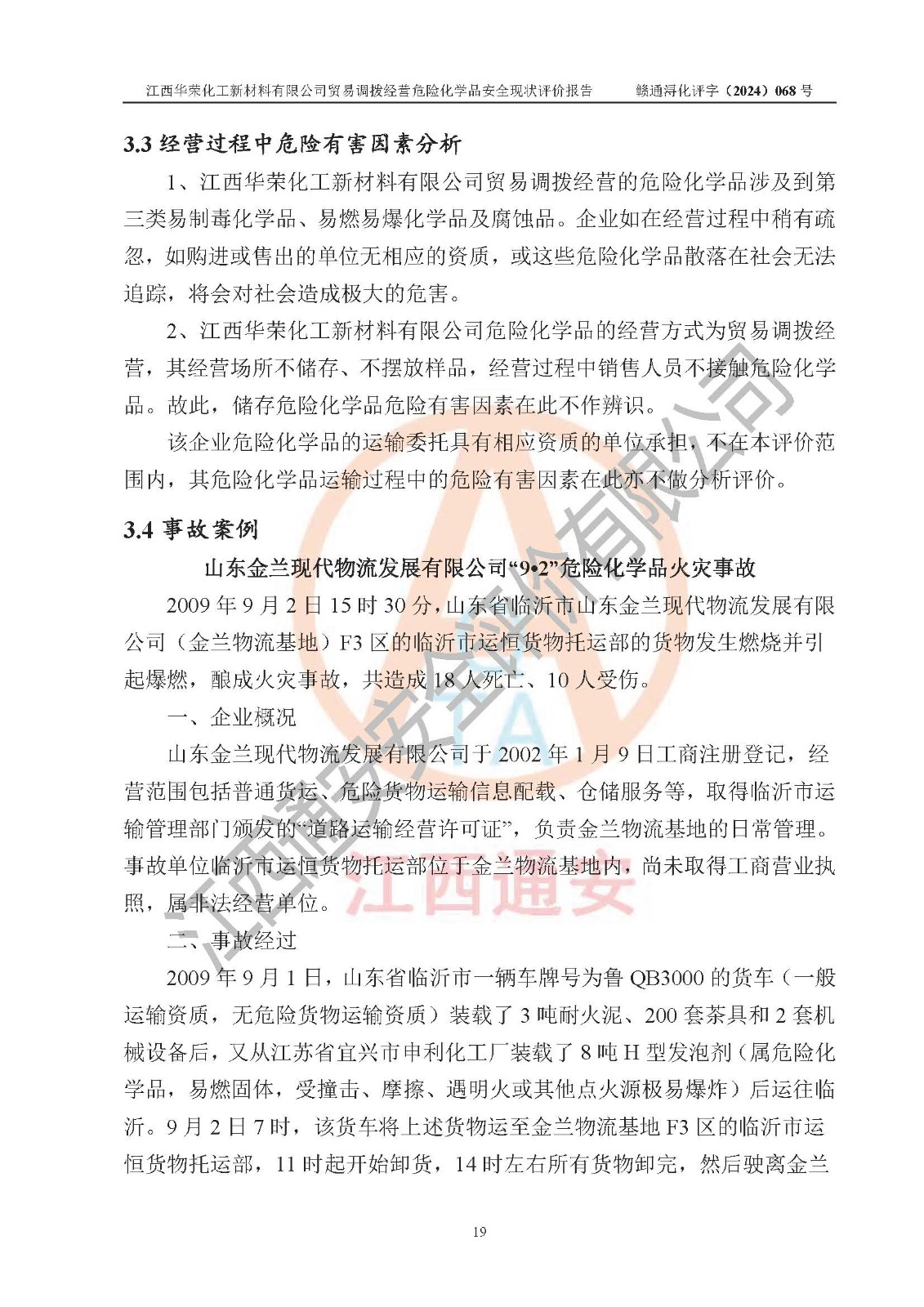 评价结论 | 综上所述:江西华荣化工新材料有限公司贸易调拨经营危险化学品的安全条件符合**有关法规、标准、规范要求,风险可控,具备危险化学品贸易调拨经营的安全条件。 | ||||||