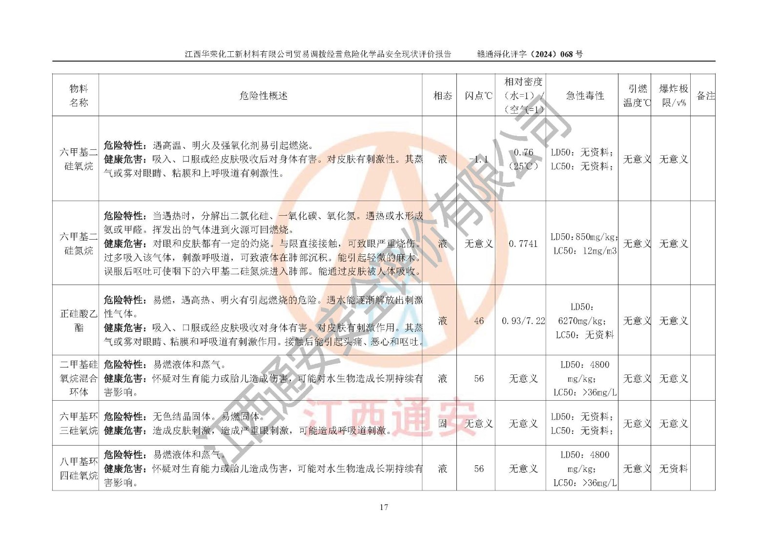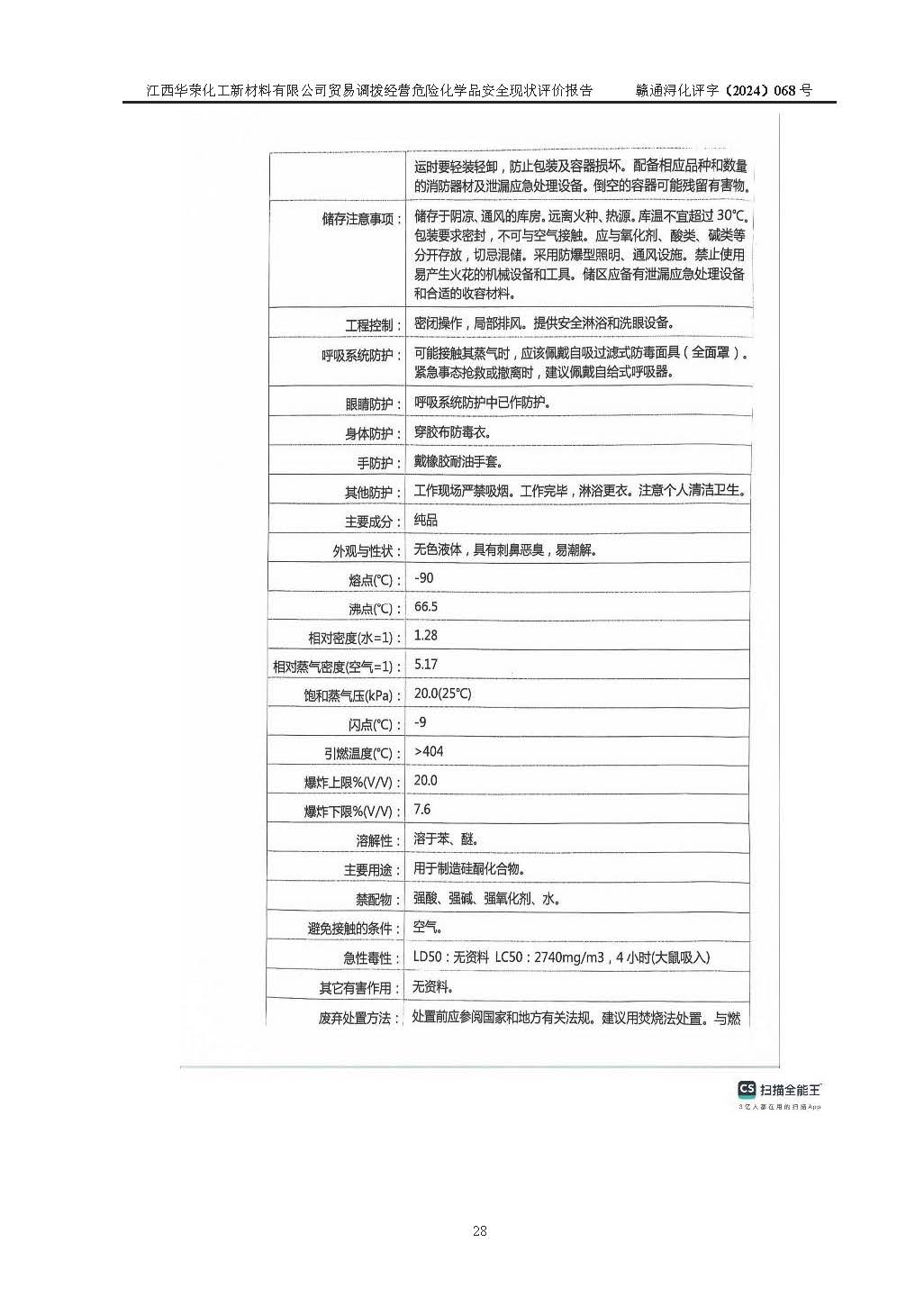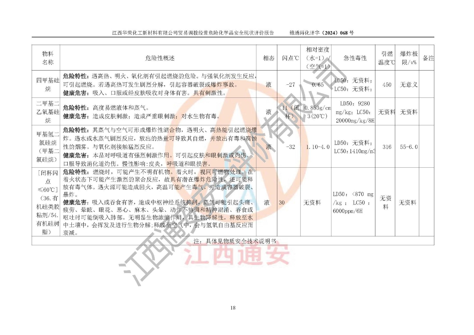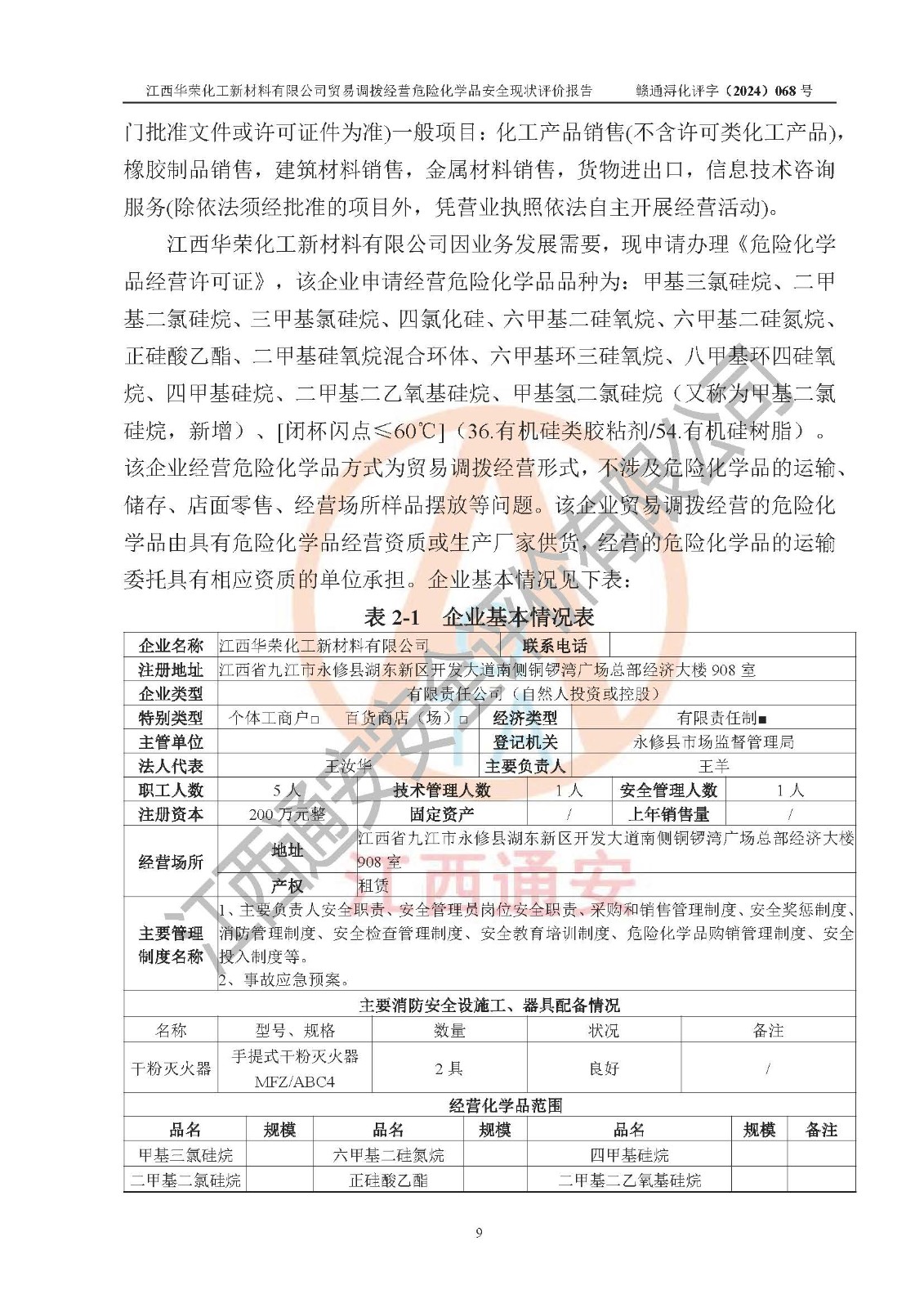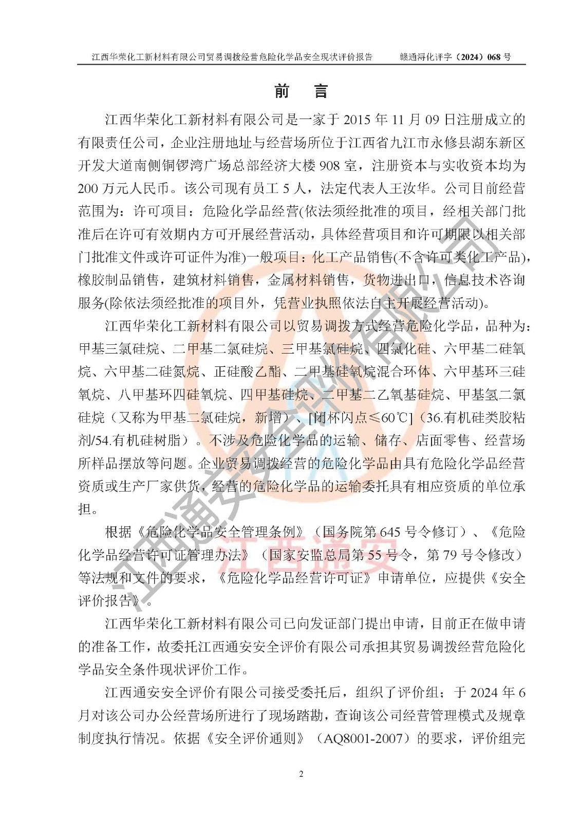 项目简介 | 江西华荣化工新材料有限公司是一家于2015年11月09日注册成立的有限责任公司,企业注册地址与经营场所位于江西省九江市永修县湖东新区开发大道南侧铜锣湾广场总部经济大楼908室,注册资本与实收资本均为200万元人民币。该公司现有员工5人,法定**人王汝华。公司目前经营范围为:许可项目:危险化学品经营(依法须经批准的项目,经相关部门批准后在许可**期内方可开展经营活动,具体经营项目和许可期限以相关部门批准文件或许可证件为准)一般项目:化工产品销售(不含许可类化工产品),橡胶制品销售,建筑材料销售,金属材料销售,货物进出口,信息技术咨询服务(除依法须经批准的项目外,凭营业执照依法自主开展经营活动)。 江西华荣化工新材料有限公司以贸易调拨方式经营危险化学品,品种为:甲基三氯硅烷、二甲基二氯硅烷、**基氯硅烷、四氯化硅、六甲基二硅氧烷、六甲基二硅氮烷、正硅酸乙酯、二甲基硅氧烷混合环体、六甲基环三硅氧烷、八甲基环四硅氧烷、四甲基硅烷、二甲基二乙氧基硅烷、甲基氢二氯硅烷(又称为甲基二氯硅烷,新增)、[闭杯闪点≤60℃](36.有机硅类胶粘剂/54.有机硅树脂)。不涉及危险化学品的运输、储存、店面零售、经营场所样品摆放等问题。企业贸易调拨经营的危险化学品由具有危险化学品经营资质或生产厂家供货,经营的危险化学品的运输委托具有相应资质的单位承担。 根据《危险化学品安全管理条例》(***第645号令修订)、《危险化学品经营许可证管理办法》(**安监总局第55号令,第79号令修改)等法规和文件的要求,《危险化学品经营许可证》申请单位,应提供《安全评价报告》。 江西华荣化工新材料有限公司已向发证部门提出申请,目前正在做申请的准备工作,故委托江西通安安全评价有限公司承担其贸易调拨经营危险化学品安全条件现状评价工作。 江西通安安全评价有限公司接受委托后,组织了评价组;于2024年6月对该公司办公经营场所进行了现场踏勘,查询该公司经营管理模式及规章制度执行情况。依据《安全评价通则》(AQ8001-2007)的要求,评价组完成了风险分析、资料收集、现场勘查和类比调查等前期准备工作。在此基础上,根据企业提供的资料,分析了该企业在贸易调拨经营过程中可能存在的危险、有害因素。选择了相应的安全评价方法逐项进行分析、评价,提出相应的预防和控制对策措施;并与企业安全管理人员进行了沟通后,编制完成了本评价报告,以作为企业申办《危险化学品经营许可证》的安全技术依据。 本次评价范围为江西华荣化工新材料有限公司贸易调拨经营危险化学品过程中的安全条件及安全管理方面的现状。包括经营过程中安全管理的组织、机构、人员及安全管理制度等。该单位不涉及贸易调拨经营危险化学品的运输、储存,其委托危险化学品的道路运输、储存不在本评价范围内。 | ||||||