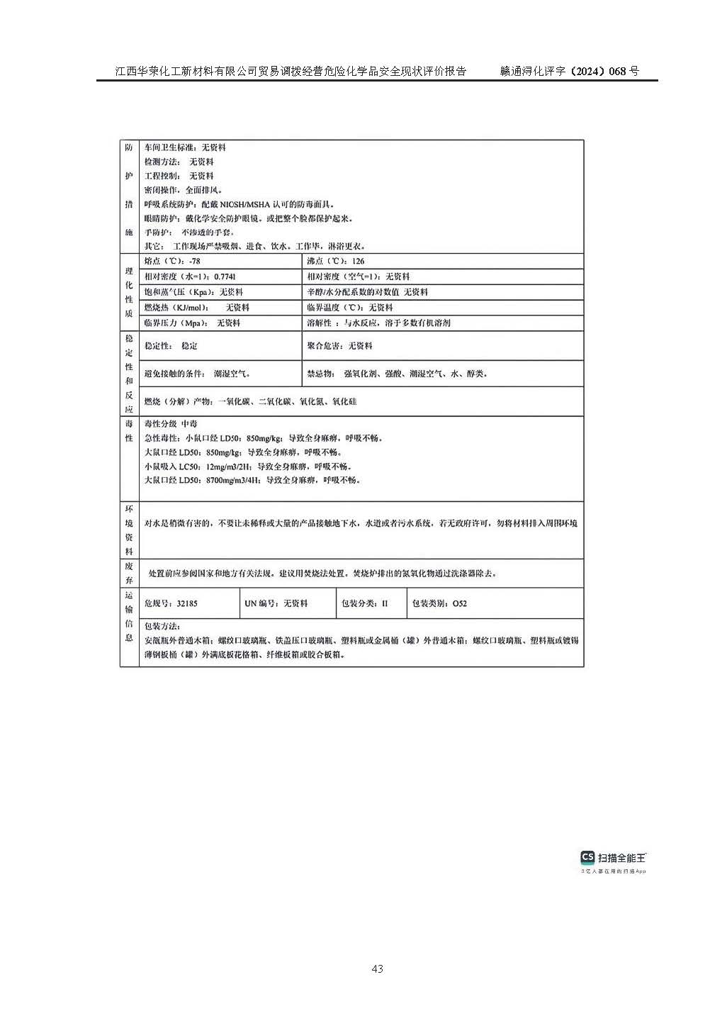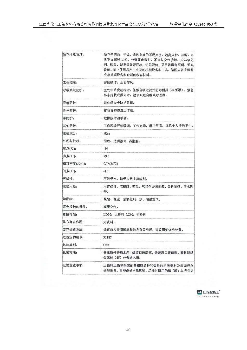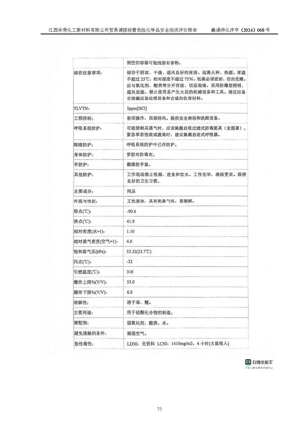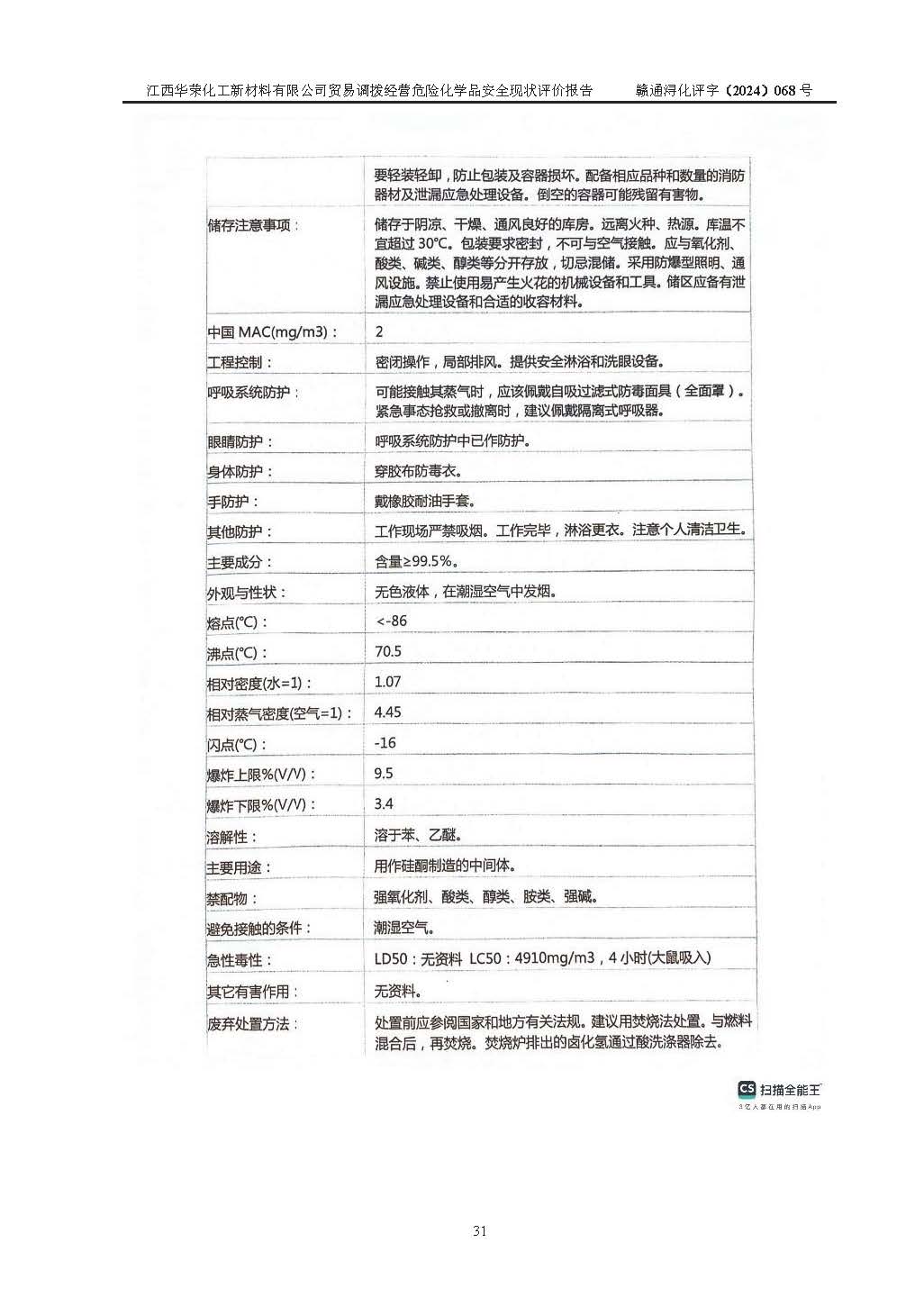 项目简介 | 江西华荣化工新材料有限公司是一家于2015年11月09日注册成立的有限责任公司,企业注册地址与经营场所位于江西省九江市永修县湖东新区开发大道南侧铜锣湾广场总部经济大楼908室,注册资本与实收资本均为200万元人民币。该公司现有员工5人,法定**人王汝华。公司目前经营范围为:许可项目:危险化学品经营(依法须经批准的项目,经相关部门批准后在许可**期内方可开展经营活动,具体经营项目和许可期限以相关部门批准文件或许可证件为准)一般项目:化工产品销售(不含许可类化工产品),橡胶制品销售,建筑材料销售,金属材料销售,货物进出口,信息技术咨询服务(除依法须经批准的项目外,凭营业执照依法自主开展经营活动)。 江西华荣化工新材料有限公司以贸易调拨方式经营危险化学品,品种为:甲基三氯硅烷、二甲基二氯硅烷、**基氯硅烷、四氯化硅、六甲基二硅氧烷、六甲基二硅氮烷、正硅酸乙酯、二甲基硅氧烷混合环体、六甲基环三硅氧烷、八甲基环四硅氧烷、四甲基硅烷、二甲基二乙氧基硅烷、甲基氢二氯硅烷(又称为甲基二氯硅烷,新增)、[闭杯闪点≤60℃](36.有机硅类胶粘剂/54.有机硅树脂)。不涉及危险化学品的运输、储存、店面零售、经营场所样品摆放等问题。企业贸易调拨经营的危险化学品由具有危险化学品经营资质或生产厂家供货,经营的危险化学品的运输委托具有相应资质的单位承担。 根据《危险化学品安全管理条例》(***第645号令修订)、《危险化学品经营许可证管理办法》(**安监总局第55号令,第79号令修改)等法规和文件的要求,《危险化学品经营许可证》申请单位,应提供《安全评价报告》。 江西华荣化工新材料有限公司已向发证部门提出申请,目前正在做申请的准备工作,故委托江西通安安全评价有限公司承担其贸易调拨经营危险化学品安全条件现状评价工作。 江西通安安全评价有限公司接受委托后,组织了评价组;于2024年6月对该公司办公经营场所进行了现场踏勘,查询该公司经营管理模式及规章制度执行情况。依据《安全评价通则》(AQ8001-2007)的要求,评价组完成了风险分析、资料收集、现场勘查和类比调查等前期准备工作。在此基础上,根据企业提供的资料,分析了该企业在贸易调拨经营过程中可能存在的危险、有害因素。选择了相应的安全评价方法逐项进行分析、评价,提出相应的预防和控制对策措施;并与企业安全管理人员进行了沟通后,编制完成了本评价报告,以作为企业申办《危险化学品经营许可证》的安全技术依据。 本次评价范围为江西华荣化工新材料有限公司贸易调拨经营危险化学品过程中的安全条件及安全管理方面的现状。包括经营过程中安全管理的组织、机构、人员及安全管理制度等。该单位不涉及贸易调拨经营危险化学品的运输、储存,其委托危险化学品的道路运输、储存不在本评价范围内。 | ||||||