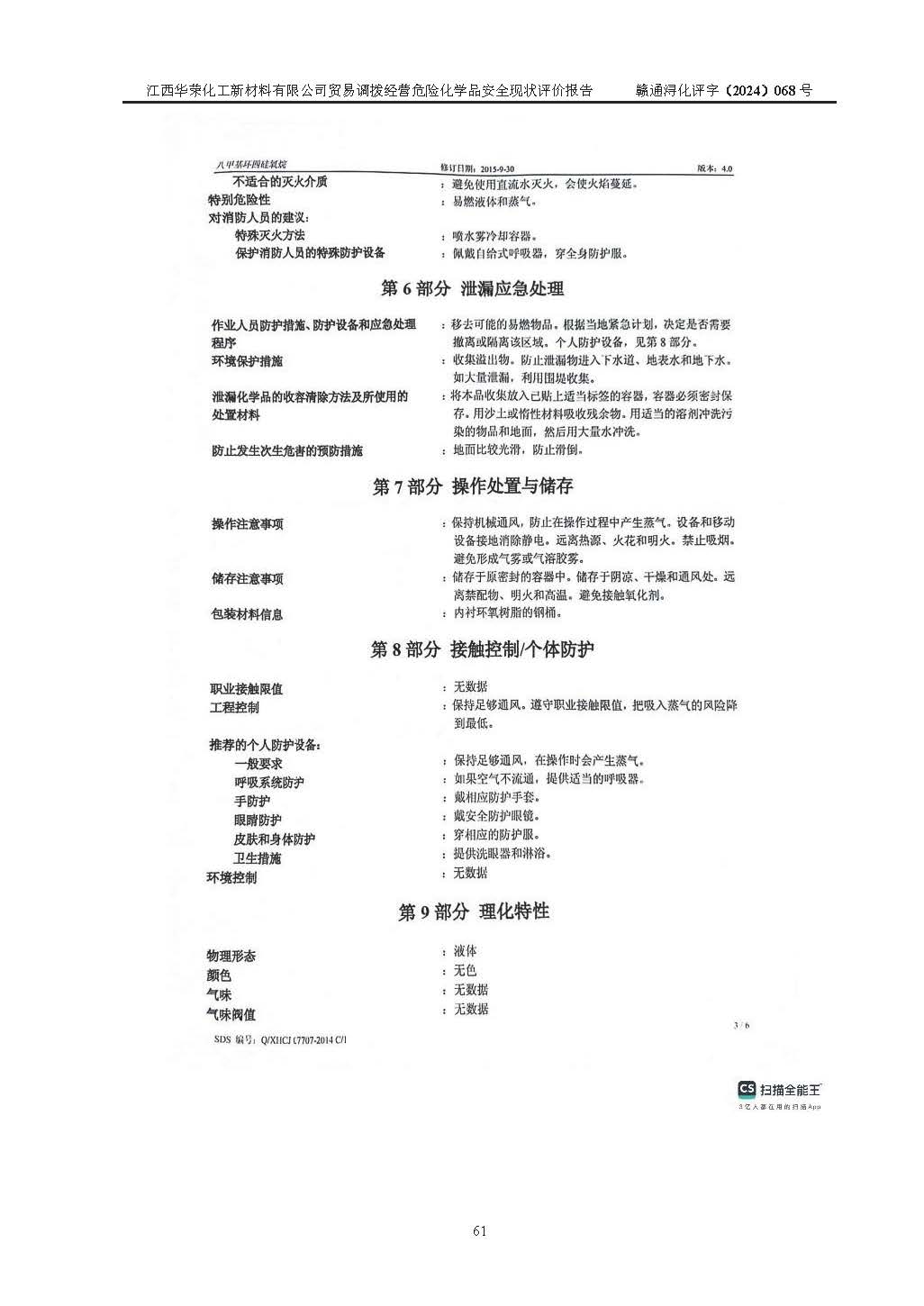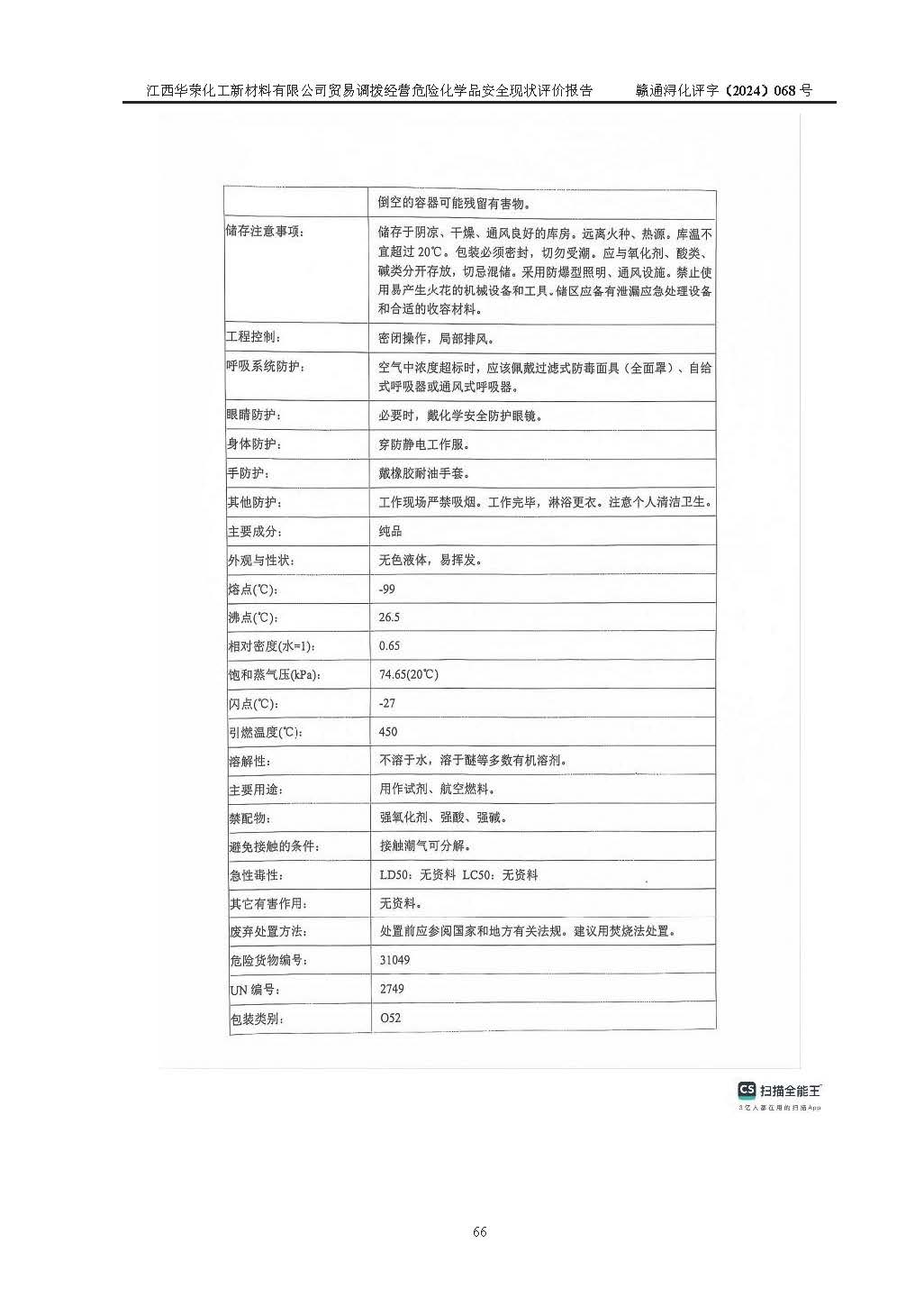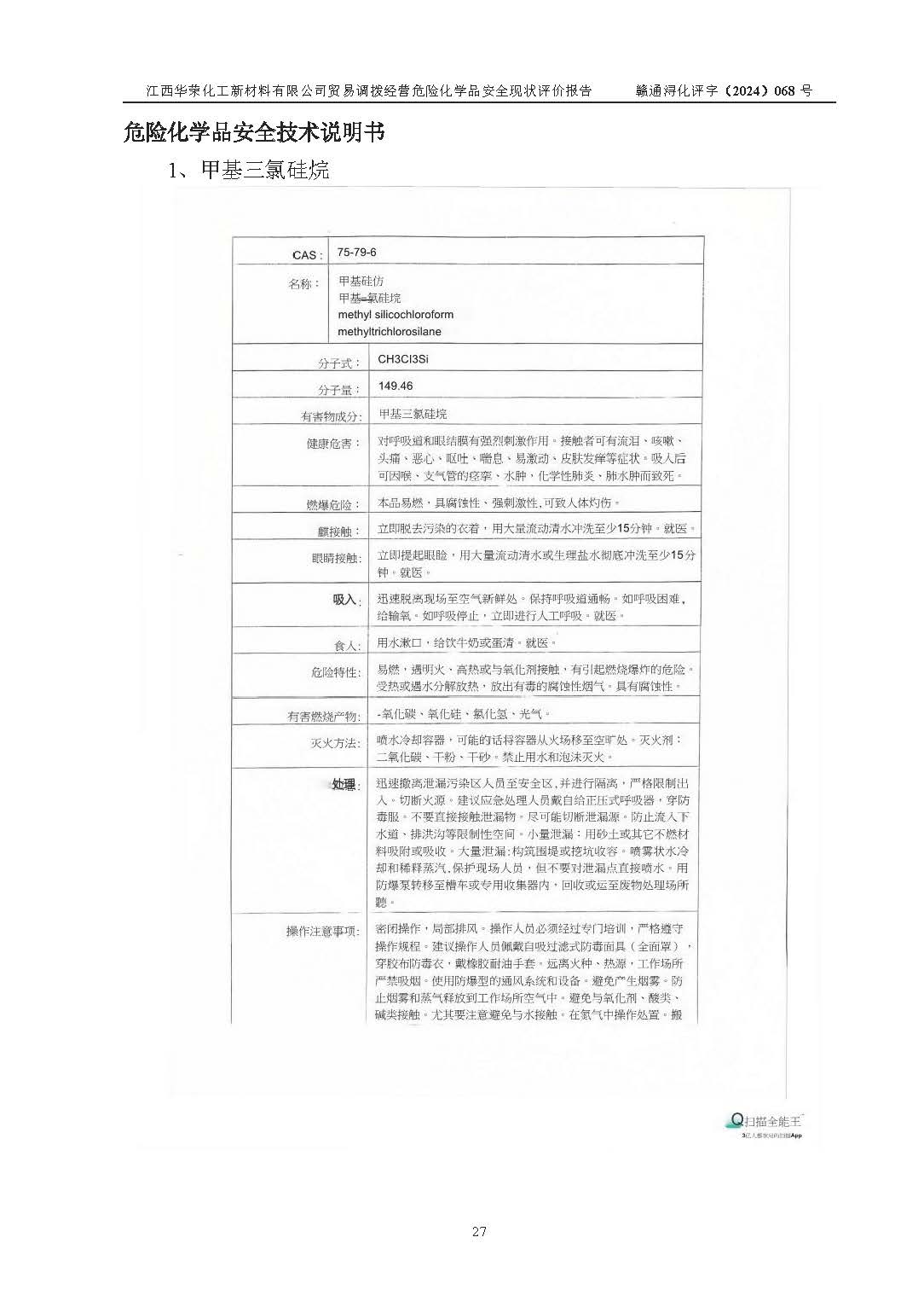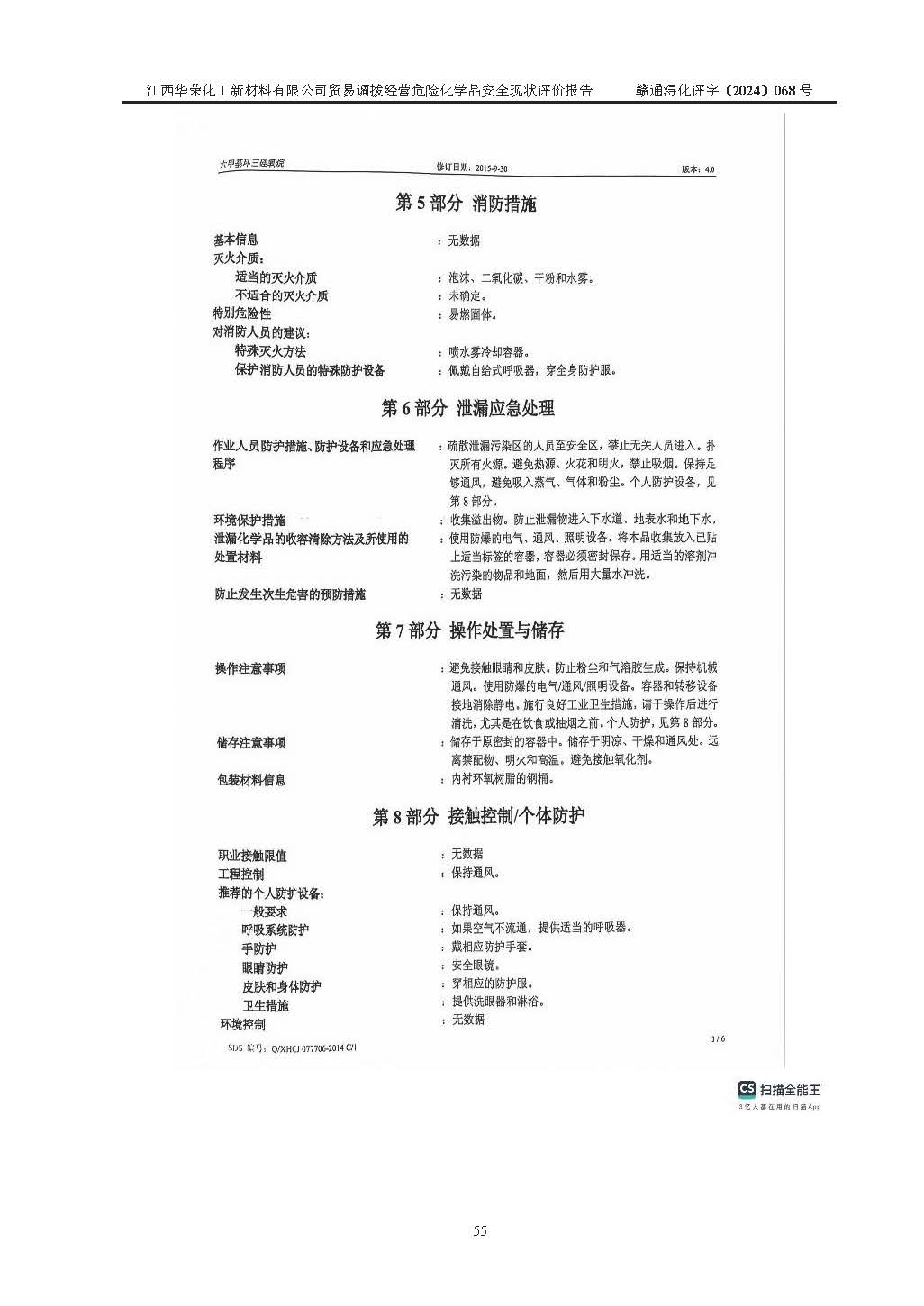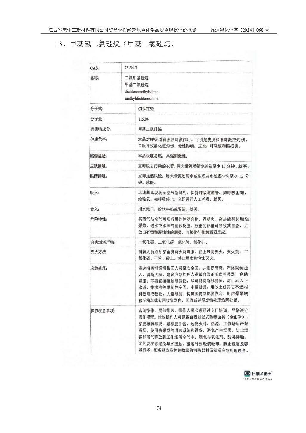 项目简介 | 江西华荣化工新材料有限公司是一家于2015年11月09日注册成立的有限责任公司,企业注册地址与经营场所位于江西省九江市永修县湖东新区开发大道南侧铜锣湾广场总部经济大楼908室,注册资本与实收资本均为200万元人民币。该公司现有员工5人,法定**人王汝华。公司目前经营范围为:许可项目:危险化学品经营(依法须经批准的项目,经相关部门批准后在许可**期内方可开展经营活动,具体经营项目和许可期限以相关部门批准文件或许可证件为准)一般项目:化工产品销售(不含许可类化工产品),橡胶制品销售,建筑材料销售,金属材料销售,货物进出口,信息技术咨询服务(除依法须经批准的项目外,凭营业执照依法自主开展经营活动)。 江西华荣化工新材料有限公司以贸易调拨方式经营危险化学品,品种为:甲基三氯硅烷、二甲基二氯硅烷、**基氯硅烷、四氯化硅、六甲基二硅氧烷、六甲基二硅氮烷、正硅酸乙酯、二甲基硅氧烷混合环体、六甲基环三硅氧烷、八甲基环四硅氧烷、四甲基硅烷、二甲基二乙氧基硅烷、甲基氢二氯硅烷(又称为甲基二氯硅烷,新增)、[闭杯闪点≤60℃](36.有机硅类胶粘剂/54.有机硅树脂)。不涉及危险化学品的运输、储存、店面零售、经营场所样品摆放等问题。企业贸易调拨经营的危险化学品由具有危险化学品经营资质或生产厂家供货,经营的危险化学品的运输委托具有相应资质的单位承担。 根据《危险化学品安全管理条例》(***第645号令修订)、《危险化学品经营许可证管理办法》(**安监总局第55号令,第79号令修改)等法规和文件的要求,《危险化学品经营许可证》申请单位,应提供《安全评价报告》。 江西华荣化工新材料有限公司已向发证部门提出申请,目前正在做申请的准备工作,故委托江西通安安全评价有限公司承担其贸易调拨经营危险化学品安全条件现状评价工作。 江西通安安全评价有限公司接受委托后,组织了评价组;于2024年6月对该公司办公经营场所进行了现场踏勘,查询该公司经营管理模式及规章制度执行情况。依据《安全评价通则》(AQ8001-2007)的要求,评价组完成了风险分析、资料收集、现场勘查和类比调查等前期准备工作。在此基础上,根据企业提供的资料,分析了该企业在贸易调拨经营过程中可能存在的危险、有害因素。选择了相应的安全评价方法逐项进行分析、评价,提出相应的预防和控制对策措施;并与企业安全管理人员进行了沟通后,编制完成了本评价报告,以作为企业申办《危险化学品经营许可证》的安全技术依据。 本次评价范围为江西华荣化工新材料有限公司贸易调拨经营危险化学品过程中的安全条件及安全管理方面的现状。包括经营过程中安全管理的组织、机构、人员及安全管理制度等。该单位不涉及贸易调拨经营危险化学品的运输、储存,其委托危险化学品的道路运输、储存不在本评价范围内。 | ||||||