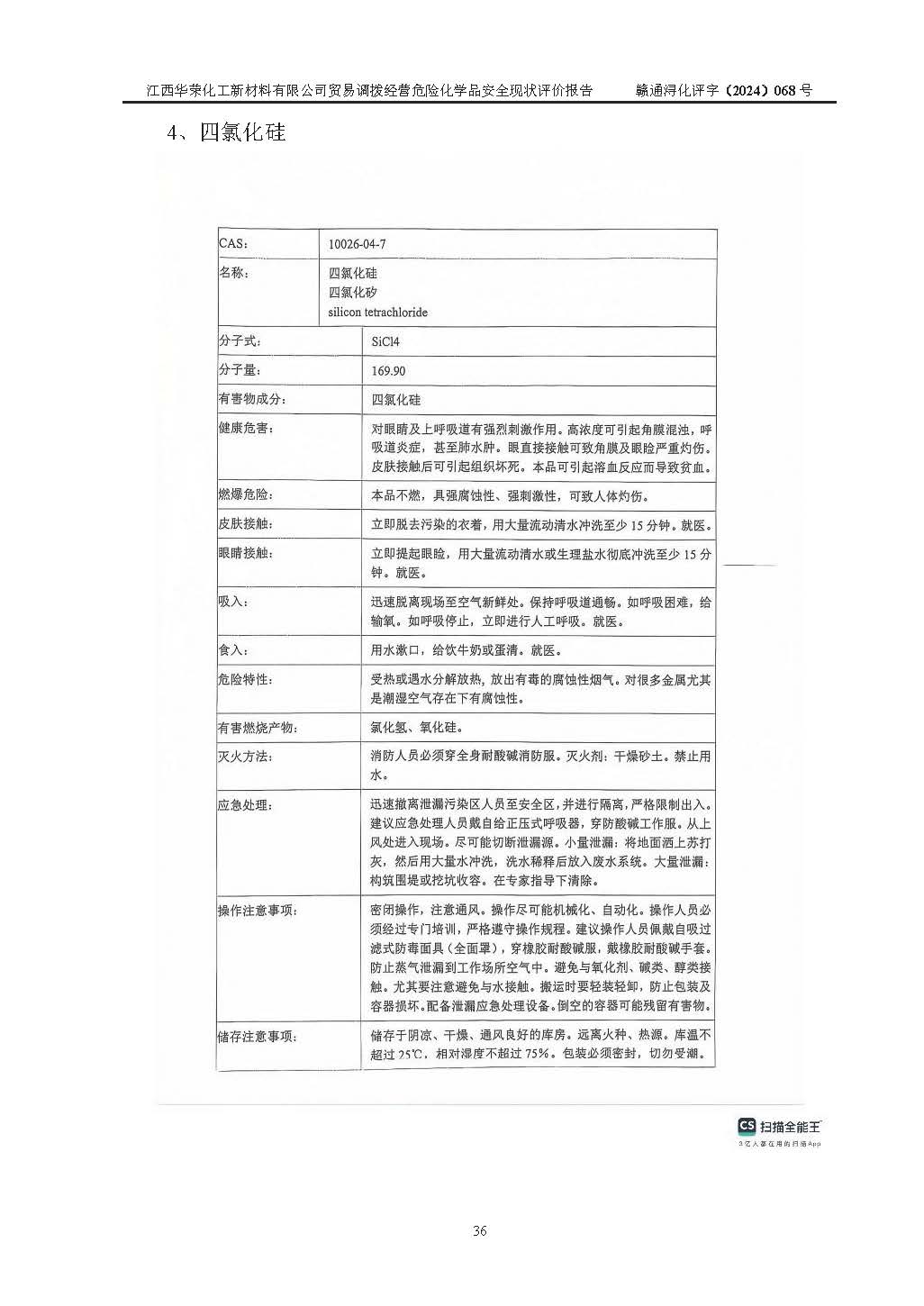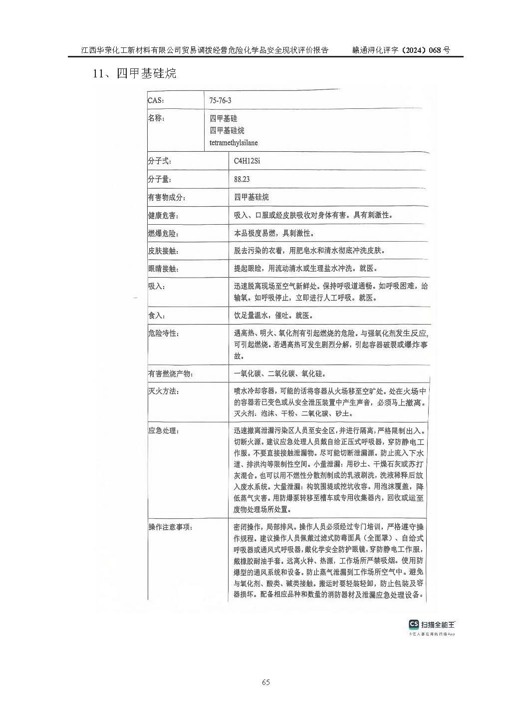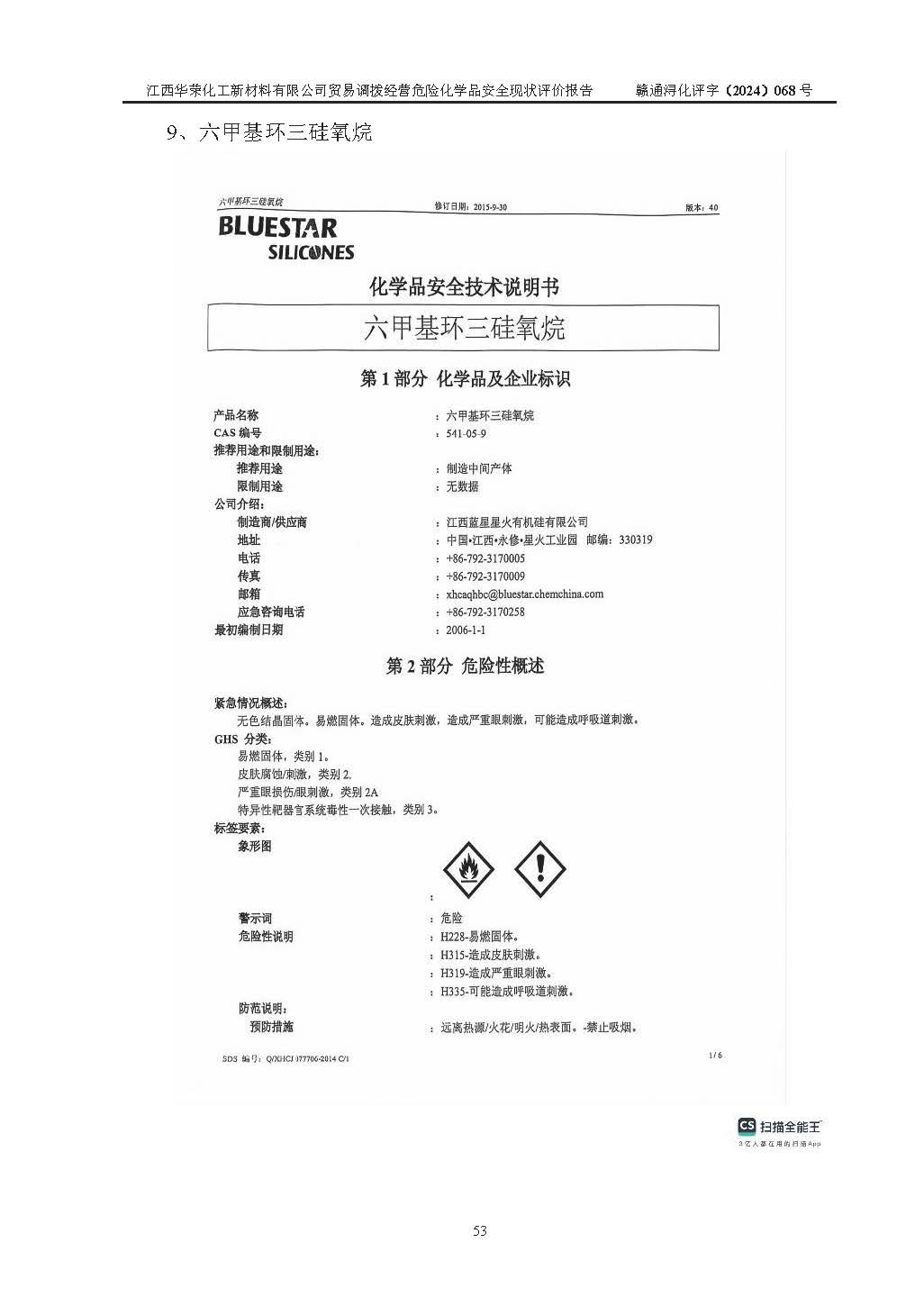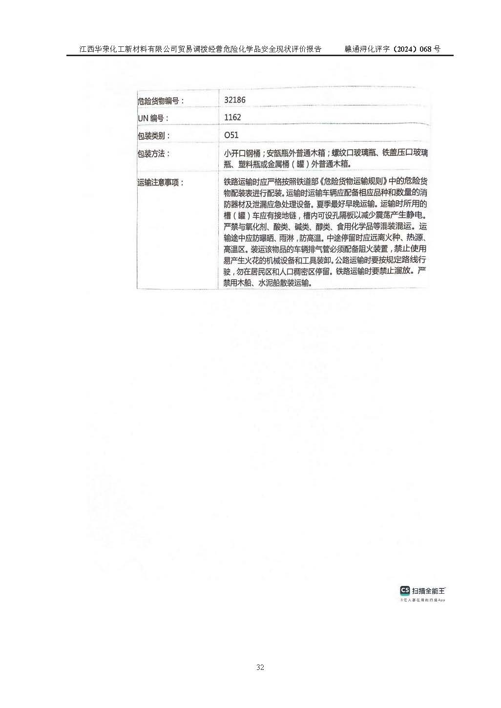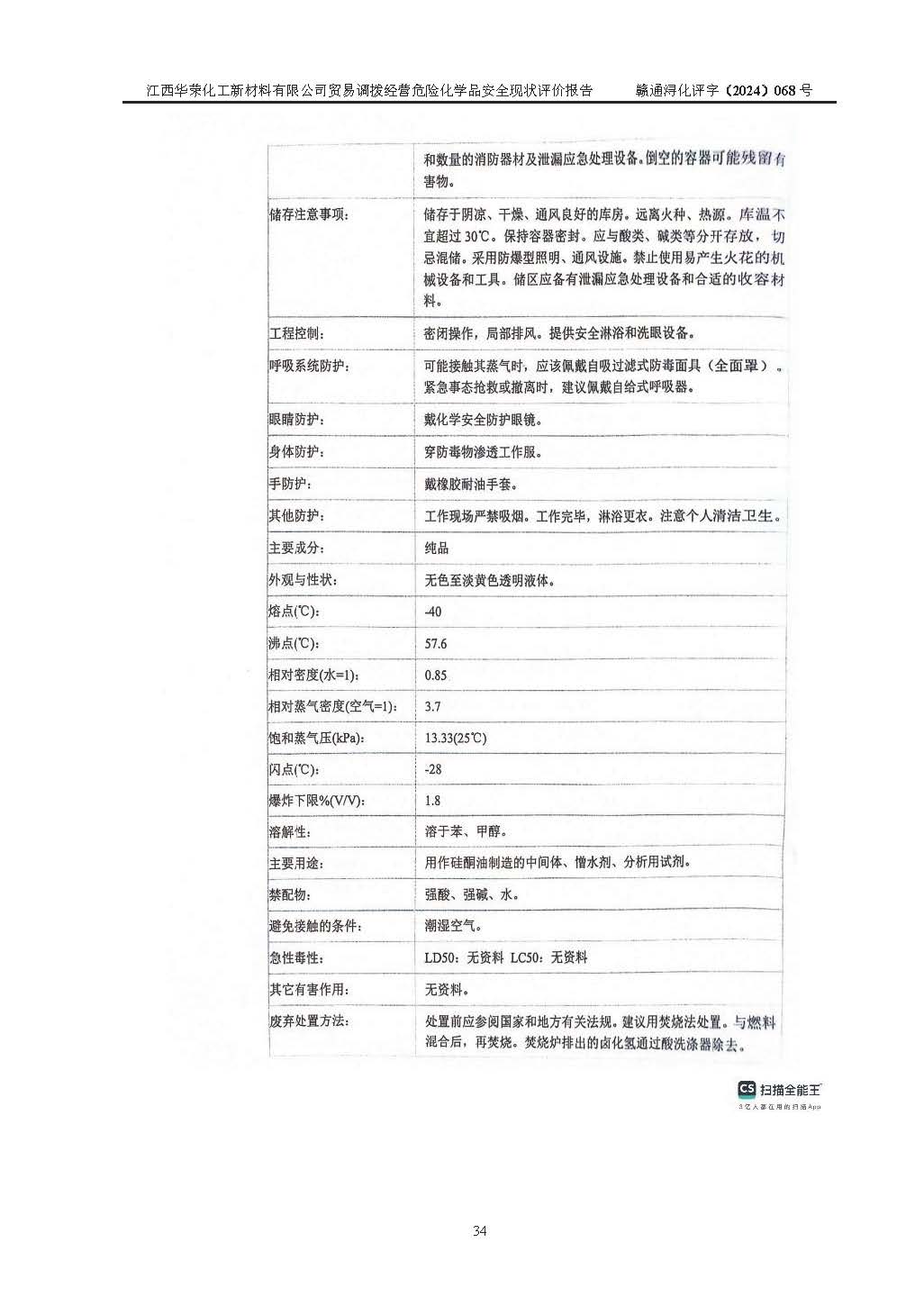 项目简介 | 江西华荣化工新材料有限公司是一家于2015年11月09日注册成立的有限责任公司,企业注册地址与经营场所位于江西省九江市永修县湖东新区开发大道南侧铜锣湾广场总部经济大楼908室,注册资本与实收资本均为200万元人民币。该公司现有员工5人,法定**人王汝华。公司目前经营范围为:许可项目:危险化学品经营(依法须经批准的项目,经相关部门批准后在许可**期内方可开展经营活动,具体经营项目和许可期限以相关部门批准文件或许可证件为准)一般项目:化工产品销售(不含许可类化工产品),橡胶制品销售,建筑材料销售,金属材料销售,货物进出口,信息技术咨询服务(除依法须经批准的项目外,凭营业执照依法自主开展经营活动)。 江西华荣化工新材料有限公司以贸易调拨方式经营危险化学品,品种为:甲基三氯硅烷、二甲基二氯硅烷、**基氯硅烷、四氯化硅、六甲基二硅氧烷、六甲基二硅氮烷、正硅酸乙酯、二甲基硅氧烷混合环体、六甲基环三硅氧烷、八甲基环四硅氧烷、四甲基硅烷、二甲基二乙氧基硅烷、甲基氢二氯硅烷(又称为甲基二氯硅烷,新增)、[闭杯闪点≤60℃](36.有机硅类胶粘剂/54.有机硅树脂)。不涉及危险化学品的运输、储存、店面零售、经营场所样品摆放等问题。企业贸易调拨经营的危险化学品由具有危险化学品经营资质或生产厂家供货,经营的危险化学品的运输委托具有相应资质的单位承担。 根据《危险化学品安全管理条例》(***第645号令修订)、《危险化学品经营许可证管理办法》(**安监总局第55号令,第79号令修改)等法规和文件的要求,《危险化学品经营许可证》申请单位,应提供《安全评价报告》。 江西华荣化工新材料有限公司已向发证部门提出申请,目前正在做申请的准备工作,故委托江西通安安全评价有限公司承担其贸易调拨经营危险化学品安全条件现状评价工作。 江西通安安全评价有限公司接受委托后,组织了评价组;于2024年6月对该公司办公经营场所进行了现场踏勘,查询该公司经营管理模式及规章制度执行情况。依据《安全评价通则》(AQ8001-2007)的要求,评价组完成了风险分析、资料收集、现场勘查和类比调查等前期准备工作。在此基础上,根据企业提供的资料,分析了该企业在贸易调拨经营过程中可能存在的危险、有害因素。选择了相应的安全评价方法逐项进行分析、评价,提出相应的预防和控制对策措施;并与企业安全管理人员进行了沟通后,编制完成了本评价报告,以作为企业申办《危险化学品经营许可证》的安全技术依据。 本次评价范围为江西华荣化工新材料有限公司贸易调拨经营危险化学品过程中的安全条件及安全管理方面的现状。包括经营过程中安全管理的组织、机构、人员及安全管理制度等。该单位不涉及贸易调拨经营危险化学品的运输、储存,其委托危险化学品的道路运输、储存不在本评价范围内。 | ||||||